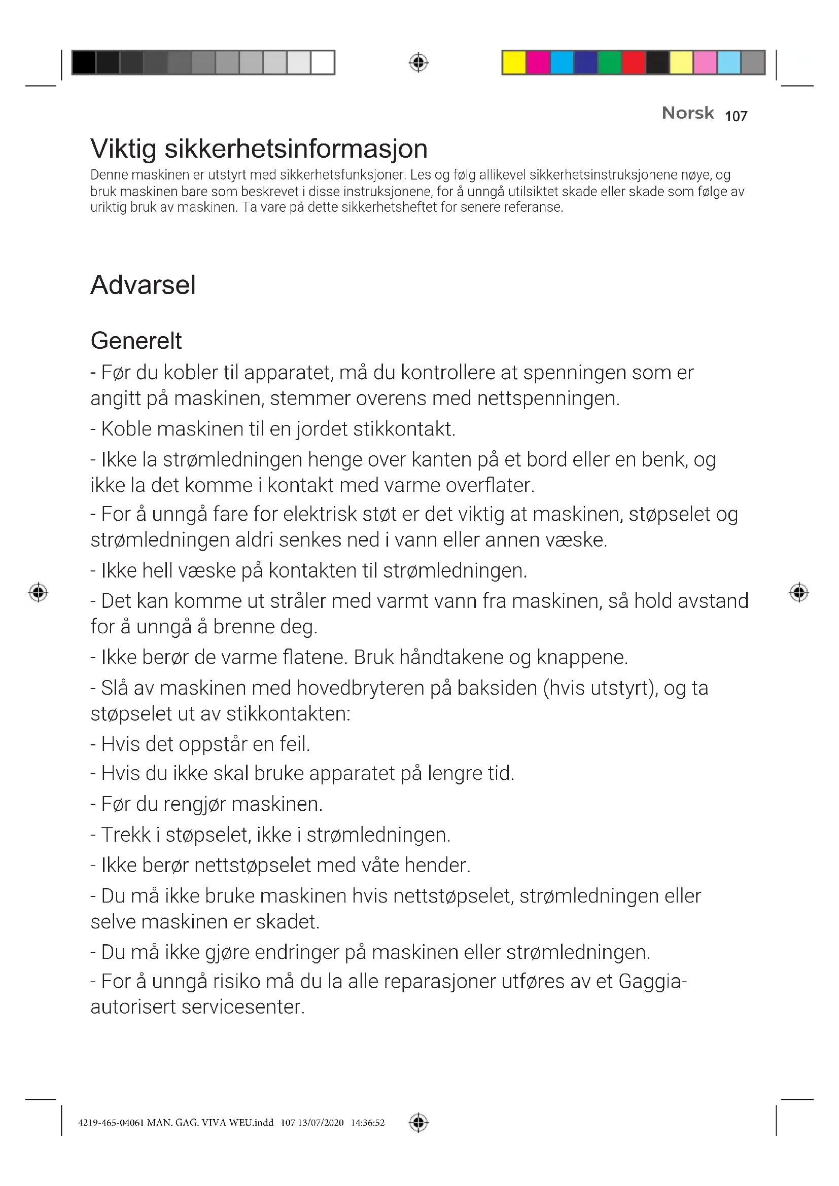 - Maskinen må ikke brukes av barn som er yngre enn 8 år. - Denne maskinen kan brukes av barn over åtte år og av personer med nedsatt sanseevne eller fysisk eller psykisk funksjonsevne, eller personer med manglende erfaring eller kunnskap, dersom de får instruksjoner om sikker bruk av maskinen eller tilsyn som sikrer trygg bruk, og hvis de er klar over risikoen. - Barn skal ikke rengjøre eller vedlikeholde apparatet med mindre de er over 8 år, og har tilsyn. - Hold maskinen og ledningen utilgjengelig for barn under 8 år. - Pass på at barn er under tilsyn, slik at de ikke leker med maskinen. - Vær forsiktig når du tapper varmt vann. Under tapping kan små stråler med varmt vann komme ut. Vent til tappesyklusen er ferdig før du fjerner varmtvannstuten. Forsiktig Generelt - Denne maskinen er bare ment til vanlig husholdningsbruk. Den er ikke ment for bruk i omgivelser som kjøkken for ansatte i butikker, på kontorer, på gårder eller i andre arbeidsmiljøer. - Sett alltid maskinen på et att og stabilt underlag. Maskinen skal alltid stå oppreist, også under transport. - Ikke plasser maskinen på en kokeplate eller ved siden av en varm ovn, et varmeelement eller en lignende varmekilde. - Bruk bare malt kaffe i den trykksatte lterholderen. Hvis du heller kaffebønner, instantkaffe, ubrente kaffebønner eller andre stoffer, vil det kunne føre til skader på maskinen. I så tilfelle vil ikke en eventuell reparasjon dekkes av garantien. - La maskinen kjøles ned før du setter inn eller fjerner deler. Varmeatene kan være varme etter bruk. - Dersom det er til stede, rør aldri vannets avløpsrør under bruk da det kan bli kokende varm. La det først kjøle seg ned. 4219-465-04061 MAN. GAG. VIVA WEU.indd 108 13/07/2020 14:36:52109 Norsk - Ikke fyll vanntanken med varmt eller kullsyreholdig vann – dette kan føre til skader på vanntanken og maskinen. - Bruk aldri skurebørster, skuremidler eller sterke væsker som bensin eller aceton til å rengjøre maskinen. Bruk en myk klut fuktet med vann. - Foreta avkalking av maskinen regelmessig. Hvis du ikke gjør dette, kan det hende at apparatet ikke virker som det skal. I slike tilfeller dekkes ikke reparasjonen av garantien. - Ikke oppbevar maskinen ved temperaturer under 0 °C / 32°F. Vann som er igjen i oppvarmingssystemet, kan fryse og medføre skade. - Ikke la det være vann i vanntanken hvis du ikke skal bruke maskinen på lengre tid. Vannet kan bli forurenset. Bruk friskt vann hver gang du bruker maskinen. - Ikke bruk tilbehør eller deler fra andre produsenter eller som Gaggia ikke spesikt anbefaler. Ved bruk av denne typen tilbehør eller deler blir garantien ugyldig. - Regelmessig rengjøring og vedlikehold forlenger levetiden til maskinen og sikrer optimal kvalitet og kaffesmak. - Maskinen utsettes kontinuerlig for fuktighet, kaffe og kalk. Det er derfor svært viktig å rengjøre og vedlikeholde maskinen med jevne mellomrom slik det beskrives i brukerhåndboken og slik det vises på nettsiden. Manglende rengjøring og vedlikehold kan over tid føre til at maskinen slutter å virke. I slike tilfeller dekkes ikke reparasjonen av garantien. - Ikke rengjør den trykksatte lterholderen i oppvaskmaskinen, og ikke bruk oppvaskmiddel eller rengjøringsmidler til å rengjøre den. Dette kan føre til at den trykksatte lterholderen slutter å fungere, og det kan ha en negativ innvirkning på kaffesmaken. - Ikke bruk klut/håndkle til å tørke bryggeenheten. Dette kan føre til at det samler seg bre inne i bryggeenheten. - Ikke drikk løsningen som skylles ut under avkalkingen. - Ikke ta ut den trykksatte lterholderen mens kaffen føres ut. Under oppvarming av kaffeenheten kan det komme ut dråper med varmt vann. - Ikke bruk maskinen mens den står i et skap. 4219-465-04061 MAN. GAG. VIVA WEU.indd 109 13/07/2020 14:36:52Norsk