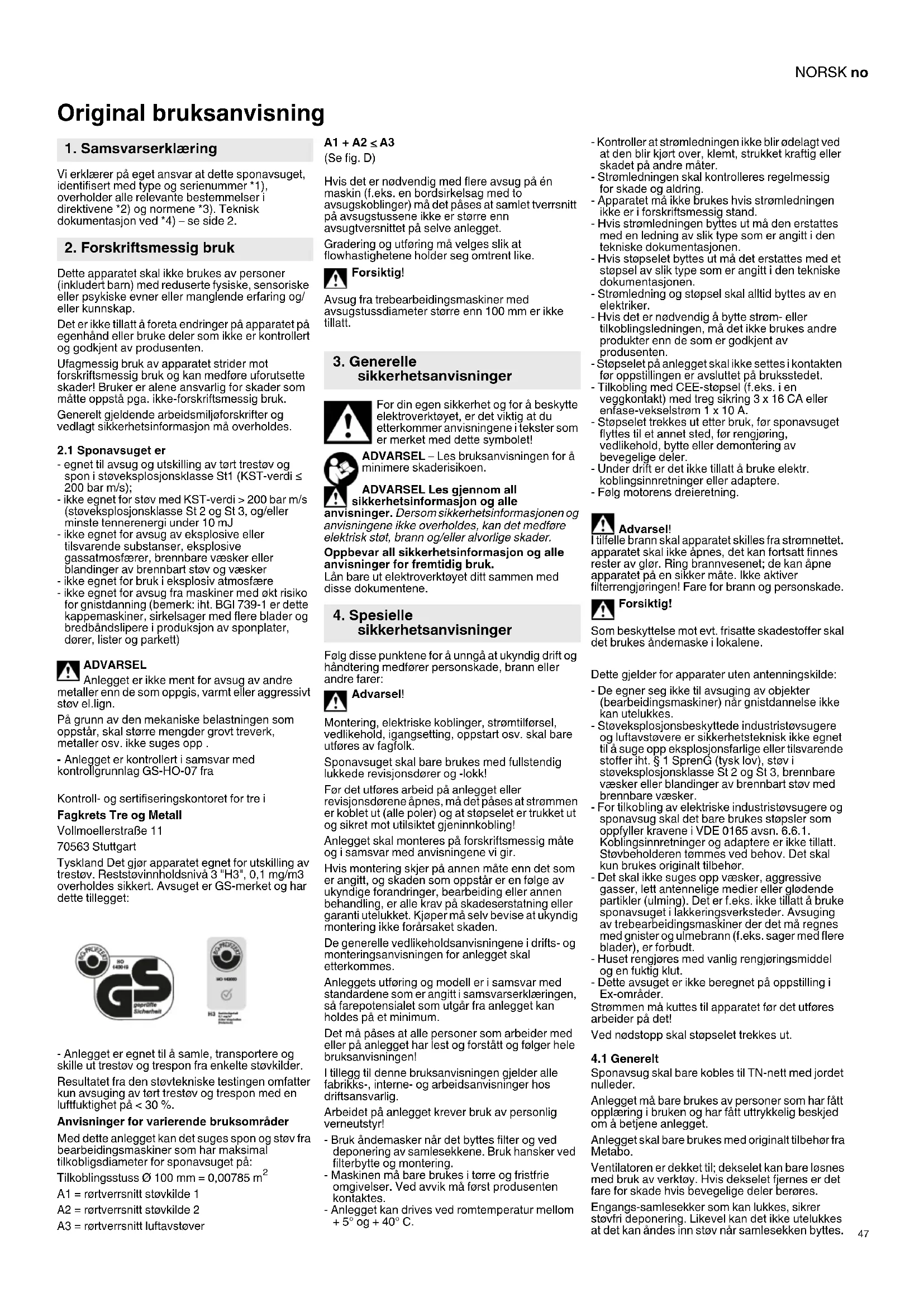 Original bruksanvisning Vi erklærer på eget ansvar at dette sponavsuget, identifisert med type og serienummer *1), overholder alle relevante bestemmelser i direktivene *2) og normene *3). Teknisk dokumentasjon ved *4) – se side 2. Dette apparatet skal ikke brukes av personer (inkludert barn) med reduserte fysiske, sensoriske eller psykiske evner eller manglende erfaring og/ eller kunnskap. Det er ikke tillatt å foreta endringer på apparatet på egenhånd eller bruke deler som ikke er kontrollert og godkjent av produsenten. Ufagmessig bruk av apparatet strider mot forskriftsmessig bruk og kan medføre uforutsette skader! Bruker er alene ansvarlig for skader som måtte oppstå pga. ikke-forskriftsmessig bruk. Generelt gjeldende arbeidsmiljøforskrifter og vedlagt sikkerhetsinformasjon må overholdes.