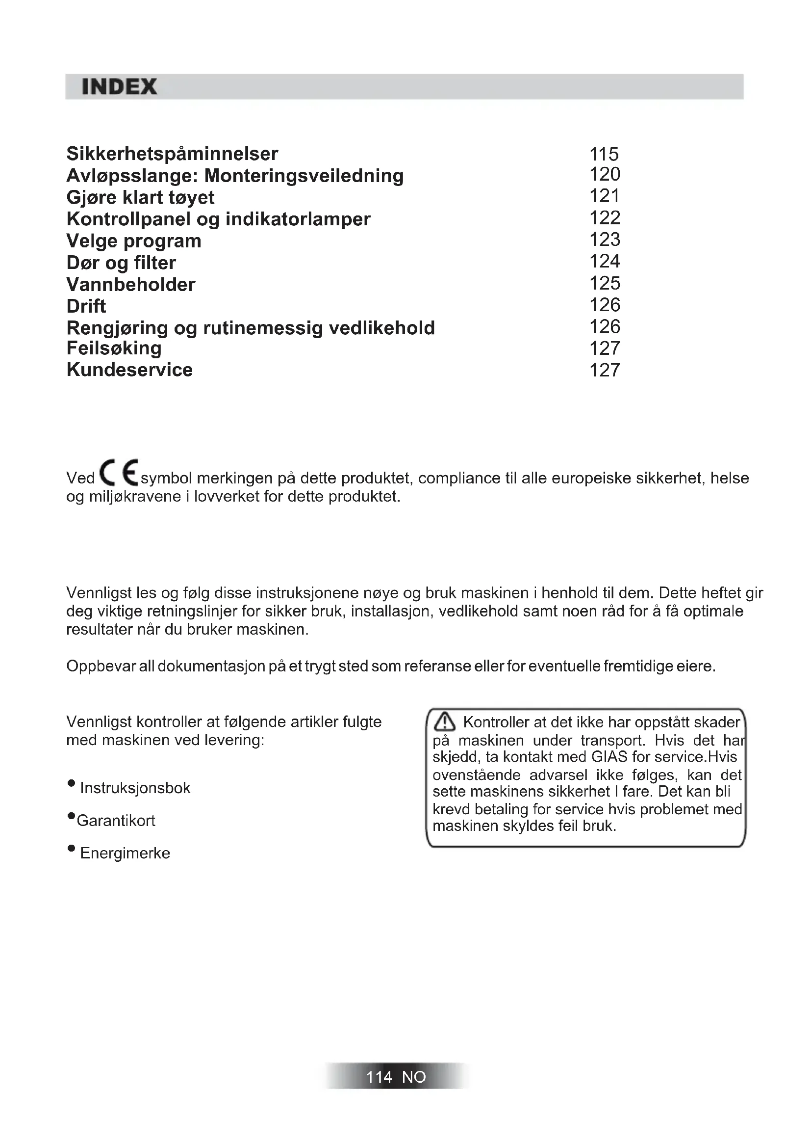 - Energimerke Vennligst les og følg disse instruksjonene nøye og bruk maskinen i henhold til dem. Dette heftet gir deg viktige retningslinjer for sikker bruk, installasjon, vedlikehold samt noen råd for å få optimale resultater når du bruker maskinen. Oppbevar all dokumentasjon på et trygt sted som referanse eller for eventuelle fremtidige eiere. Kontroller at det ikke har oppstått skader på maskinen under transport. Hvis det har skjedd, ta kontakt med GIAS for service.Hvis ovenstående advarsel ikke følges, kan det sette maskinens sikkerhet I fare. Det kan bli krevd betaling for service hvis problemet med maskinen skyldes feil bruk. Sikkerhetspåminnelser Avløpsslange: Monteringsveiledning Gjøre klart tøyet Kontrollpanel og indikatorlamper Velge program Dør og filter Vannbeholder Drift Rengjøring og rutinemessig vedlikehold Feilsøking Kundeservice Ved symbol merkingen på dette produktet, compliance til alle europeiske sikkerhet, helse og miljøkravene i lovverket for dette produktet.