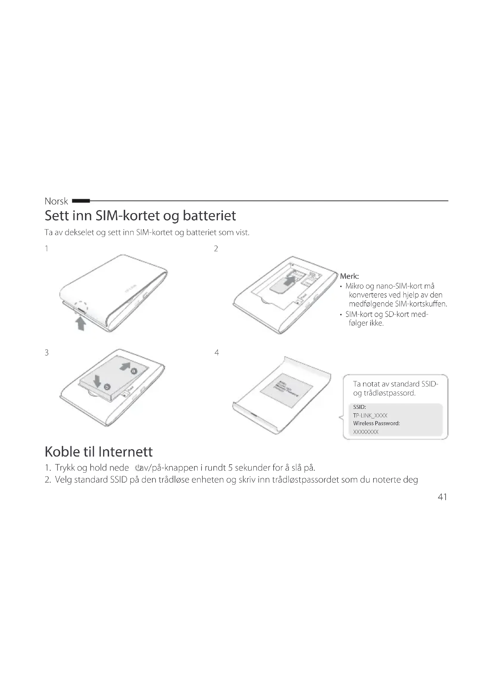 SSID:TP-LINK_XXXXWireless Password:XXXXXXXX42 Norsk tidligere. Merk: Vi anbefaler at du endrer standard trådløstnavn og -passord for å øke nettverkssikkerheten. Nyt i vei! Merk: