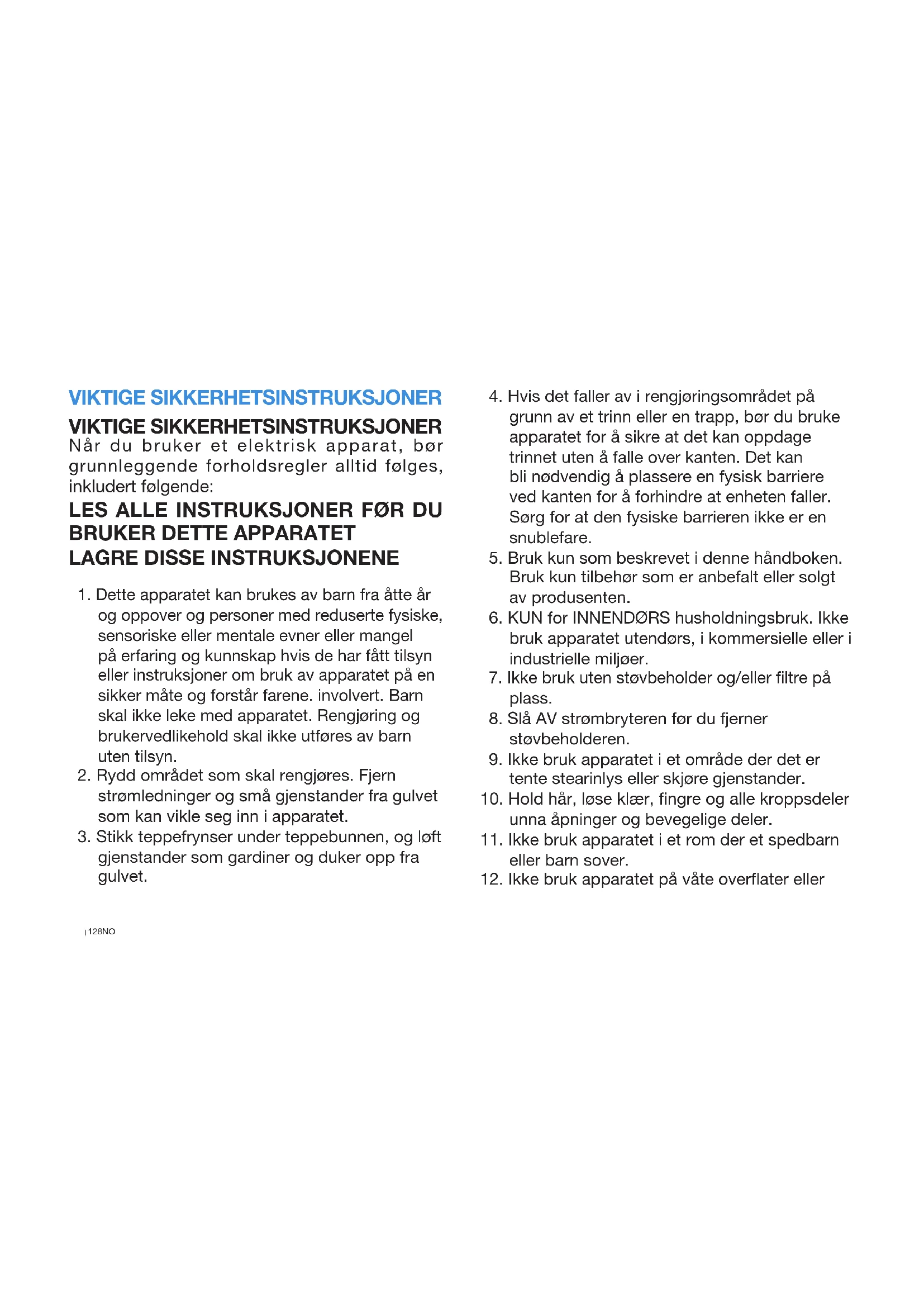 gjenstander som gardiner og duker opp fra gulvet. VIKTIGE SIKKERHETSINSTRUKSJONER VIKTIGE SIKKERHETSINSTRUKSJONER Når du bruker et elektrisk apparat, bør grunnleggende forholdsregler alltid følges, inkludert følgende: