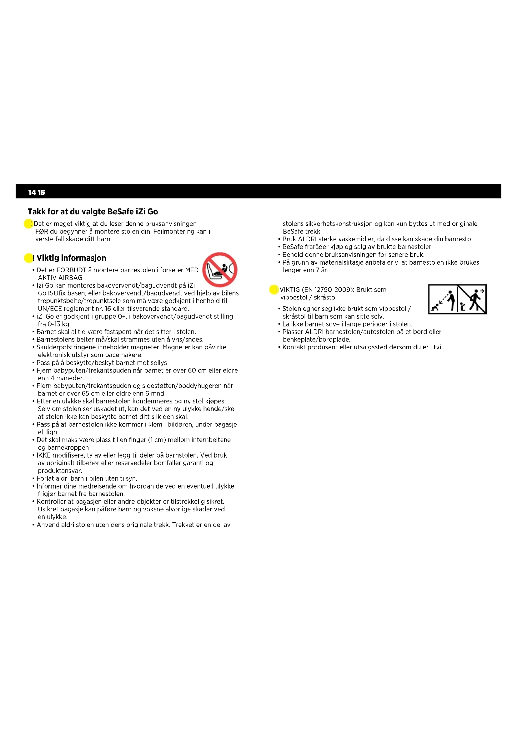 - Anvend aldri stolen uten dens originale trekk. Trekket er en del av Takk for at du valgte BeSafe iZi Go ! Det er meget viktig at du leser denne bruksanvisningen FØR du begynner å montere stolen din. Feilmontering kan i verste fall skade ditt barn. ! VIKTIG (EN 12790-2009): Brukt som vippestol / skråstol stolens sikkerhetskonstruksjon og kan kun byttes ut med originale BeSafe trekk.