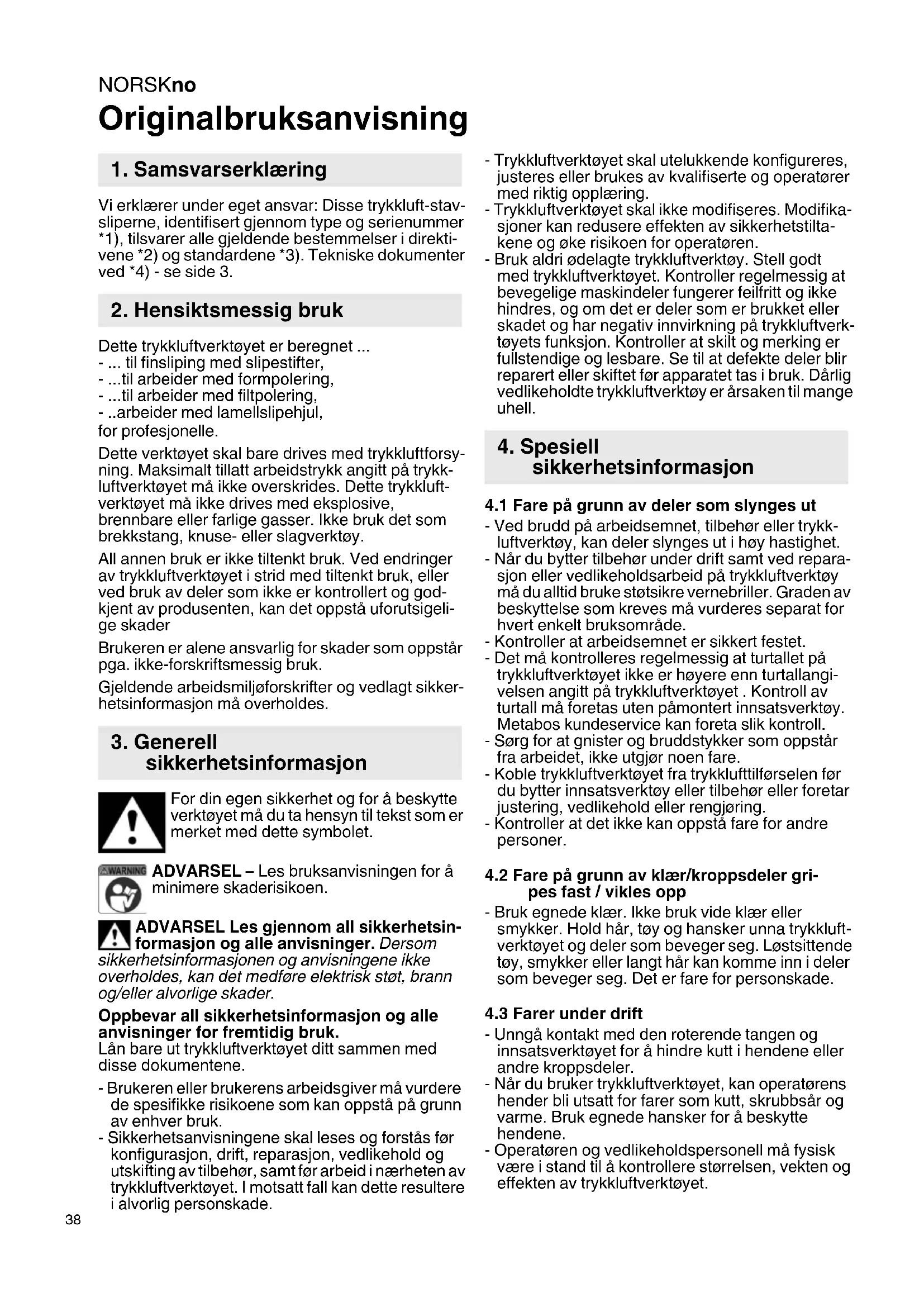 Originalbruksanvisning Vi erklærer under eget ansvar: Disse trykkluft-stav- sliperne, identifisert gjennom type og serienummer *1), tilsvarer alle gjeldende bestemmelser i direkti- vene *2) og standardene *3). Tekniske dokumenter ved *4) - se side 3. Dette trykkluftverktøyet er beregnet ... - ... til finsliping med slipestifter, - ...til arbeider med formpolering, - ...til arbeider med filtpolering, - ..arbeider med lamellslipehjul, for profesjonelle. Dette verktøyet skal bare drives med trykkluftforsy- ning. Maksimalt tillatt arbeidstrykk angitt på trykk- luftverktøyet må ikke overskrides. Dette trykkluft- verktøyet må ikke drives med eksplosive, brennbare eller farlige gasser. Ikke bruk det som brekkstang, knuse- eller slagverktøy. All annen bruk er ikke tiltenkt bruk. Ved endringer av trykkluftverktøyet i strid med tiltenkt bruk, eller ved bruk av deler som ikke er kontrollert og god- kjent av produsenten, kan det oppstå uforutsigeli- ge skader Brukeren er alene ansvarlig for skader som oppstår pga. ikke-forskriftsmessig bruk. Gjeldende arbeidsmiljøforskrifter og vedlagt sikker- hetsinformasjon må overholdes. For din egen sikkerhet og for å beskytte verktøyet må du ta hensyn til tekst som er merket med dette symbolet. ADVARSEL – Les bruksanvisningen for å minimere skaderisikoen. ADVARSEL Les gjennom all sikkerhetsin- formasjon og alle anvisninger. Dersom sikkerhetsinformasjonen og anvisningene ikke overholdes, kan det medføre elektrisk støt, brann og/eller alvorlige skader. Oppbevar all sikkerhetsinformasjon og alle anvisninger for fremtidig bruk. Lån bare ut trykkluftverktøyet ditt sammen med disse dokumentene. - Brukeren eller brukerens arbeidsgiver må vurdere de spesifikke risikoene som kan oppstå på grunn av enhver bruk. - Sikkerhetsanvisningene skal leses og forstås før konfigurasjon, drift, reparasjon, vedlikehold og utskifting av tilbehør, samt før arbeid i nærheten av trykkluftverktøyet. I motsatt fall kan dette resultere i alvorlig personskade. - Trykkluftverktøyet skal utelukkende konfigureres, justeres eller brukes av kvalifiserte og operatører med riktig opplæring. - Trykkluftverktøyet skal ikke modifiseres. Modifika- sjoner kan redusere effekten av sikkerhetstilta- kene og øke risikoen for operatøren. - Bruk aldri ødelagte trykkluftverktøy. Stell godt med trykkluftverktøyet. Kontroller regelmessig at bevegelige maskindeler fungerer feilfritt og ikke hindres, og om det er deler som er brukket eller skadet og har negativ innvirkning på trykkluftverk- tøyets funksjon. Kontroller at skilt og merking er fullstendige og lesbare. Se til at defekte deler blir reparert eller skiftet før apparatet tas i bruk. Dårlig vedlikeholdte trykkluftverktøy er årsaken til mange uhell.