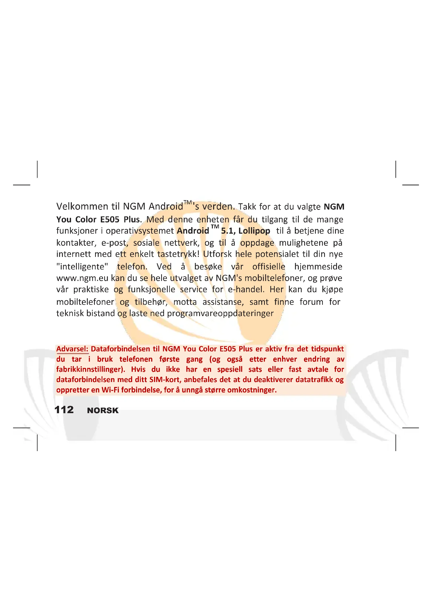 5.0, Lollipop introduserer nye funksjoner. I Innstillinger > Lyd og varsler > Avbrudd er det mulig å velge å ikke motta varslinger på bestemte dager og tidspunkt. Du kan sette inn tre ulike modus: Ikke avbryte: blir mottatt alle varslinger Tillat bare prioriterte avbrudd: mottar kun prioriterte varslinger, valgbare i følgende meny (hendelser og påminnelser, anrop eller meldinger. Varslene er alltid regnet som prioriterte avbrudd) Avbryt alltid: ingen varslinger mottas, ikke engang prioriterte, på fastsatte dager og tider Etter å ha fastsatt prioriterte varslinger, hvorfra du uansett vil motta varslinger, kan du angi et tidsrom hvor du ikke mottar varslinger som ikke anses som prioriterte. Ved aktivering av avbrytelser vises en stjerne på varsellinjen. I Innstillinger > Lyd og varslinger > Varslinger er det mulig å blokkere mottak av varslinger fra spesifikke applikasjoner som er valgbare i menyen Programvarsler.123 NORSK Sende og lese SMS og MMS Lese SMS og MMS: når du mottar en SMS eller MMS, vises et ikon i varselpanelet. Hvis du klikker på ikonet, er det mulig å gå direkte inn og lese den mottatte meldingen. Innkommende meldinger kan ses både på Startskjermen og på menyen ved å velge Meldinger. Sende SMS og MMS: fra Startsiden eller Hovedmenyen velger du Meldinger og deretter ikonet øverst. Skriv inn de første bokstavene i et navn i mottakerfeltet for å søke en kontakt og velg denne fra pop-up lenken, eller skriv inn nummeret til mottaker direkte, alternativt velg ved feltet og finn mottaker/e. Skriv inn teksten med det virtuelle tastaturet. Velg “+” for å inkludere multimedievedlegg (meldingen blir konvertert til MMS) og trykk . TILKOBLING: for å utnytte bedre potensialet til terminalen og operativsystemet er det nødvendig å ha en aktiv dataforbindelse; Dataforbindelsen til NGM You Color E505 Plus er aktiv fra det øyeblikk du første gang slår på telefonen. Hvis det ikke er oppgitt annet i abonnementet, medfører datatrafikken kostnader; vi anbefaler derfor å konfigurere Internettilgangen via WiFi. For å aktivere datatrafikk på et av SIM-kortene bruk knappen for hurtiginnstillinger i varslingspanelet.124 NORSK Opprette Internettforbindelse via WiFi®: du kan koble til WLAN-nettverk ved å bruke WiFi- funksjonen. For å aktivere den fra hovedmenyen velg Innstillinger > WiFi I/O. Ta hensyn til alle advarsler og retningslinjer fra autorisert personell når du befinner deg i områder der bruk av trådløse enheter er begrenset (fly, sykehus, o.l.). Bruk avslått modus når du bruker tjenester som ikke krever nettilgang. Koble til enheten Bluetooth®: slå på Bluetooth-enheten du vil koble til. Se dokumentasjonen for enheten. Velg fra hovedmenyen Innstillinger > Bluetooth på/av for å aktivere Bluetooth. På Tilpasningsmenyen finner du flere funksjoner. Velg Søk for å starte automatisk søk etter Bluetooth-enheter. Blant de oppdagede enheter, velger du navnet på enheten som skal kobles til. Telefonen vil prøve å koble på enheten, eventuelt blir det bedt om å oppgi en kode. Koble til Internett: fra hovedmenyen velges Nettleser. Tast inn nettadressen URL i adressefeltet for å starte å navigere. Hvis du velger å navigere med dataforbindelse på telefonnettet, undersøk kostnader eller velg et abonnement med med fast pris på dataflyt med din operatør. Et alternativ er å bruke WiFi forbindelsen (se punkt om “Tilkobling”). Konfigurering av Gmail-konto: f or bedre å utnytte mulighetene i systemet Android