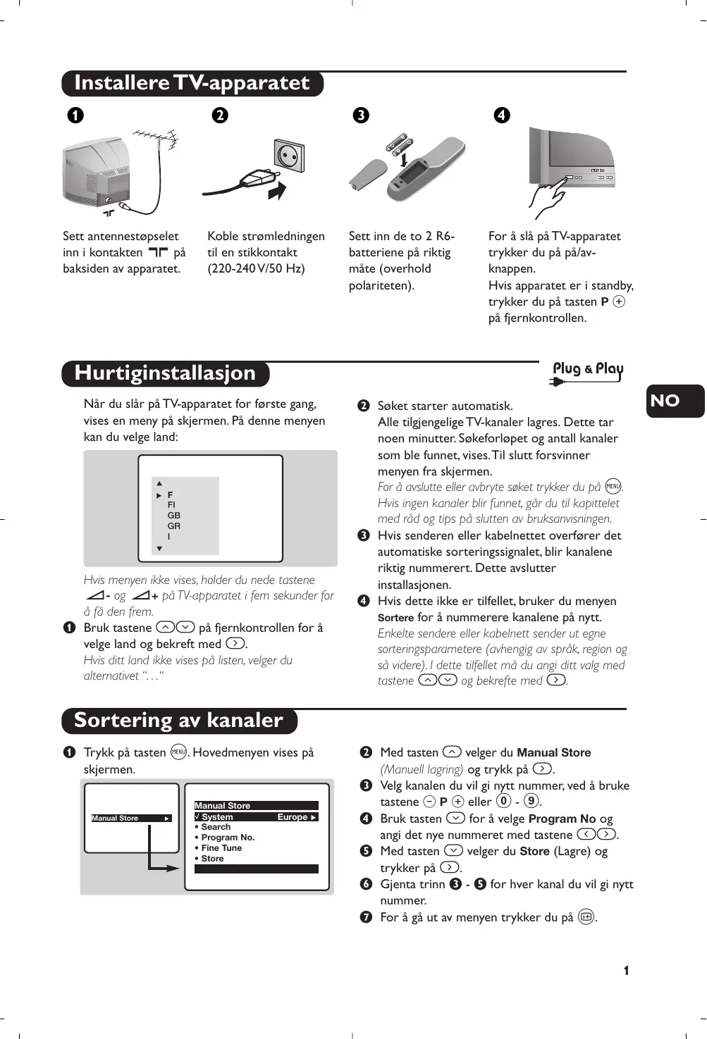 Hvis menyen ikke vises, holder du nede tastene ”- og ”+ på TV-apparatet i fem sekunder for å få den frem. & Bruk tastene îÏ på fjernkontrollen for å velge land og bekreft med ¬. Hvis ditt land ikke vises på listen, velger du alternativet “. . .“ é Søket starter automatisk. Alle tilgjengelige TV-kanaler lagres. Dette tar noen minutter. Søkeforløpet og antall kanaler som ble funnet, vises.Til slutt forsvinner menyen fra skjermen. For å avslutte eller avbryte søket trykker du på H. Hvis ingen kanaler blir funnet, går du til kapittelet med råd og tips på slutten av bruksanvisningen. “ Hvis senderen eller kabelnettet overfører det automatiske sorteringssignalet, blir kanalene riktig nummerert. Dette avslutter installasjonen. ‘ Hvis dette ikke er tilfellet, bruker du menyen Sortere for å nummerere kanalene på nytt. Enkelte sendere eller kabelnett sender ut egne sorteringsparametere (avhengig av språk, region og så videre). I dette tilfellet må du angi ditt valg med tastene îÏ og bekrefte med ¬. Sortering av kanaler & Trykk på tasten H. Hovedmenyen vises på skjermen. Manual Store