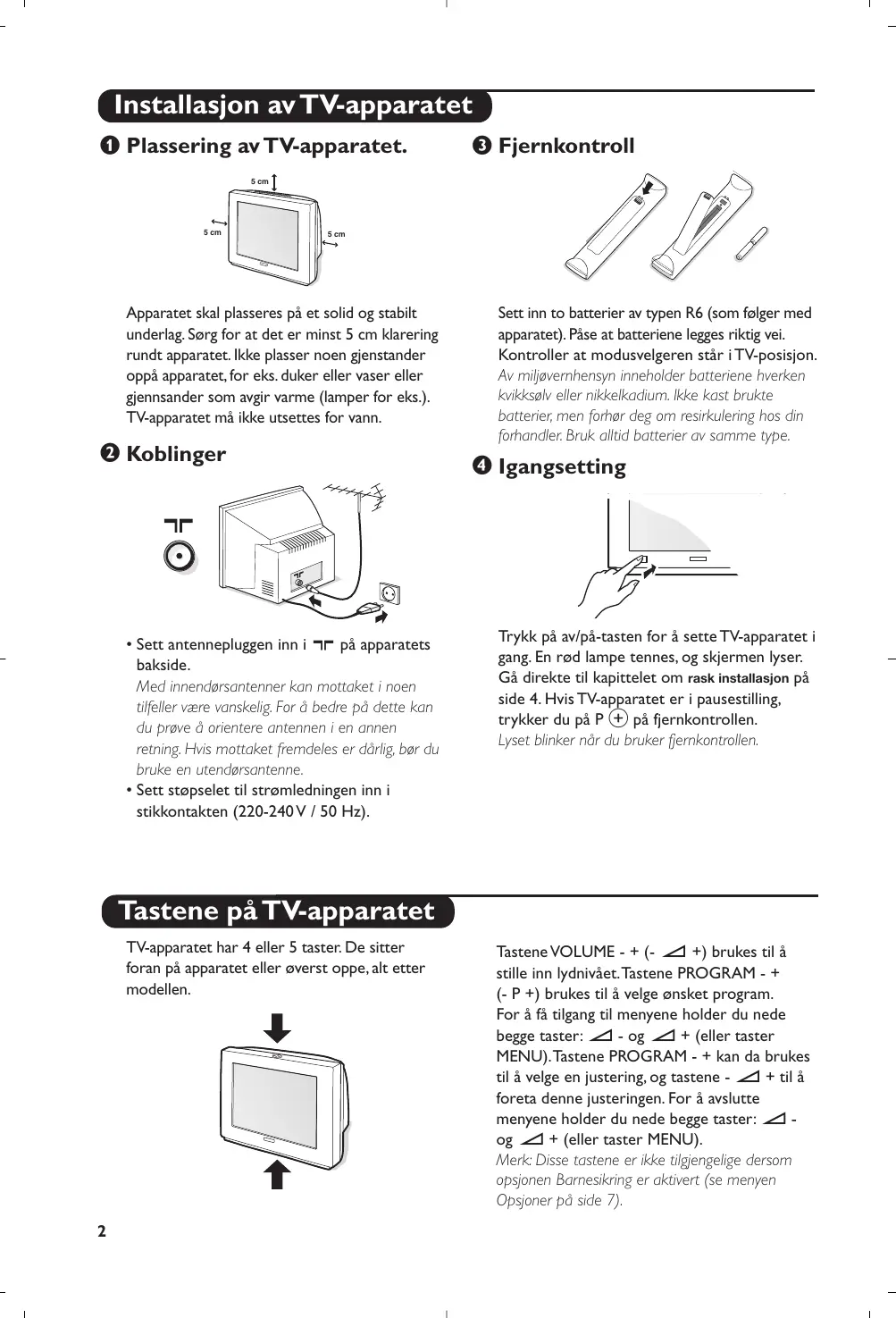 - Sett støpselet til strømledningen inn i stikkontakten (220-240 V / 50 Hz). Sett inn to batterier av typen R6 (som følger med apparatet). Påse at batteriene legges riktig vei. Kontroller at modusvelgeren står i TV-posisjon. Av miljøvernhensyn inneholder batteriene hverken kvikksølv eller nikkelkadium. Ikke kast brukte batterier, men forhør deg om resirkulering hos din forhandler. Bruk alltid batterier av samme type. ‘ Igangsetting Trykk på av/på-tasten for å sette TV-apparatet i gang. En rød lampe tennes, og skjermen lyser. Gå direkte til kapittelet om rask installasjon på side 4. Hvis TV-apparatet er i pausestilling, trykker du på P # på fjernkontrollen. Lyset blinker når du bruker fjernkontrollen. Tastene på TV-apparatet TV-apparatet har 4 eller 5 taster. De sitter foran på apparatet eller øverst oppe, alt etter modellen.