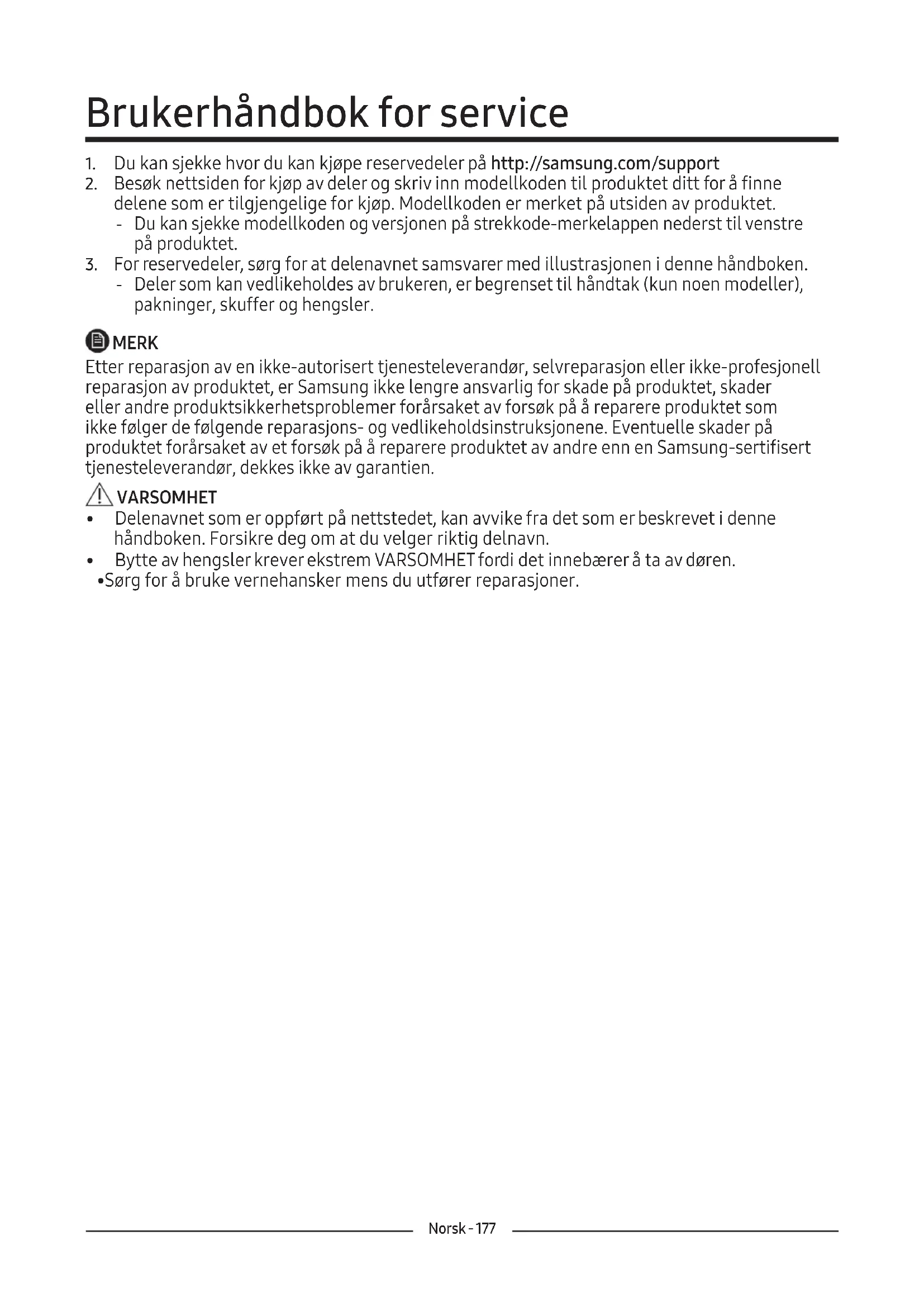 ‐ Deler som kan vedlikeholdes av brukeren, er begrenset til håndtak (kun noen modeller), pakninger, skuffer og hengsler. MERK Etter reparasjon av en ikke-autorisert tjenesteleverandør, selvreparasjon eller ikke-profesjonell reparasjon av produktet, er Samsung ikke lengre ansvarlig for skade på produktet, skader eller andre produktsikkerhetsproblemer forårsaket av forsøk på å reparere produktet som ikke følger de følgende reparasjons- og vedlikeholdsinstruksjonene. Eventuelle skader på produktet forårsaket av et forsøk på å reparere produktet av andre enn en Samsung-sertifisert tjenesteleverandør, dekkes ikke av garantien. VARSOMHET