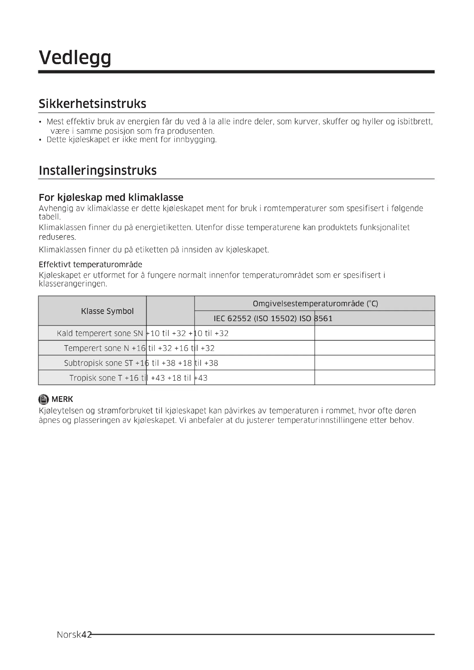 Kald temperert sone SN +10 til +32 +10 til +32 Temperert sone N +16 til +32 +16 til +32 Subtropisk sone ST +16 til +38 +18 til +38 Tropisk sone T +16 til +43 +18 til +43 MERK Kjøleytelsen og strømforbruket til kjøleskapet kan påvirkes av temperaturen i rommet, hvor ofte døren åpnes og plasseringen av kjøleskapet. Vi anbefaler at du justerer temperaturinnstillingene etter behov.Norsk 43 Instruksjoner om temperatur Anbefalt temperatur Den optimale temperaturinnstillingen for matoppbevaring:
