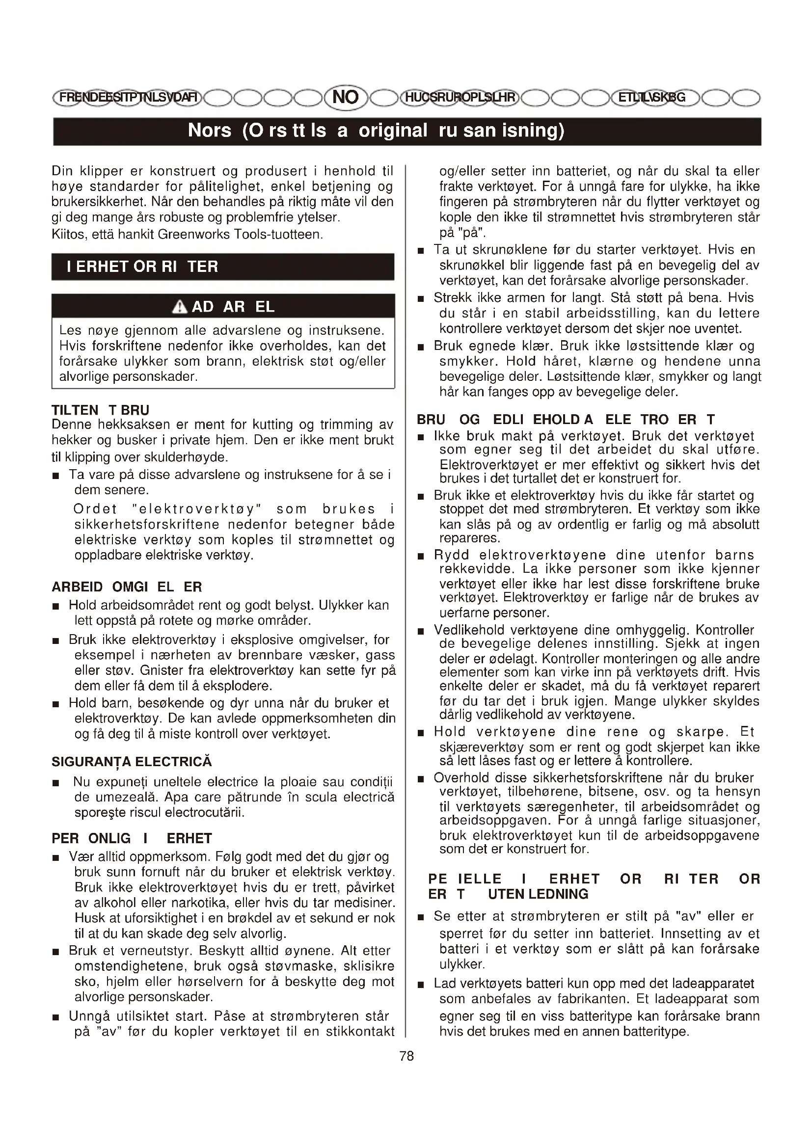 ■ Bruk ikke hekksaksen hvis det fremre håndtaket ikke er på plass. Hold verktøyet med begge hender når du bruker det. ■ For å unngå faren for utilsiktet start, må du ikke flytte på verktøyet når du har fingeren på strømbryteren. ■ Vær oppmerksom. Følg godt med det du gjør og bruk sunn fornuft. ■ Bruk tykke langbukser, sklisikre sikkerhetssko og hansker. Bruk ikke shorts, sandaler og vær ikke barbent når du bruker hekksaksen. ■ Bruk ikke verktøyet i et område med dårlig belysning. Påse at arbeidsområdet har god belysning (dagslys eller kunstig lys). ■ Stå alltid støtt og bruk ikke verktøyet på et ustabilt underlag. Stå støtt på bena og strekk ikke armen for langt. Bruk ikke verktøyet når du står på en stige. ■ Ikke bruk makt på verktøyet ditt. Verktøyet er mer effektivt og sikkert hvis det brukes i det turtallet det er konstruert for. ■ Slipp strømbryteren, vent til motoren har stoppet helt og ta batteriet ut før du gjør rent verktøyet, reparerer det eller foretar innstillinger. ■ Denne hekksaksen skal bare brukes til å beskjære hekker, busker og kratt. Bruk ikke verktøyet til andre formål. ■ Før du starter verktøyet, må du påse ar bladet ikke kan komme bort i hindringer. ■ Hvis hekksaksen kommer bort i noe eller hvis en gjenstand setter seg fast i bladet, stopp verktøyet øyeblikkelig, ta ut batteriet og se etter at ingen deler er skadet. Bruk ikke verktøyet før du har foretatt de nødvendige reparasjonene. Bruk ikke verktøyet hvis deler ikke er riktig festet eller hvis de er skadet. ■ Følg godt med det du gjør. Bruk sunn fornuft.■ Vedlikehold hekksaksen omhyggelig. Påse at bladet er rent og godt skjerpet så hekksaksen kan yte sitt beste og brukes i sikre forhold. Smør og skift ut tilbehørsdelene ifølge instruksene. Pass på at håndtakene alltid er tørre og rene, fri for olje- eller fettrester. ■ Se etter at ingen deler er skadet. Før du fortsetter å bruke verktøyet, sjekk at en skadet del eller et skadet tilbehør kan fortsette å fungere eller gjøre nytte. Kontroller de bevegelige delenes innstilling. Sjekk at ingen deler er ødelagt. Kontroller monteringen og alle andre elementer som kan virke inn på verktøyets drift. Dersom en bladbeskytter eller en annen komponent er ødelagt, skal de repareres eller skiftes ut av et godkjent serviceverksted, med mindre det står noe annet i denne bruksanvisningen. ■ For ikke å skjære deg, må du holde hendene unna bladet. Prøv ikke å fjerne det avskårede materialet eller å holde materialet som skal beskjæres når bladet roterer. Se etter at batteriet er fjernet og at strømbryteren er sluppet før du fjerner et element som har låst seg fast i bladet. Ikke ta i bladet når du griper verktøyet. ADVARSEL Bladene fortsetter å bevege seg en kort tid etter at maskinen er slått av. ■ Hold hendene, ansiktet og føttene unna bevegelige deler. Forsøk ikke å røre eller stoppe bladet når dette roterer. ■ Stopp alltid motoren når du ikke sager eller når du går fra det ene arbeidsområdet til det andre. ■ La ikke sageavfall eller andre materialer samle seg opp på verktøyet. De kan være til hinder for bladet. ■ Rydd verktøyet på et rent sted, enten i høyden eller på et låst sted, for å unngå at sagen misbrukes eller skades. Rydd verktøyet utenfor barns og uerfarne personers rekkevidde. ■ Sett bladsliren på plass igjen når du ikke bruker hekksaksen. ■ Ikke legg verktøyet i vann eller i en annen væske og ikke sprut væske på det. Pass på at håndtakene alltid er tørre, rene og fri for sageavfall. Gjør rent verktøyet etter hver bruk. Les instruksene i avsnittet "Rydde hekksaksen". ■ Se etter at verktøyets deler er godt festet før du frakter det. ■ Ta vare på disse instruksene. Les dem regelmessig, og bruk dem for å informere eventuelle andre brukere. Hvis du låner bort denne hekksaksen, lån også bort bruksanvisningen.81 Norsk (Oversettelse av original bruksanvisning)