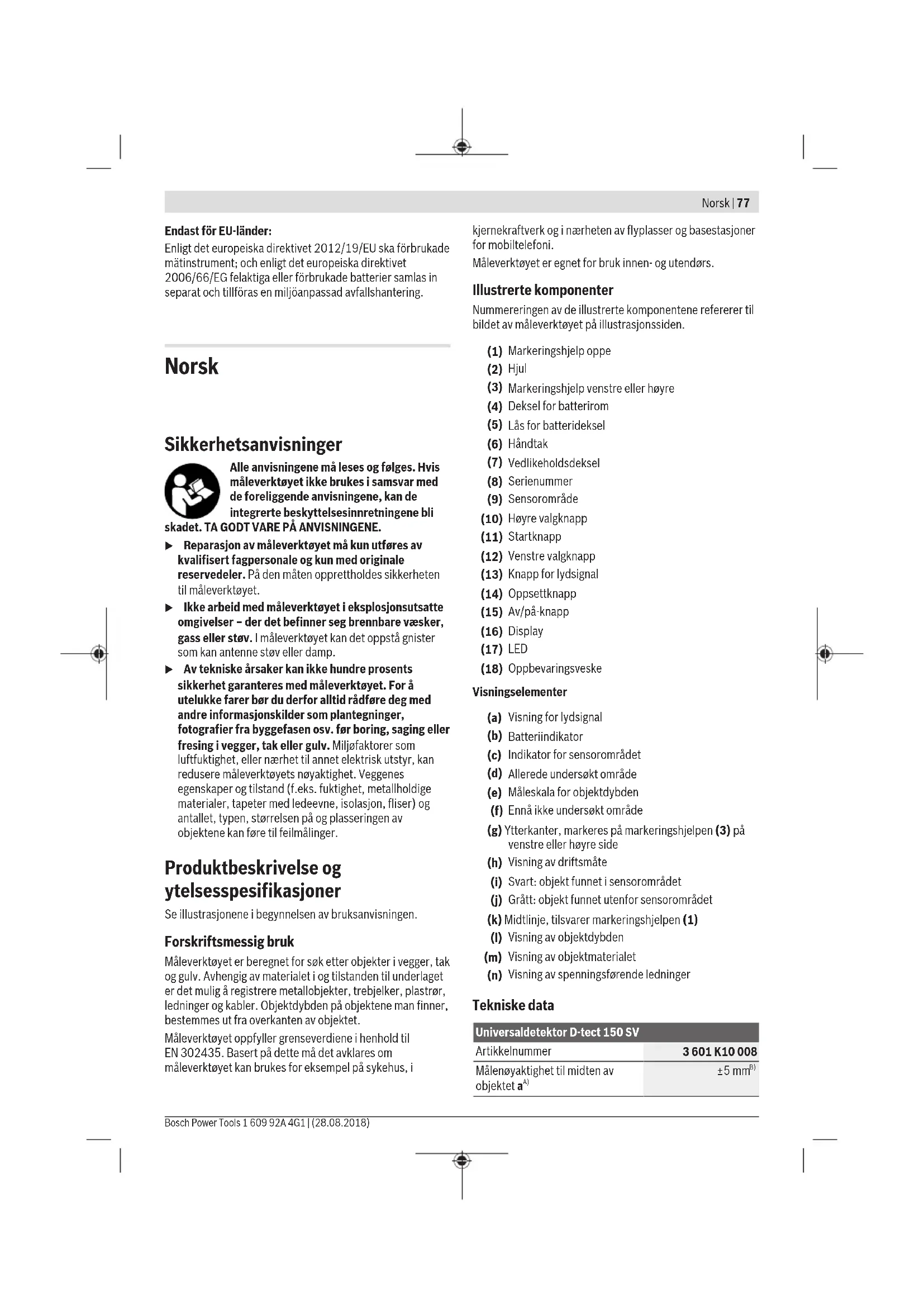 Med måleverktøyet blir underlaget i sensorområdet (9) kontrollert i måleretningA til vist måledybde. Måling er bare mulig når måleverktøyet beveges i kjøreretningB og med en minste målestrekning på 10cm. Beveg alltid måleverktøyet over veggen i rett linje med lett trykk slik at hjulene har sikker veggkontakt. Det som registreres, er objekter som skiller seg ut fra materialet i veggen. På displayet vises objektdybden og hvis mulig objektmaterialet. Optimale resultater oppnås hvis målestrekningen er minst 40cm og måleverktøyet beveges langsomt over hele stedet som skal undersøkes. Pålitelig detektering av overkantene på objekter som går på tvers av bevegelsesretningen til måleverktøyet avhenger av funksjonen. Beveg derfor alltid måleverktøyet i kryss over området som skal undersøkes. Hvis det er flere objekter over hverandre i veggen, vises objektet som ligger nærmest overflaten, på displayet. Visningen av egenskapene til de funnede objektene på displayet(16) kan avvike fra de faktiske objektegenskapene. Spesielt kan svært tynne objekter vises som tykkere på displayet. Større, sylindriske objekter (for eksempel plast- eller vannrør) kan se smalere ut på displayet enn de er i virkeligheten. Objekter som kan registreres – Plastrør (for eksempel plastrør fylt med vann, som gulvvarme eller varmerør i vegger, med diameter på minst 10 mm, tomrør med diameter på minst 20 mm) – Elektriske ledninger (uavhengig av om de er spenningsførende eller ikke) – Trefasede vekselstrømsledninger (for eksempel til stekeovn) – Lavspenningsledninger (for eksempel dørklokke, telefon) – Alle typer metallrør, -stenger, -bjelker (for eksempel stål, kobber, aluminium) – Armeringsjern – Trebjelker – Hulrom Måling mulig – I betong / armert betong – I murverk (murstein, porebetong, lettbetong, pimpsteinbetong, kalksandstein) – I lettvegger – Under overflater som murpuss, fliser, tapet, parkett, tepper – Bak treverk, gipskartong Spesielle måletilfeller Ugunstige omstendigheter kan ut fra driftsprinsippet påvirke måleresultatet negativt: – Flerlags veggkonstruksjoner – Tomme plastrør og trebjelker i hulrom og lettvegger – Objekter som går skrått i veggen – Fuktig veggmateriale – Metalloverflater – Hulrom i en vegg; disse kan vises som objekter – Apparater i nærheten som genererer kraftige magnetiske eller elektromagnetiske felt, f.eks. basestasjoner for mobilradioer eller generatorer Igangsetting Inn-/utkobling u Kontroller før måleverktøyet slås på at sensorområdet(9) ikke er fuktig. Gni eventuelt måleverktøyet tørt med en klut. u La måleverktøyet akklimatiseres før det slås på hvis det har vært utsatt for en sterk temperaturendring. Innkobling – For å slå på måleverktøyet trykker du på av/på- knappen(15) eller startknappen(11). – Lysdioden (17) lyser grønt og startbildet vises på displayet(16) i fire sekunder. – Hvis du ikke foretar noen måling eller ikke trykker på noen knapp på måleverktøyet, slås det automatisk av igjen etter 5 minutter. I menyen Innstillinger kan du endre denne <Utkoplingstid> (se „<Utkoplingstid>“, Side82). Utkobling – For å slå av måleverktøyet trykker du på av/på- knappen(15). – Når måleverktøyet slås av, beholdes alle de valgte innstillingene i menyene. Slå lydsignal på/av Med knappen for lydsignal(13) kan du slå lydsignalet på eller av. I menyen undermenyen <Lydsignaler> i menyen Innstillinger kan du velge signaltypen (se „<Lydsignaler>“, Side82). Norsk | 79 Bosch Power Tools 1 609 92A 4G1 | (28.08.2018)80 | Norsk 1 609 92A 4G1 | (28.08.2018) Bosch Power Tools Måling Slå på måleverktøyet. På displayet(16) vises standardskjermbildet for visninger. Betong universal Tilbake NesteSensor 0 cm 0 cm Beveg Sett måleverktøyet inntil veggen, og beveg det i rulleretningen (se „Funksjon (se bilde B)“, Side79) over veggen. Måleresultatene vises etter på displayet(16) etter en minste målestrekning på 10 cm. For å oppnå riktige måleresultater beveger du langsomt over hele det antatte objektet i veggen. Hvis du tar måleverktøyet bort fra veggen under målingen eller ikke bruker det på mer enn 2minutter (bevegelse, knappetrykk), blir det siste måleresultatet stående på displayet. På displayet for sensorområdet (c) vises meldingen <Pause>. Når du setter måleverktøyet på veggen igjen, skyver det videre eller trykker på startknappen(11), starter målingen på nytt. Hvis lysdioden(17) lyser rødt, er det et objekt i sensorområdet. Hvis lysdioden(17) lyser grønt, er det ikke noe objekt i sensorområdet. Hvis lysdioden (17) blinker rødt, er det et spenningsførende objekt i sensorområdet. u Før du borer, sager eller freser i en vegg, bør du utelukke farer ved hjelp av andre informasjonskilder. Ettersom måleresultatene kan påvirkes av forhold i omgivelsene eller tilstanden til veggen, kan det finnes risiko selv om visningen ikke angir noe objekt i sensorområdet (lysdioden(17) lyser grønt). Visningselementer (se bilde A) Hvis det befinner seg et objekt under sensoren, vises dette i sensorområdet (c) på displayet. Avhengig av objektets størrelse og dybde er materialregistrering mulig. Objektdybden (l) til overkanten av det detekterte objektet vises på statuslinjen. Merknad: Både visningen av objektdybden (l) og visningen av materialegenskapen (m) refererer til objektet som vises i svart i sensoren. Visningen av objektmateriale(m) kan angi følgende egenskaper: