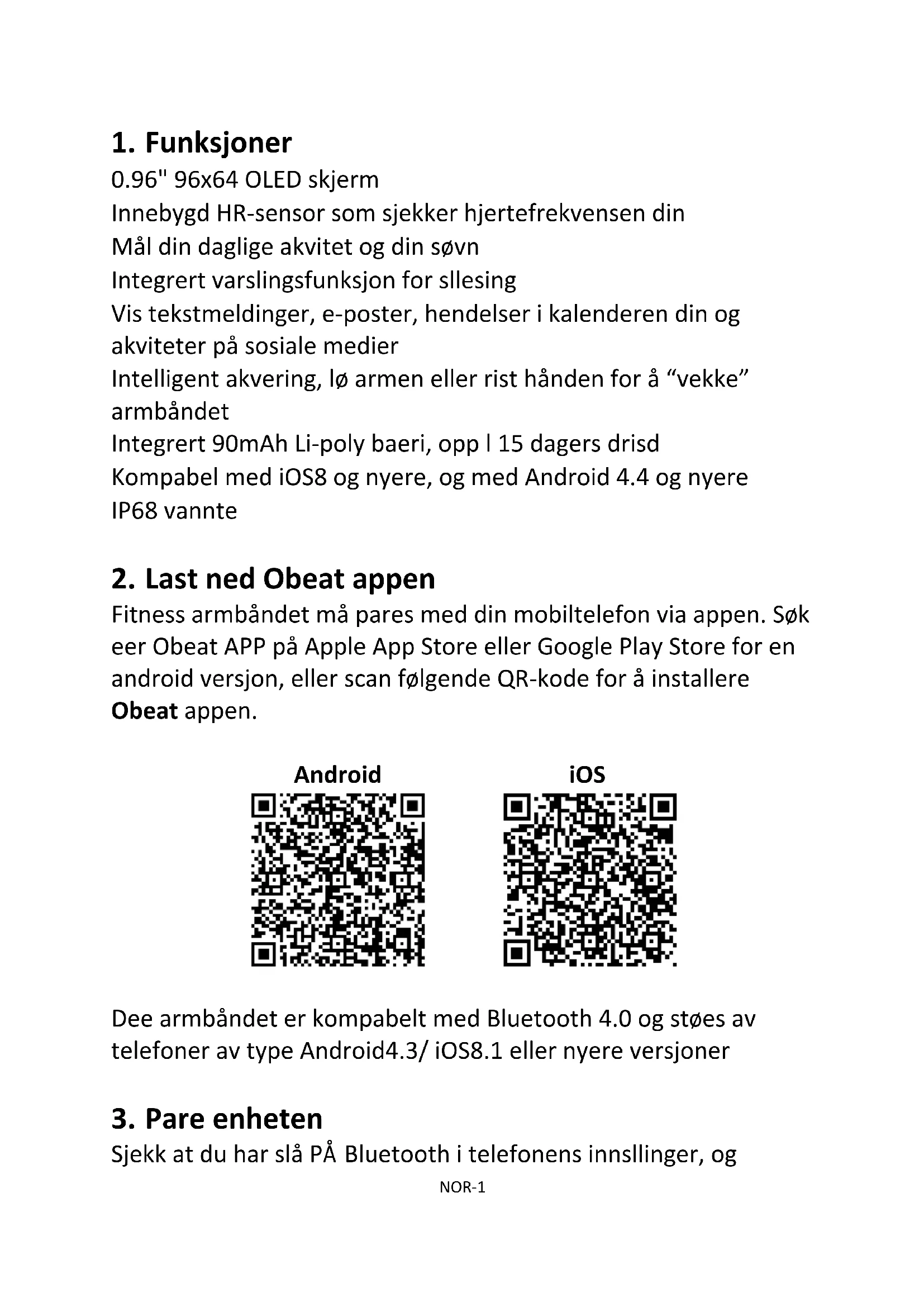 Fitness armbåndet må pares med din mobiltelefon via appen. Søk etter Obeat APP på Apple App Store eller Google Play Store for en android versjon, eller scan følgende QR-kode for å installere Obeat appen. Android iOS