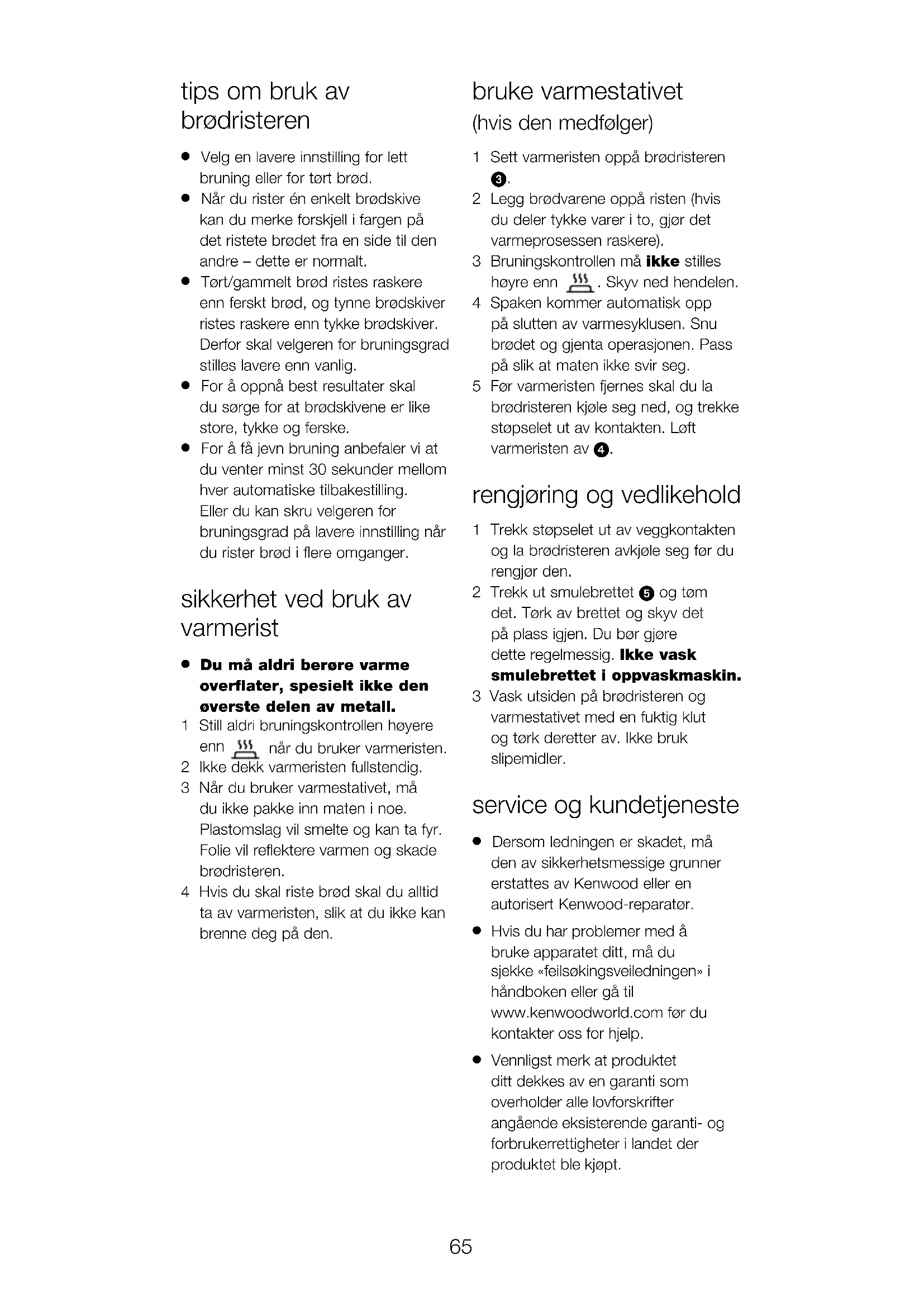 2 Legg brødvarene oppå risten (hvis du deler tykke varer i to, gjør det varmeprosessen raskere). 3 Bruningskontrollen må ikke stilles høyre enn . Skyv ned hendelen. 4 Spaken kommer automatisk opp på slutten av varmesyklusen. Snu brødet og gjenta operasjonen. Pass på slik at maten ikke svir seg. 5 Før varmeristen fjernes skal du la brødristeren kjøle seg ned, og trekke støpselet ut av kontakten. Løft varmeristen av 4. rengjøring og vedlikehold 1 Trekk støpselet ut av veggkontakten og la brødristeren avkjøle seg før du rengjør den. 2 Trekk ut smulebrettet 5 og tøm det. Tørk av brettet og skyv det på plass igjen. Du bør gjøre dette regelmessig. Ikke vask smulebrettet i oppvaskmaskin. 3 Vask utsiden på brødristeren og varmestativet med en fuktig klut og tørk deretter av. Ikke bruk slipemidler. service og kundetjeneste