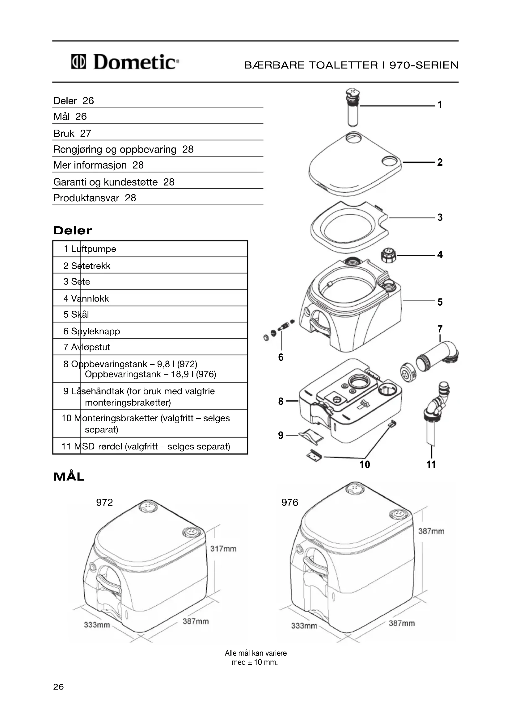 1 Luftpumpe 2 Setetrekk 3 Sete 4 Vannlokk 5 Skål 6 Spyleknapp 7 Avløpstut 8 Oppbevaringstank – 9,8 l (972) Oppbevaringstank – 18,9 l (976) 9 Låsehåndtak (for bruk med valgfrie monteringsbraketter) 10 Monteringsbraketter (valgfritt – selges separat) 11 MSD-rørdel (valgfritt – selges separat) Deler MÅL Deler 26 Mål 26 Bruk 27 Rengjøring og oppbevaring 28 Mer informasjon 28 Garanti og kundestøtte 28 Produktansvar 28