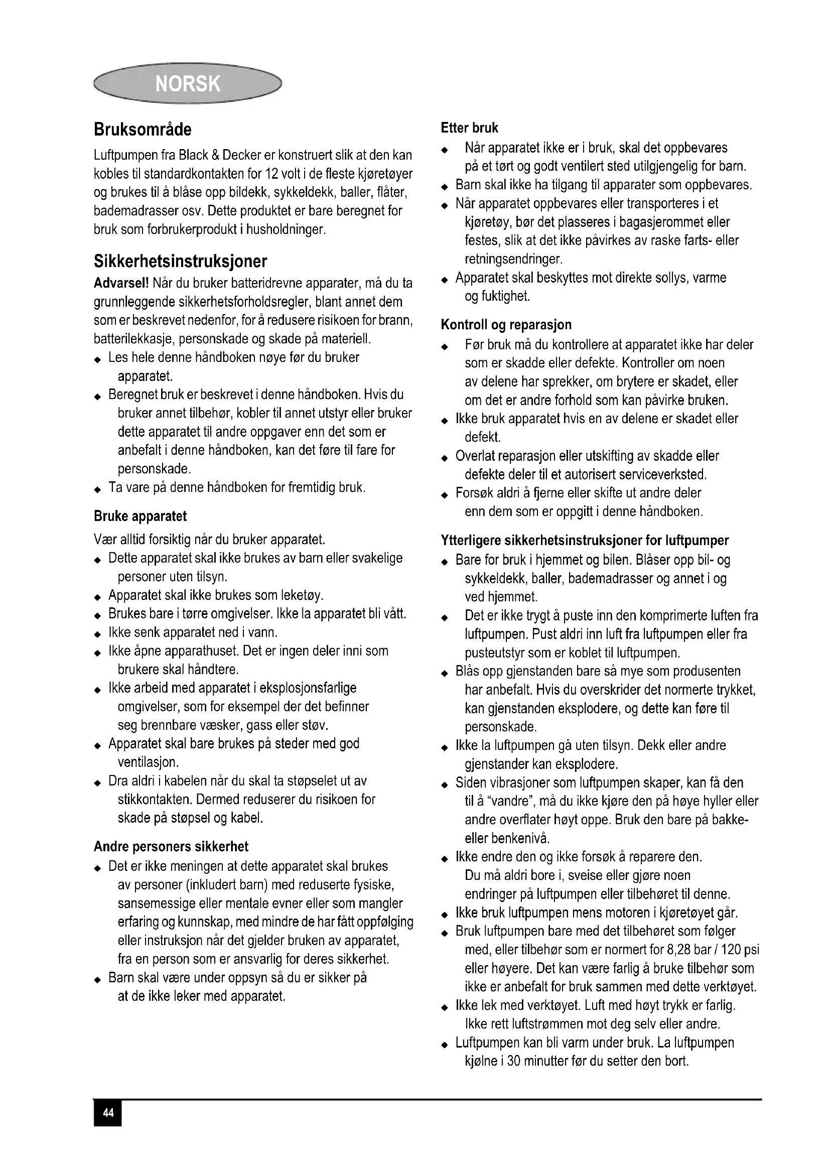 Luftpumpen fra Black & Decker er konstruert sik at den kan kobles til standardkontakten for 12 volt i de feste kjoretyer og brukes til a blase opp bildekk, sykkeledekk, baller, flater, bademadrasser osv. Dette produkt er bare beregnet for bruk som forbrukerprodukti husholdninger.