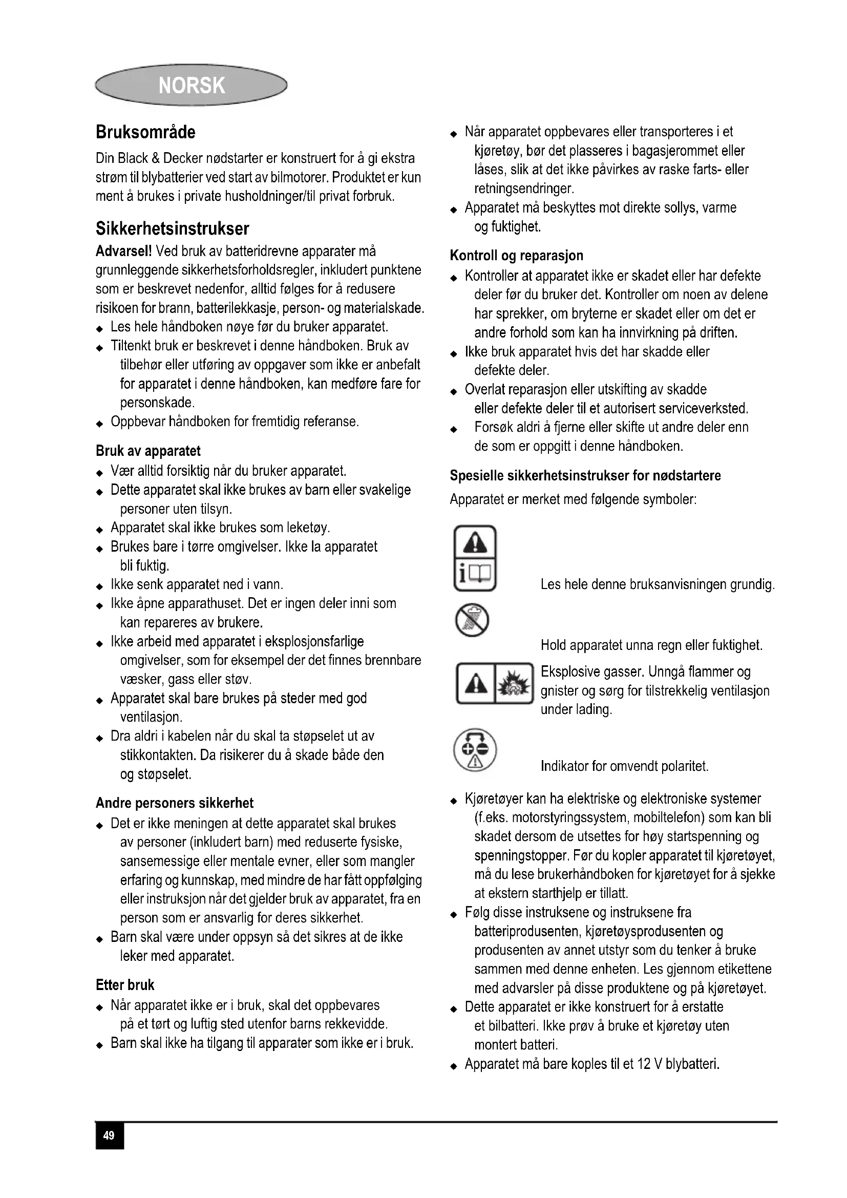 Din Black & Decker nødstarter er konstruert for å gi ekstra strøm til blybatterier ved start av bilmotorer. Produktet er kun ment å brukes i private husholdninger/til privat forbruk.
