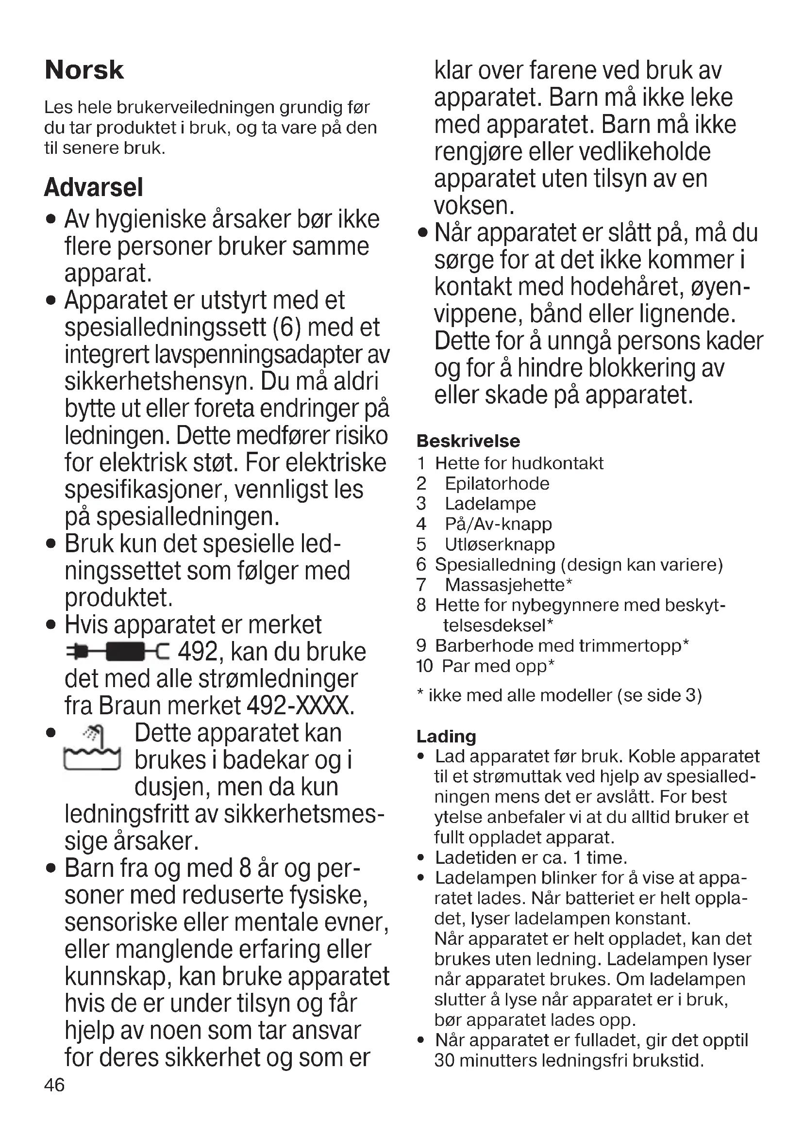 Hvis apparatet er merket 492, kan du bruke det med alle strømledninger fra Braun merket 492-XXXX.