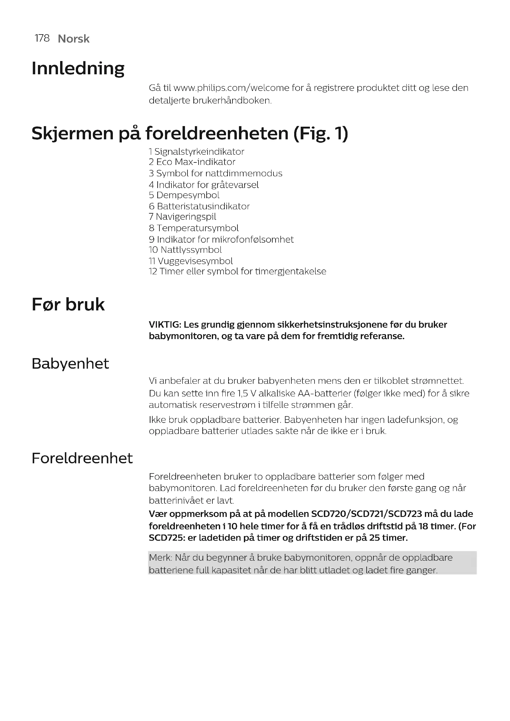 Merk: Når du begyinner Å bruke babymonitoren, oppnár de oppladbare batteriene full kapasitet når de har blitt utladet og ladet fire ganger.