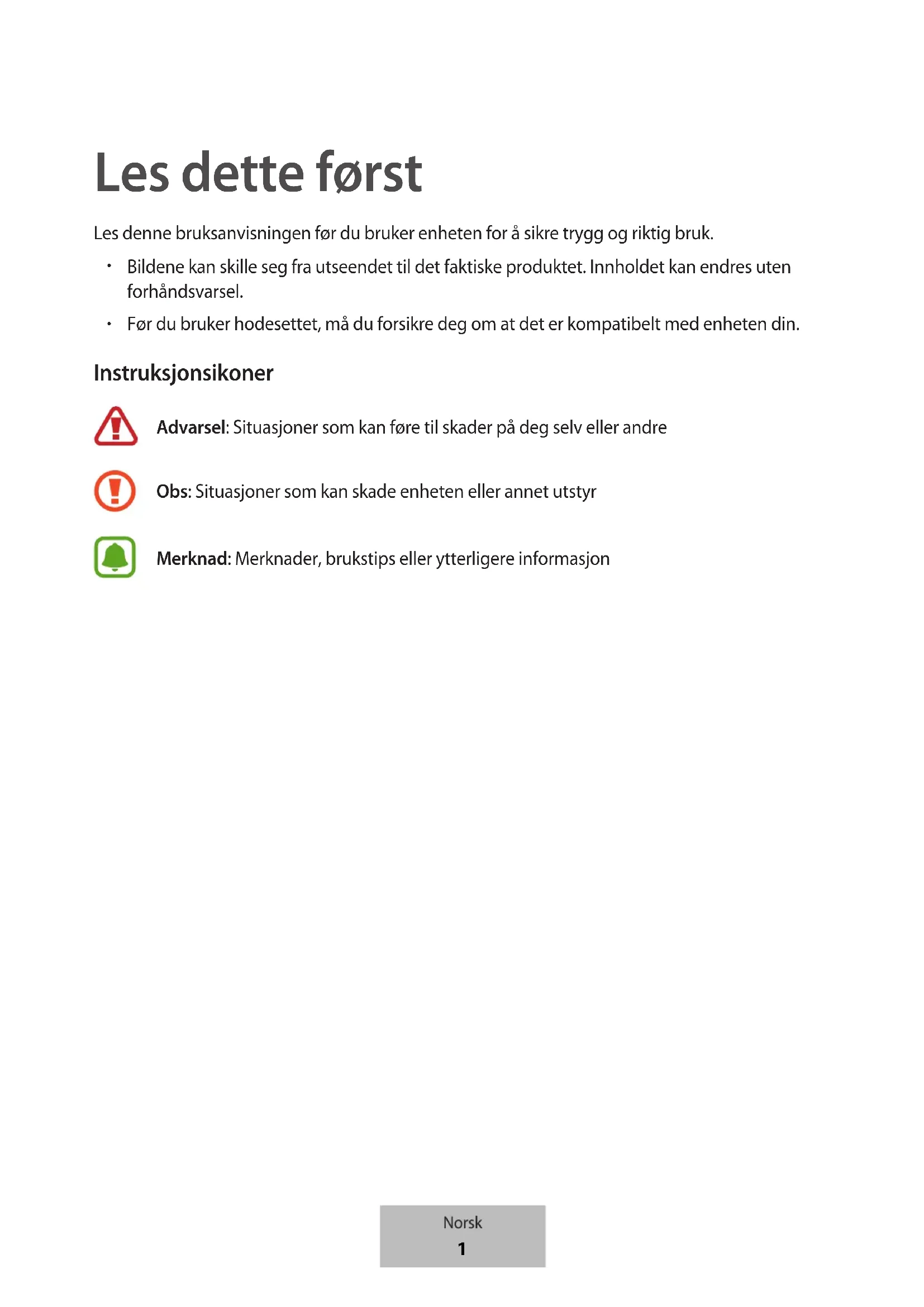 Før du bruker hodesettet, må du forsikre deg om at det er kompatibelt med enheten din. Instruksjonsikoner Advarsel: Situasjoner som kan føre til skader på deg selv eller andre Obs: Situasjoner som kan skade enheten eller annet utstyr Merknad: Merknader, brukstips eller ytterligere informasjon Norsk