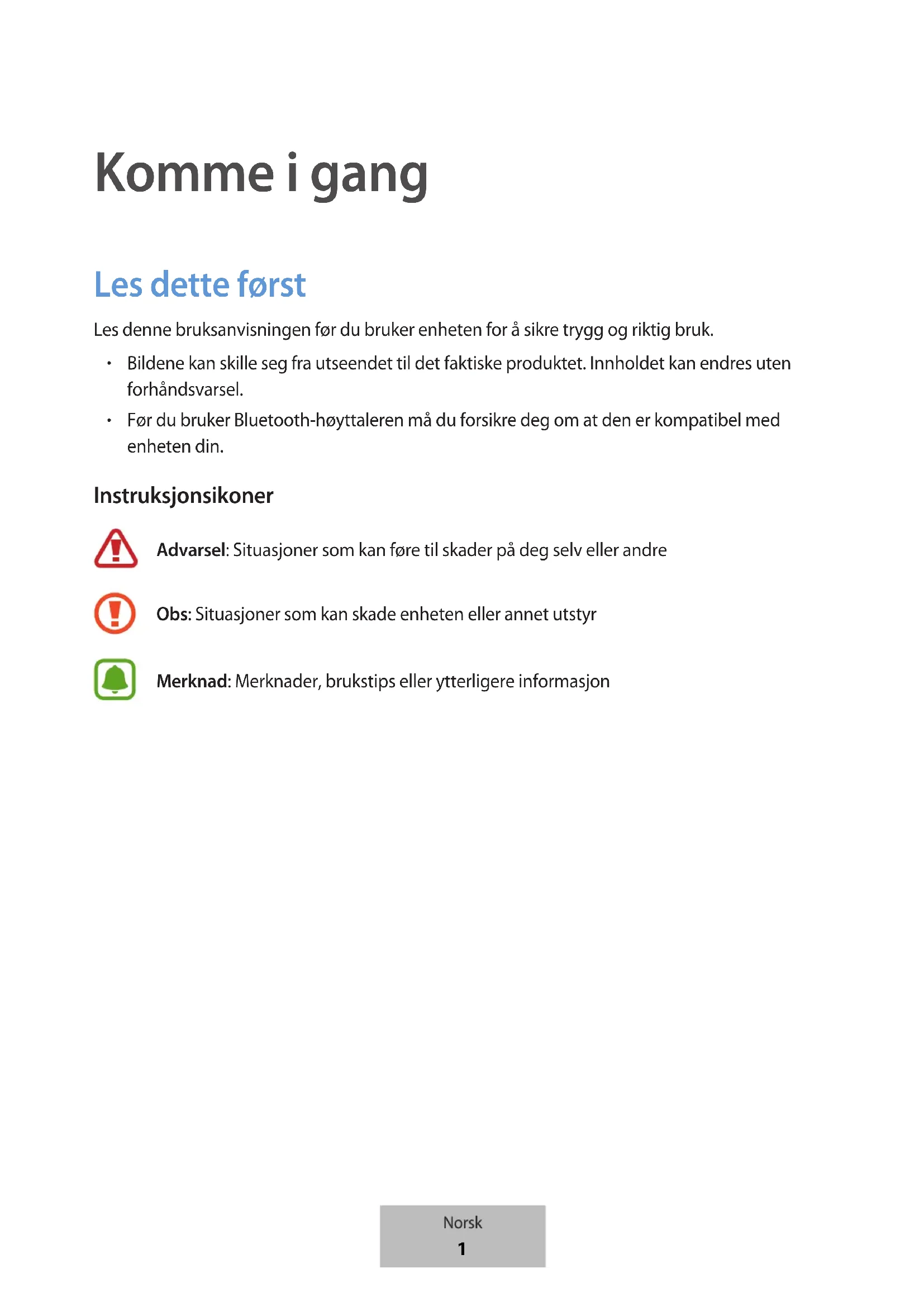 Før du bruker Bluetooth-høyttaleren må du forsikre deg om at den er kompatibel med enheten din. Instruksjonsikoner Advarsel: Situasjoner som kan føre til skader på deg selv eller andre Obs: Situasjoner som kan skade enheten eller annet utstyr Merknad: Merknader, brukstips eller ytterligere informasjon Norsk 1Komme i gang