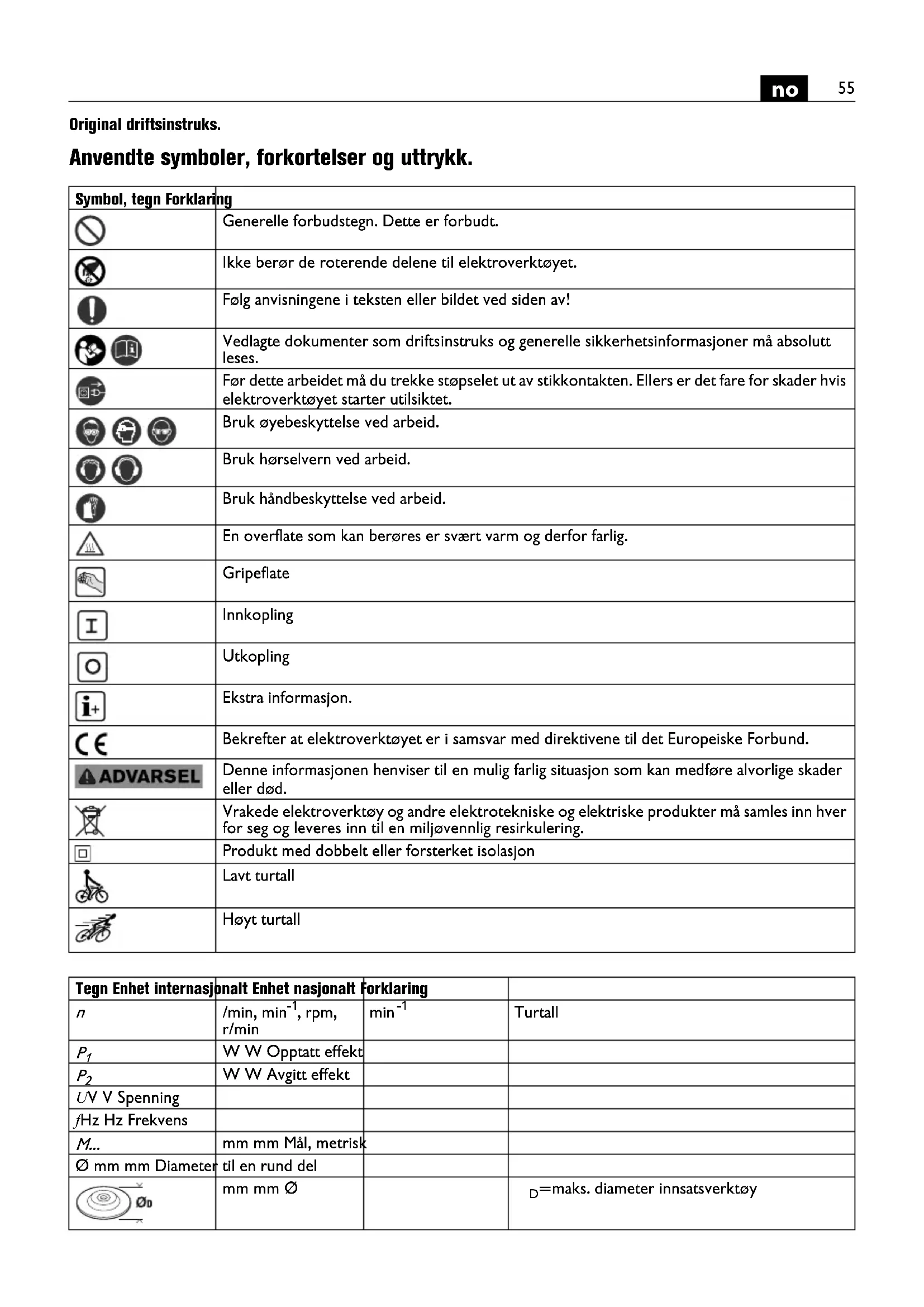 Original driftsinstruks. Anvendte symboler, forkortelser og uttrykk. Symbol, tegn Forklaring Generelle forbudstegn. Dette er forbudt. Ikke berør de roterende delene til elektroverktøyet. Følg anvisningene i teksten eller bildet ved siden av! Vedlagte dokumenter som driftsinstruks og generelle sikkerhetsinformasjoner må absolutt leses. Før dette arbeidet må du trekke støpselet ut av stikkontakten. Ellers er det fare for skader hvis elektroverktøyet starter utilsiktet. Bruk øyebeskyttelse ved arbeid. Bruk hørselvern ved arbeid. Bruk håndbeskyttelse ved arbeid. En overflate som kan berøres er svært varm og derfor farlig. Gripeflate Innkopling Utkopling Ekstra informasjon. Bekrefter at elektroverktøyet er i samsvar med direktivene til det Europeiske Forbund. Denne informasjonen henviser til en mulig farlig situasjon som kan medføre alvorlige skader eller død. Vrakede elektroverktøy og andre elektrotekniske og elektriske produkter må samles inn hver for seg og leveres inn til en miljøvennlig resirkulering. Produkt med dobbelt eller forsterket isolasjon Lavt turtall Høyt turtall Tegn Enhet internasjonalt Enhet nasjonalt Forklaring