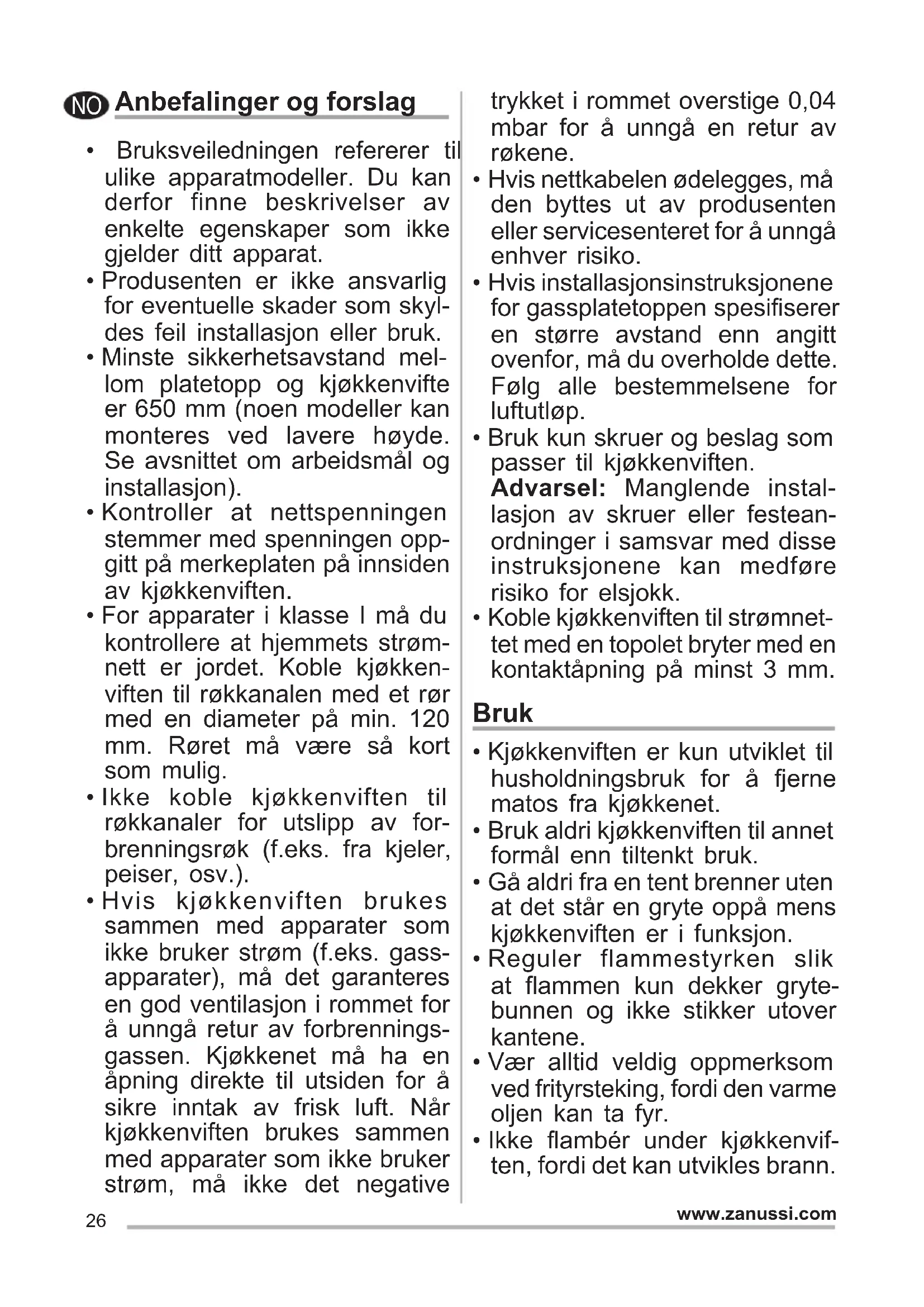 - Ikke ambér under kjøkkenvif- ten, fordi det kan utvikles brann. NO27 www.zanussi.com