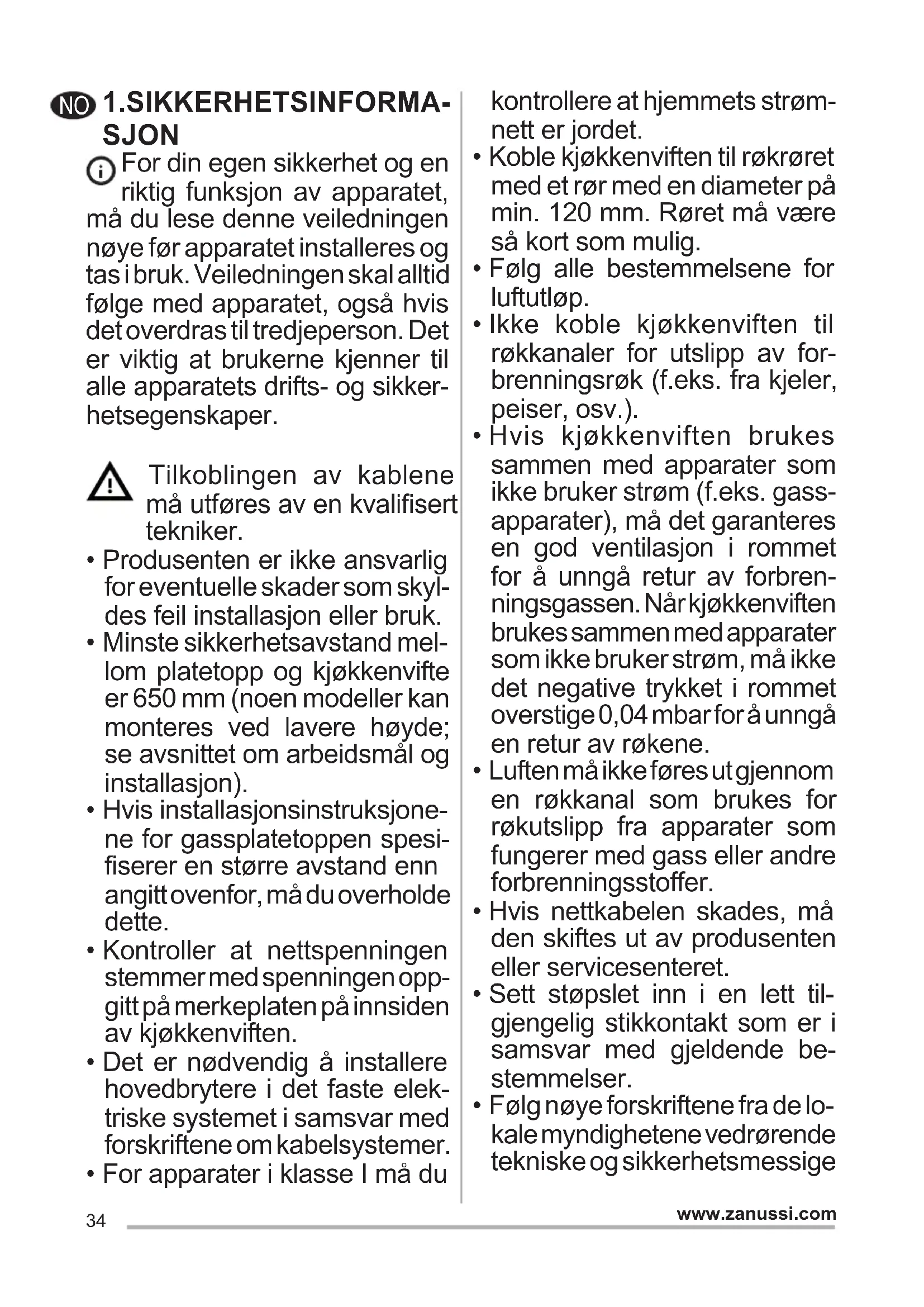 - Følg nøye forskriftene fra de lo- kale myndighetene vedrørende tekniske og sikkerhetsmessige NO35 www.zanussi.com tiltak for røkutslipp. ADVARSEL: Fjern beskyt- telseslmene før kjøkkenvif- ten installeres.