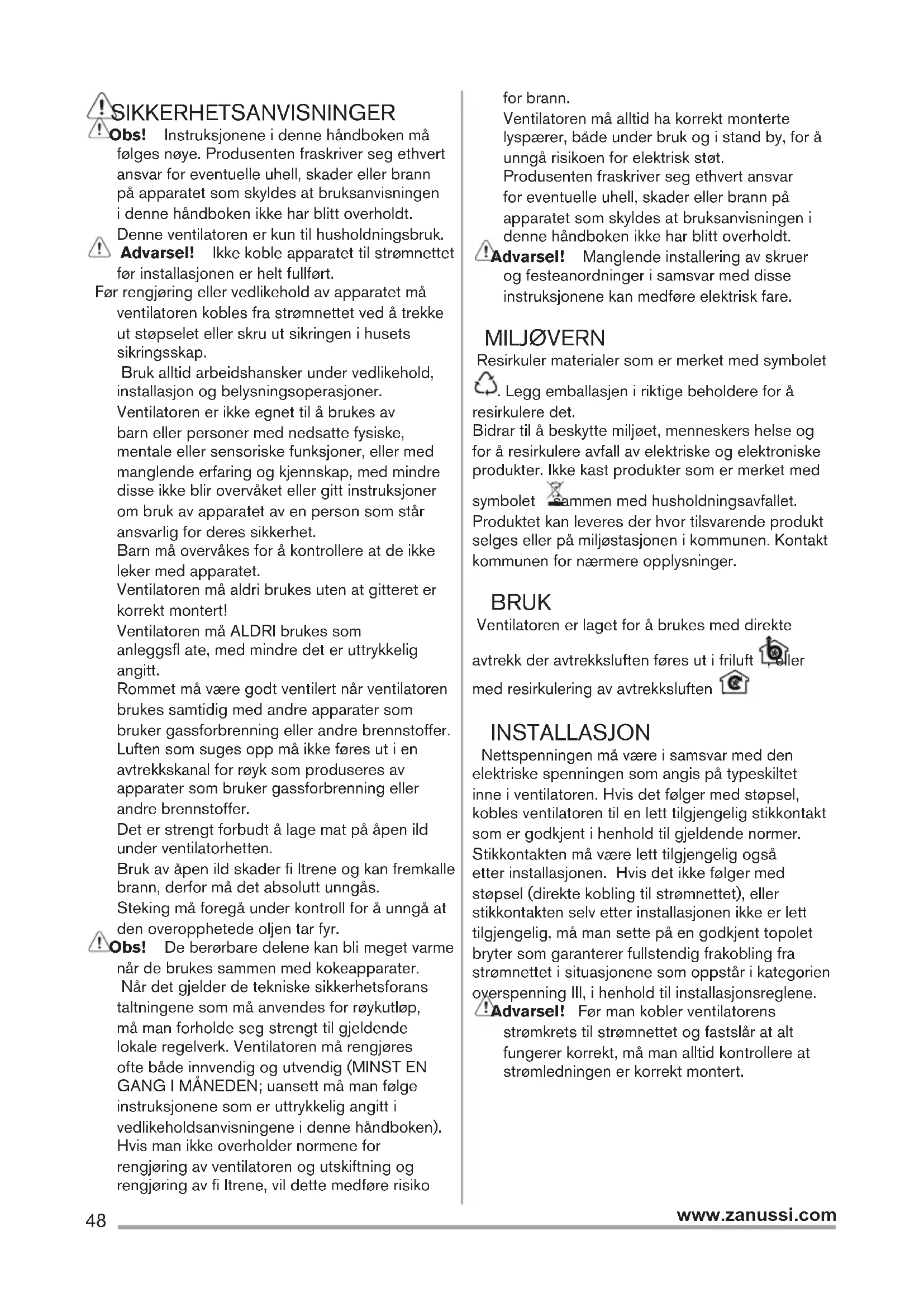 utsugningseffekt (4), maximal utsugningseffekt (5). Använd en högre hastighet om matoset är mycket koncentrerat. Vi rekommenderar att starta luftevakueringen 5 minuter innan matlagningen inleds och låta den fungera i cirka 15 minuter efter avslutad matlagning. BELYSNING Koppla ur apparaten från elnätet. Varning! Kontrollera att lamporna har svalnat innan ni vidrör dem. Byt ut den trasiga lampan med en lampa av samma typ enligt anvisningarna på märkplåten eller intill fl äktens lampa (E14).48 www.zanussi.com SIKKERHETSANVISNINGER Obs! Instruksjonene i denne håndboken må følges nøye. Produsenten fraskriver seg ethvert ansvar for eventuelle uhell, skader eller brann på apparatet som skyldes at bruksanvisningen i denne håndboken ikke har blitt overholdt. Denne ventilatoren er kun til husholdningsbruk. Advarsel! Ikke koble apparatet til strømnettet før installasjonen er helt fullført. Før rengjøring eller vedlikehold av apparatet må ventilatoren kobles fra strømnettet ved å trekke ut støpselet eller skru ut sikringen i husets sikringsskap. Bruk alltid arbeidshansker under vedlikehold, installasjon og belysningsoperasjoner. Ventilatoren er ikke egnet til å brukes av barn eller personer med nedsatte fysiske, mentale eller sensoriske funksjoner, eller med manglende erfaring og kjennskap, med mindre disse ikke blir overvåket eller gitt instruksjoner om bruk av apparatet av en person som står ansvarlig for deres sikkerhet. Barn må overvåkes for å kontrollere at de ikke leker med apparatet. Ventilatoren må aldri brukes uten at gitteret er korrekt montert! Ventilatoren må ALDRI brukes som anleggsfl ate, med mindre det er uttrykkelig angitt. Rommet må være godt ventilert når ventilatoren brukes samtidig med andre apparater som bruker gassforbrenning eller andre brennstoffer. Luften som suges opp må ikke føres ut i en avtrekkskanal for røyk som produseres av apparater som bruker gassforbrenning eller andre brennstoffer. Det er strengt forbudt å lage mat på åpen ild under ventilatorhetten. Bruk av åpen ild skader fi ltrene og kan fremkalle brann, derfor må det absolutt unngås. Steking må foregå under kontroll for å unngå at den overopphetede oljen tar fyr. Obs! De berørbare delene kan bli meget varme når de brukes sammen med kokeapparater. Når det gjelder de tekniske sikkerhetsforans taltningene som må anvendes for røykutløp, må man forholde seg strengt til gjeldende lokale regelverk. Ventilatoren må rengjøres ofte både innvendig og utvendig (MINST EN GANG I MÅNEDEN; uansett må man følge instruksjonene som er uttrykkelig angitt i vedlikeholdsanvisningene i denne håndboken). Hvis man ikke overholder normene for rengjøring av ventilatoren og utskiftning og rengjøring av fi ltrene, vil dette medføre risiko for brann. Ventilatoren må alltid ha korrekt monterte lyspærer, både under bruk og i stand by, for å unngå risikoen for elektrisk støt. Produsenten fraskriver seg ethvert ansvar for eventuelle uhell, skader eller brann på apparatet som skyldes at bruksanvisningen i denne håndboken ikke har blitt overholdt. Advarsel! Manglende installering av skruer og festeanordninger i samsvar med disse instruksjonene kan medføre elektrisk fare. MILJØVERN Resirkuler materialer som er merket med symbolet . Legg emballasjen i riktige beholdere for å resirkulere det. Bidrar til å beskytte miljøet, menneskers helse og for å resirkulere avfall av elektriske og elektroniske produkter. Ikke kast produkter som er merket med symbolet sammen med husholdningsavfallet. Produktet kan leveres der hvor tilsvarende produkt selges eller på miljøstasjonen i kommunen. Kontakt kommunen for nærmere opplysninger. BRUK Ventilatoren er laget for å brukes med direkte avtrekk der avtrekksluften føres ut i friluft , eller med resirkulering av avtrekksluften . INSTALLASJON Nettspenningen må være i samsvar med den elektriske spenningen som angis på typeskiltet inne i ventilatoren. Hvis det følger med støpsel, kobles ventilatoren til en lett tilgjengelig stikkontakt som er godkjent i henhold til gjeldende normer. Stikkontakten må være lett tilgjengelig også etter installasjonen. Hvis det ikke følger med støpsel (direkte kobling til strømnettet), eller stikkontakten selv etter installasjonen ikke er lett tilgjengelig, må man sette på en godkjent topolet bryter som garanterer fullstendig frakobling fra strømnettet i situasjonene som oppstår i kategorien overspenning III, i henhold til installasjonsreglene. Advarsel! Før man kobler ventilatorens strømkrets til strømnettet og fastslår at alt fungerer korrekt, må man alltid kontrollere at strømledningen er korrekt montert.49 www.zanussi.com Minimumsavstanden mellom koketoppen og undersiden av kjøkkenventilatoren må ikke være på mindre enn 43cm når det gjelder elektriske kokeplater og 65cm når det gjelder gassbluss og kombinerte koketopper. Dersom bruksanvisningen for et gasskokeapparat opererer med en større avstand, må denne overholdes. VEDLIKEHOLD Advarsel! Før enhver form for rengjøring eller vedlikehold må ventilatorhetten frakobles strømnettet ved å dra ut ledningen eller slå av husets hovedstrømbryter. Ventilatoren må rengjøres jevnlig, både innvendig og utvendig (minst så ofte som man utfører vedlikehold av fettfi ltrene). Til rengjøring benyttes en klut fuktet med et nøytralt rengjøringsmiddel. Unngå bruk av slipende eller etsende produkter. Advarsel! Hvis ikke reglene for rengjøring og utskifting av fi ltrene følges, kan det føre til brann. Det er derfor meget viktig å følge denne bruksanvisningen nøye. Produsenten fraskriver seg ethvert ansvar for eventuelle skader på motoren, brann som skyldes manglende vedlikehold eller andre skader som skyldes at instruksene over ikke er blitt fulgt. Fettfi lteret - Fettfi lteret må rengjøres en gang i måneden uten bruk av aggressive rengjøringsmidler, for hånd eller i oppvaskmaskin ved lav temperatur og med kort syk