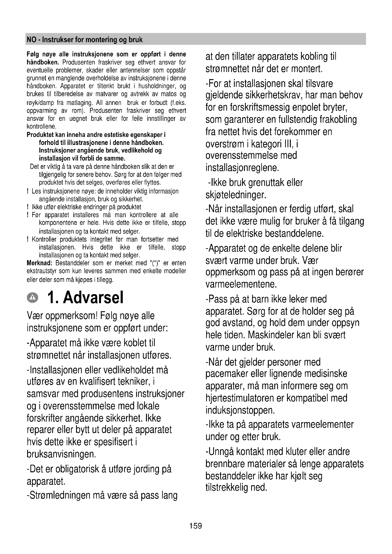 Als de storing na het uitvoeren van deze controles nog steeds aanwezig is, neem dan contact op met de dichtstbijzijnde Servicedienst.159 NO - Instrukser for montering og bruk Følg nøye alle instruksjonene som er oppført i denne håndboken. Produsenten fraskriver seg ethvert ansvar for eventuelle problemer, skader eller antennelser som oppstår grunnet en manglende overholdelse av instruksjonene i denne håndboken. Apparatet er tiltenkt brukt i husholdninger, og brukes til tilberedelse av matvarer og avtrekk av matos og røyk/damp fra matlaging. All annen bruk er forbudt (f.eks. oppvarming av rom). Produsenten fraskriver seg ethvert ansvar for en uegnet bruk eller for feile innstillinger av kontrollene. Produktet kan inneha andre estetiske egenskaper i forhold til illustrasjonene i denne håndboken. Instruksjoner angående bruk, vedlikehold og installasjon vil forbli de samme. Det er viktig å ta vare på denne håndboken slik at den er tilgjengelig for senere behov. Sørg for at den følger med produktet hvis det selges, overføres eller flyttes. ! Les instruksjonene nøye: de inneholder viktig informasjon angående installasjon, bruk og sikkerhet. ! Ikke utfør elektriske endringer på produktet ! Før apparatet installeres må man kontrollere at alle komponentene er hele. Hvis dette ikke er tilfelle, stopp installasjonen og ta kontakt med selger. ! Kontroller produktets integritet før man fortsetter med installasjonen. Hvis dette ikke er tilfelle, stopp installasjonen og ta kontakt med selger. Merknad: Bestanddeler som er merket med "(*)" er enten ekstrautstyr som kun leveres sammen med enkelte modeller eller deler som må kjøpes i tillegg.