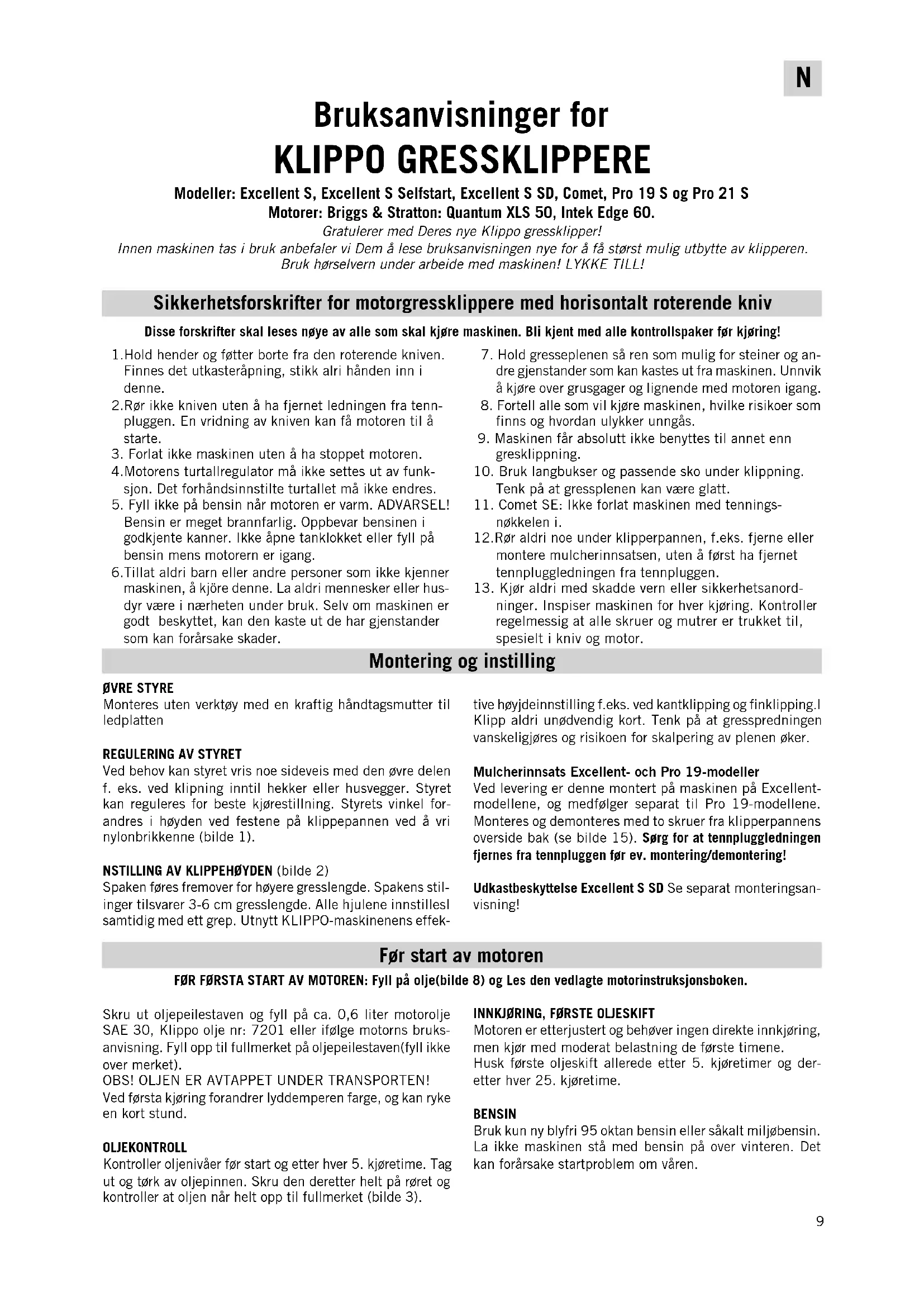 Roger Klotz, Direktør, Klippo AB9 Bruksanvisninger for KLIPPO GRESSKLIPPERE Modeller: Excellent S, Excellent S Selfstart, Excellent S SD, Comet, Pro 19 S og Pro 21 S Motorer: Briggs & Stratton: Quantum XLS 50, Intek Edge 60. Gratulerer med Deres nye Klippo gressklipper!Innen maskinen tas i bruk anbefaler vi Dem å lese bruksanvisningen nye for å få størst mulig utbytte av klipperen.Bruk hørselvern under arbeide med maskinen! LYKKE TILL!Disse forskrifter skal leses nøye av alle som skal kjøre maskinen. Bli kjent med alle kontrollspaker før kjøring!ØVRE STYREMonteres uten verktøy med en kraftig håndtagsmutter tilledplattenREGULERING AV STYRETVed behov kan styret vris noe sideveis med den øvre delenf. eks. ved klipning inntil hekker eller husvegger. Styretkan reguleres for beste kjørestillning. Styrets vinkel for-andres i høyden ved festene på klippepannen ved å vrinylonbrikkenne (bilde 1).NSTILLING AV KLIPPEHØYDEN (bilde 2)Spaken føres fremover for høyere gresslengde. Spakens stil-inger tilsvarer 3-6 cm gresslengde. Alle hjulene innstillesIsamtidig med ett grep. Utnytt KLIPPO-maskinenens effek-tive høyjdeinnstilling f.eks. ved kantklipping og finklipping.lKlipp aldri unødvendig kort. Tenk på at gresspredningenvanskeligjøres og risikoen for skalpering av plenen øker.Mulcherinnsats Excellent- och Pro 19-modellerVed levering er denne montert på maskinen på Excellent-modellene, og medfølger separat til Pro 19-modellene.Monteres og demonteres med to skruer fra klipperpannensoverside bak (se bilde 15). Sørg for at tennpluggledningenfjernes fra tennpluggen før ev. montering/demontering!Udkastbeskyttelse Excellent S SD Se separat monteringsan-visning!Skru ut oljepeilestaven og fyll på ca. 0,6 liter motoroljeSAE 30, Klippo olje nr: 7201 eller ifølge motorns bruks-anvisning. Fyll opp til fullmerket på oljepeilestaven(fyll ikkeover merket).OBS! OLJEN ER AVTAPPET UNDER TRANSPORTEN!Ved førsta kjøring forandrer lyddemperen farge, og kan rykeen kort stund.OLJEKONTROLLKontroller oljenivåer før start og etter hver 5. kjøretime. Tagut og tørk av oljepinnen. Skru den deretter helt på røret ogkontroller at oljen når helt opp til fullmerket (bilde 3).FØR FØRSTA START AV MOTOREN: Fyll på olje(bilde 8) og Les den vedlagte motorinstruksjonsboken. Montering og instilling Før start av motoren