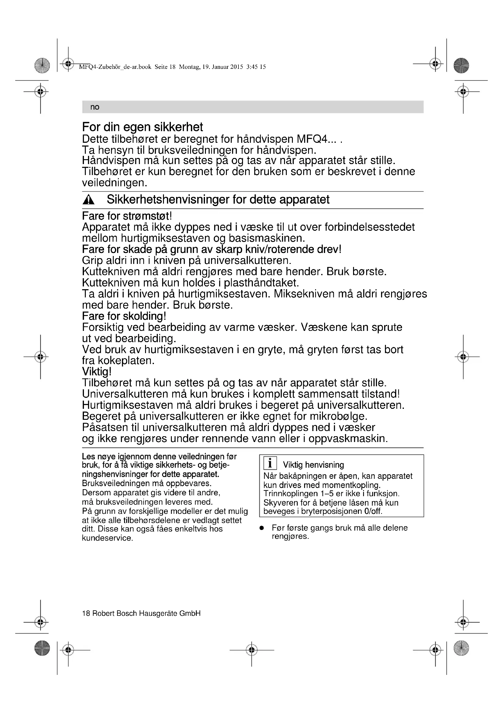 Fare for skade på grunn av skarp kniv/roterende drev! Grip aldri inn i kniven på universalkutteren. Kuttekniven må aldri rengjøres med bare hender. Bruk børste. Kuttekniven må kun holdes i plasthånd- taket. Fare for strømstøt! Apparatet må ikke dyppes ned i væske til ut over forbindelsesstedet mellom hurtigmiksestaven og basismaskinen. Fare for skade på grunn av skarp kniv/roterende drev! Ta aldri i kniven på hurtigmiksestaven. Miksekniven må aldri rengjøres med bare hender. Bruk børste. Fare for skolding! Forsiktig ved bearbeiding av varme væsker. Væskene kan sprute ut ved bearbeiding. MFQ4-Zubehör_de-ar.book Seite 19 Montag, 19. Januar 2015 3:45 1520 Robert Bosch Hausgeräte GmbH Bilde Åpne og hold fast låsen på bakåpningen. Sett hurtigmiksestaven oppå basis- maskinen og la den smekke i. Stikk inn støpselet. Fyll på matvarene i miksebegeret eller et annet høyt beger. Hurtigmiksestaven fungerer bedre dersom det er litt væske i de matvarene som skal bearbeides. Hold fast apparatet og begeret og slå på apparatet (trinn M). For å unngå at ingrediensene som blir mikset spruter, må først basismaskinen slås på når hurtigmiksestaven er dyppet ned i ingrediensene. Apparatet må alltid slås av før det blir tatt ut av blandingen. Slå av apparatet etter bearbeidingen. Trekk ut støpselet. For oppbevaring av bearbeidete matvarer sett lokket på miksebegeret. Etter arbeidet/rengjøring Obs! Overflatene kan bli skadet. Ikke bruk skurende rengjøringsmidler. Trykk på frigjøgingsknappene og ta hurtigmiksestaven av basismaskinen. Hold derved fast låsen på bakåpningen, slik at hurtigmiksestaven ikke klemmer fast. Hurtigmiksestaven kan vaskes i oppvask- maskinen eller rengjøres med børste under rennende vann. La hurtigmiksestaven tørke i loddrett stilling (miksekniven oppover), slik at vann som er trengt inn kan renne ut.