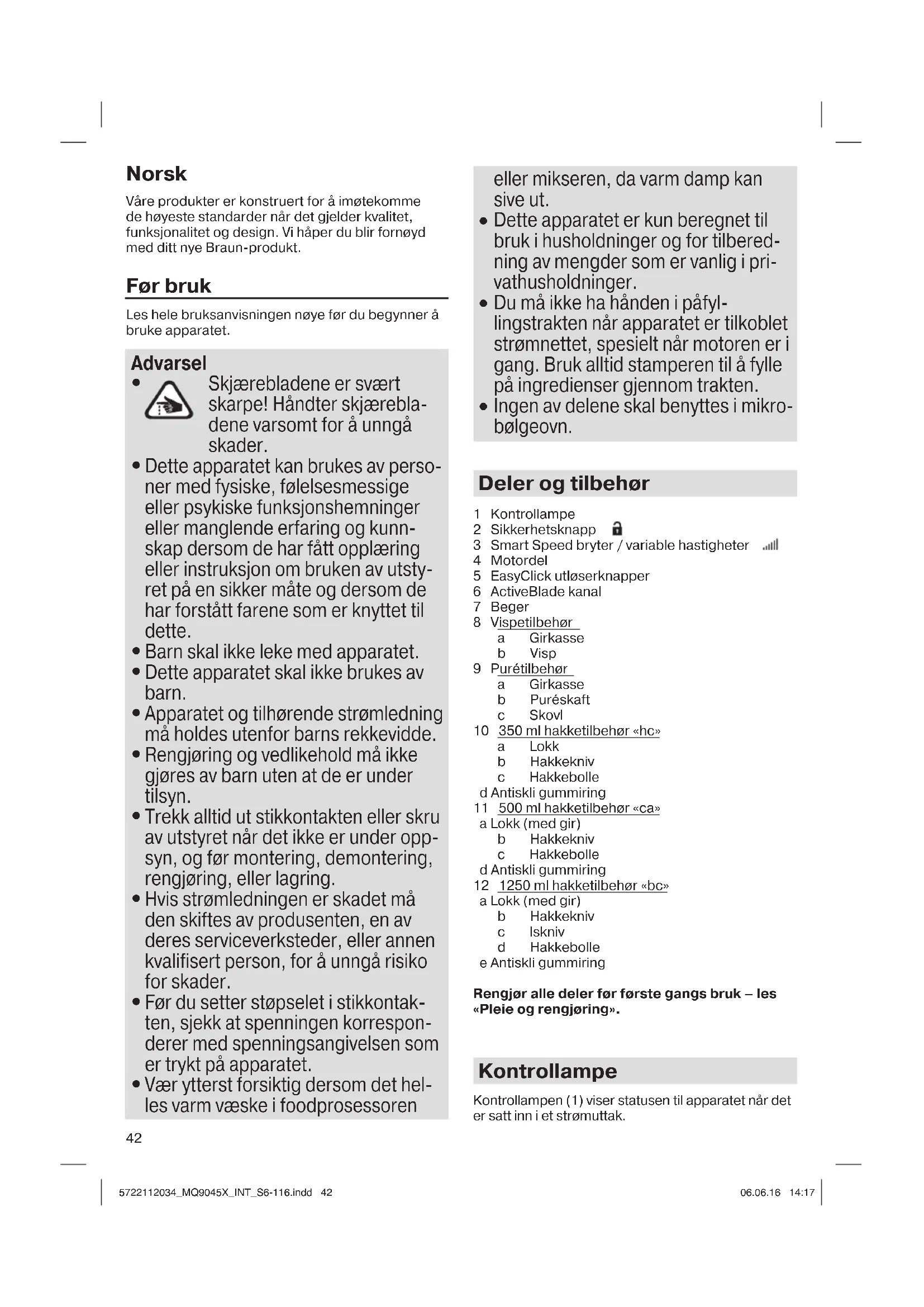 Ingen av delene skal benyttes i mikro- bølgeovn. Deler og tilbehør 1 Kontrollampe 2 Sikkerhetsknapp 3 Smart Speed bryter / variable hastigheter 4 Motordel 5 EasyClick utløserknapper 6 ActiveBlade kanal 7 Beger 8 Vispetilbehør a Girkasse b Visp 9 Purétilbehør a Girkasse b Puréskaft c Skovl 10 350 ml hakketilbehør «hc» a Lokk b Hakkekniv c Hakkebolle d Antiskli gummiring 11 500 ml hakketilbehør «ca» a Lokk (med gir) b Hakkekniv c Hakkebolle d Antiskli gummiring 12 1250 ml hakketilbehør «bc» a Lokk (med gir) b Hakkekniv c Iskniv d Hakkebolle e Antiskli gummiring Rengjør alle deler før første gangs bruk – les «Pleie og rengjøring». Kontrollampe Kontrollampen (1) viser statusen til apparatet når det er satt inn i et strømuttak. 5722112034_MQ9045X_INT_S6-116.indd 425722112034_MQ9045X_INT_S6-116.indd 42 06.06.16 14:1706.06.16 14:1743 Kontrollampe Apparat / Driftsstatus Blinker rødt Apparatet er klart for bruk. Lyser grønt kontinuerlig Apparatet er koblet fri (trykk på bryterutløserknapp) og kan slås på Lyser kontinuerlig rødt Tidlig advarsel om overoppheting. Motoren går saktere, trinn for trinn, til den slås av. La apparatet kjøles ned. Det er klart for bruk igjen når kontrollampen blinker rødt. Dersom maksimumshastigheten synker under høy belastning og lang driftstid, kan du fremdeles fullføre dine forberedelser, men du bør la apparatet kjøle seg ned etterpå. Slik brukes apparatet Smart Speed bryter for variable hastigheter Et trykk, alle hastigheter. Jo mer du trykker, desto større hastighet. Jo høyere hastighet, desto raskere og finere mikse- og hakkeresultater. Enhåndsoperasjon: Smart Speed bryter (3) lar deg skru på apparatet og kontrollere hastigheten med kun en hånd. Drift av håndmikseren Første bruk: Fjern transportsperren fra motordelen (4) ved å dra i den røde stroppen. Innkobling (A) Apparatet kommer utstyrt med en sikkerhetsknapp for å koble fri Smart Speed bryteren. Følg disse punktene for å slå den på trygt: