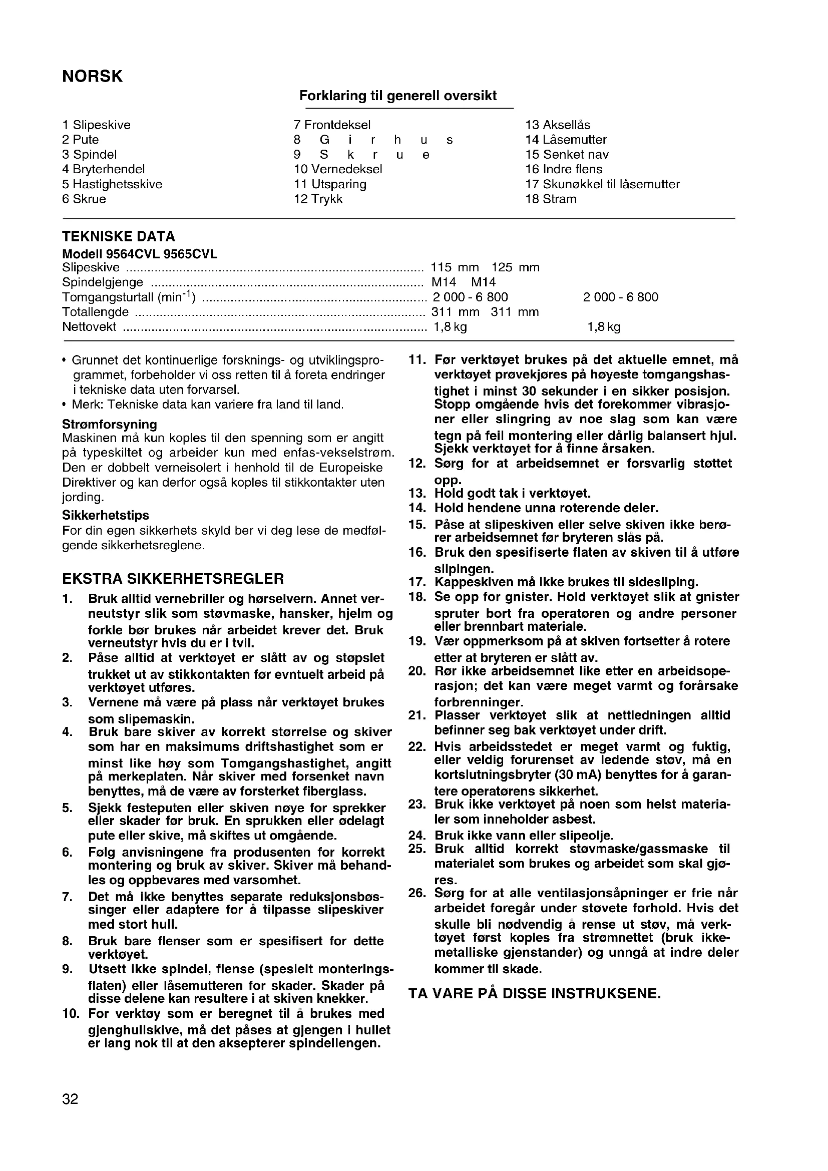 - Kontinuerlig bruk av en slitt skive kan resultere i at ski- ven eksploderer med alvorlig personskade til følge. SERVICE NB! Før servicearbeider utføres på maskinen må det passes på at denne er slått av og at støpselet er trukket ut av stikkontakten. Reparasjon og vedlikehold Selve verktøyet og åpningsventilene for luftavkjøling må alltid holdes rene. Når fremmedlegemer (støv etc.) tren- ger inn de nevnte stedene, må de fjernes. Rengjør med jevne mellomrom alt etter støvmengden. Hvis vernedekslet er montert på maskinen, fjernes det ved å følge “Demontering av vernedeksel”. For å garantere at maskinen arbeider sikkert og pålitelig bør reparasjoner, servicearbeider eller innstillinger utfø- res av et autorisert Makita-serviceverksted.35 SUOMI Yleisselostus 1 Hiomalaikka 2 Laippa 3 Kara 4Kytkin 5 Nopeudensäätökehä 6 Ruuvi 7 Kärkisuojus 8 Vaihdekotelo 9 Ruuvi 10 Laikan suojus 11 Kolo 12 Paina 13 Karalukitus 14 Lukkomutteri 15 Keskeltä ohennettu laikka 16 Sisälaippa 17 Lukkomutteriavain 18 Kiristyy TEKNISET TIEDOT Malli 9564CVL 9565CVL Hiomalaikka ................................................................................. 115 mm 125 mm Karan kierre ................................................................................. M14 M14 Tyhjäkäyntikierrosluku (min