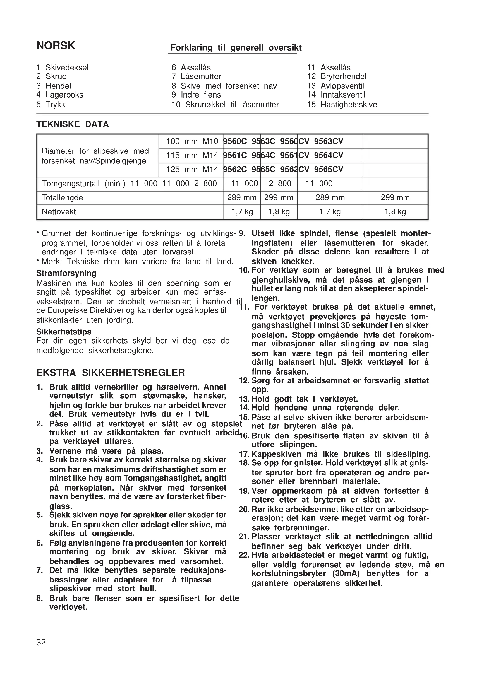 arbeidet foregår under støvete forhold. Hvis det skulle bli nødvendig å rense ut støv, må verktøyet først koples fra strømnettet (bruk ikke-metalliske gjenstander) og unngå at indre deler kommer til skade. TA VARE PÅ DISSE INSTRUKSENE. BRUKSANVISNINGER Montering av vernedeksel (Fig. 1 og 2) Viktig: Maskinen må alltid være avslått og støpslet tatt ut av stikkontakten før montering eller demontering av ver- nedekslet. Dra hendelen i pilens retning etter å ha skrudd løs skruen. Monter skivedekslet på lagerboksen ved å justere den konvekse delen på skivedekslet i samsvar med den konkave delen på lagerboksen. Drei skivedekslet 180 grader. Stram det med skruen etter å ha trukket hendelen i pilens retning. Alt etter arbeidet som skal gjøres, kan skivedekslets innstil- lingsvinkel justeres med hendelen. Demontere skivedekslet Følg monteringsprosedyren i omvendt rekkefølge for å demontere skivedekslet. Montering av støttehåndtak (hjelpehåndtak) (Fig. 3) Viktig: Maskinen må alltid være avslått og støpslet tatt av stikkontakten før montering eller demontering av støt- tehåndtaket. Monter alltid sidehåndtaket forsvarlig fast på verk- tøyet før bruk. Sidehåndtaket kan monteres på begge sider av verktøyet alt etter behov. Se til at vernet er korrekt plassert. Hold alltid godt fast i både hoved- og sidehåndtaket under bruk. Spindellås (Fig. 4) Trykk på spindellåsen for å forhindre at spindelen roterer mens utstyr monteres eller demonteres. NB! Spindellåsen må aldri aktiveres mens spindelen er i bevegelse. Det kan føre til skader på maskinen. Montering og demontering av skive med forsenket nav (Fig. 5 og 6) Viktig: Sørg alltid for at maskinen er avslått og støpslet tatt ut av stikkontakten før montering og demontering av slipeskive. Monter den indre flensen på spindelen. Fest slipeskiven oppå flensen og skru låsemutteren fast på spindelen. Låsemutteren strammes ved å trykke på spindellåsen slik at spindelen ikke kan rotere. Deretter strammes festemutteren med hakenøkkelen med urviserne. Slipeskiven demonteres ved å følge montering- sprosedyren i omvendt rekkefølge. Bryter (Fig. 7) NB! Før verktøyets støpsel koples til en stikkontakt, må det påses at bryteren virker som den skal og går tilbake til ‘‘OFF’’ når bryterhendelen trykkes inn. Verktøyet startes ved å skyve bryterhendelen til ‘‘I’’. For kontinuerlig drift, trykkes bryterhendelens fremre del ned og deretter skyves den mot ‘‘I’’ som nevnt over. Bryteren er nå fastlåst i denne posisjonen og kontinuerlig drift kan utføres. Verktøyet stoppes fra den låste posisjonen ved å skyve bryterhendelen til ‘‘O’’ samtidig som den bakre delen av bryterenhendelen trykkes inn. Hastighetsskive (For modell 9560CV, 9561CV, 9562CV, 9563CV, 9563CV, 9565CV) (Fig. 8) Rotasjonshastigheten kan endres ved å dreie hastighetsskiven til et nummer fra 1 til 5. Høyere hastighet oppnås ved å dreie mot 5. Og lavere hastighet oppnås ved å dreie mot 1. Se tabellen under for forholdet mellom num- merinnstilling på skiven og cirka rotasjonshastighet. Nummer min
