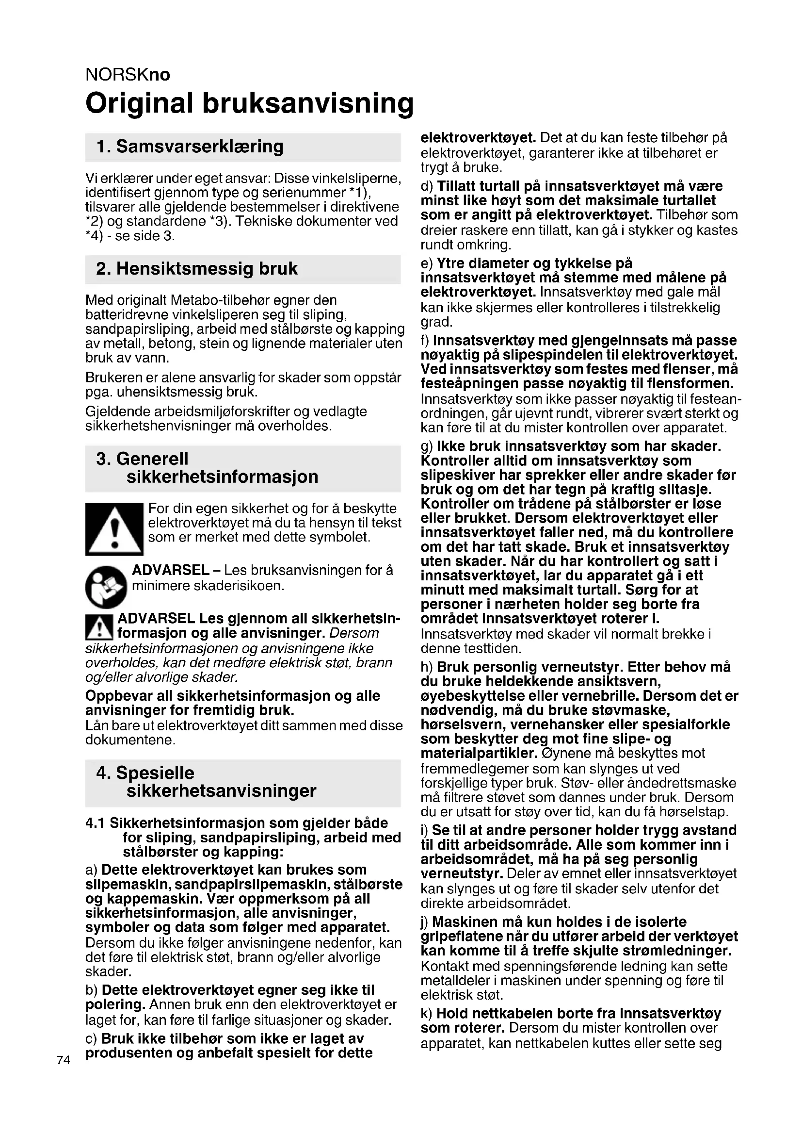 Original bruksanvisning Vi erklærer under eget ansvar: Disse vinkelsliperne, identifisert gjennom type og serienummer *1), tilsvarer alle gjeldende bestemmelser i direktivene *2) og standardene *3). Tekniske dokumenter ved *4) - se side 3. Med originalt Metabo-tilbehør egner den batteridrevne vinkelsliperen seg til sliping, sandpapirsliping, arbeid med stålbørste og kapping av metall, betong, stein og lignende materialer uten bruk av vann. Brukeren er alene ansvarlig for skader som oppstår pga. uhensiktsmessig bruk. Gjeldende arbeidsmiljøforskrifter og vedlagte sikkerhetshenvisninger må overholdes. For din egen sikkerhet og for å beskytte elektroverktøyet må du ta hensyn til tekst som er merket med dette symbolet. ADVARSEL – Les bruksanvisningen for å minimere skaderisikoen. ADVARSEL Les gjennom all sikkerhetsin- formasjon og alle anvisninger. Dersom sikkerhetsinformasjonen og anvisningene ikke overholdes, kan det medføre elektrisk støt, brann og/eller alvorlige skader. Oppbevar all sikkerhetsinformasjon og alle anvisninger for fremtidig bruk. Lån bare ut elektroverktøyet ditt sammen med disse dokumentene.