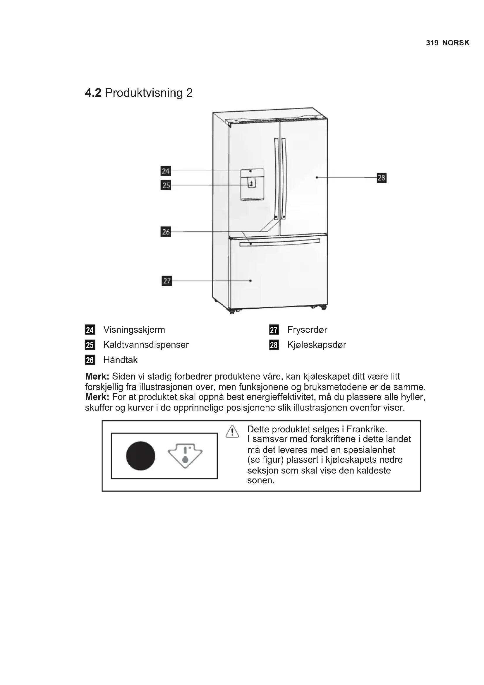 Visningsskjerm Kaldtvannsdispenser Håndtak Fryserdør Kjøleskapsdør Merk: Siden vi stadig forbedrer produktene våre, kan kjøleskapet ditt være litt forskjellig fra illustrasjonen over, men funksjonene og bruksmetodene er de samme. Merk: For at produktet skal oppnå best energieffektivitet, må du plassere alle hyller, skuffer og kurver i de opprinnelige posisjonene slik illustrasjonen ovenfor viser. Dette produktet selges i Frankrike. I samsvar med forskriftene i dette landet må det leveres med en spesialenhet (se gur) plassert i kjøleskapets nedre seksjon som skal vise den kaldeste sonen.320 www.electrolux.com