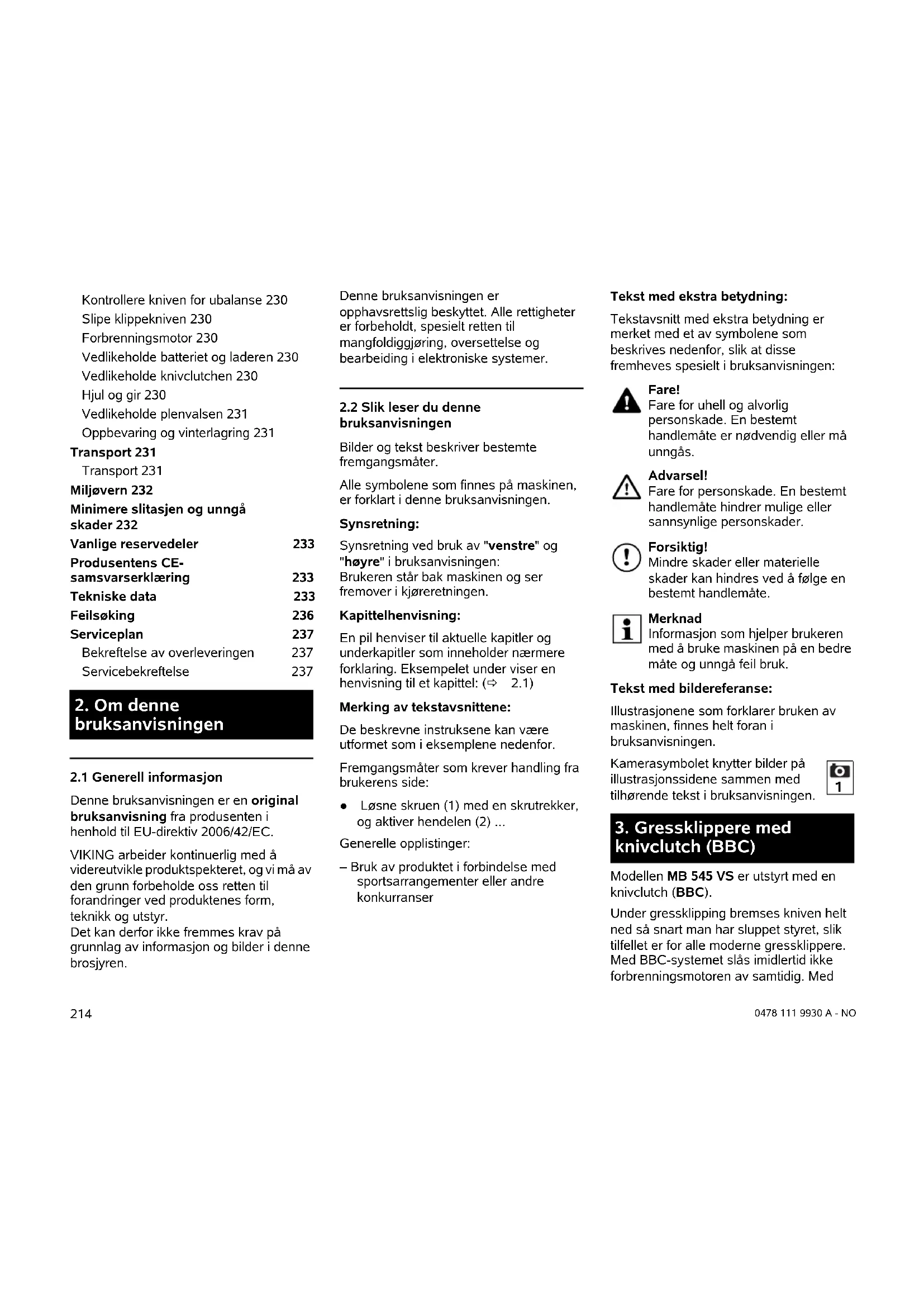 bruksanvisningen Bilder og tekst beskriver bestemte fremgangsmåter. Alle symbolene som finnes på maskinen, er forklart i denne bruksanvisningen. Synsretning: Synsretning ved bruk av "venstre" og "høyre" i bruksanvisningen: Brukeren står bak maskinen og ser fremover i kjøreretningen. Kapittelhenvisning: En pil henviser til aktuelle kapitler og underkapitler som inneholder nærmere forklaring. Eksempelet under viser en henvisning til et kapittel: (Ö 2.1) Merking av tekstavsnittene: De beskrevne instruksene kan være utformet som i eksemplene nedenfor. Fremgangsmåter som krever handling fra brukerens side: ● Løsne skruen (1) med en skrutrekker, og aktiver hendelen (2) ... Generelle opplistinger: – Bruk av produktet i forbindelse med sportsarrangementer eller andre konkurranser Tekst med ekstra betydning: Tekstavsnitt med ekstra betydning er merket med et av symbolene som beskrives nedenfor, slik at disse fremheves spesielt i bruksanvisningen: Tekst med bildereferanse: Illustrasjonene som forklarer bruken av maskinen, finnes helt foran i bruksanvisningen. Kamerasymbolet knytter bilder på illustrasjonssidene sammen med tilhørende tekst i bruksanvisningen. Modellen MB 545 VS er utstyrt med en knivclutch (BBC). Under gressklipping bremses kniven helt ned så snart man har sluppet styret, slik tilfellet er for alle moderne gressklippere. Med BBC-systemet slås imidlertid ikke forbrenningsmotoren av samtidig. Med Kontrollere kniven for ubalanse 230 Slipe klippekniven 230 Forbrenningsmotor 230 Vedlikeholde batteriet og laderen 230 Vedlikeholde knivclutchen 230 Hjul og gir 230 Vedlikeholde plenvalsen 231 Oppbevaring og vinterlagring 231 Transport 231 Transport 231 Miljøvern 232 Minimere slitasjen og unngå skader 232 Vanlige reservedeler 233 Produsentens CE- samsvarserklæring 233 Tekniske data 233 Feilsøking 236 Serviceplan 237 Bekreftelse av overleveringen 237 Servicebekreftelse 237