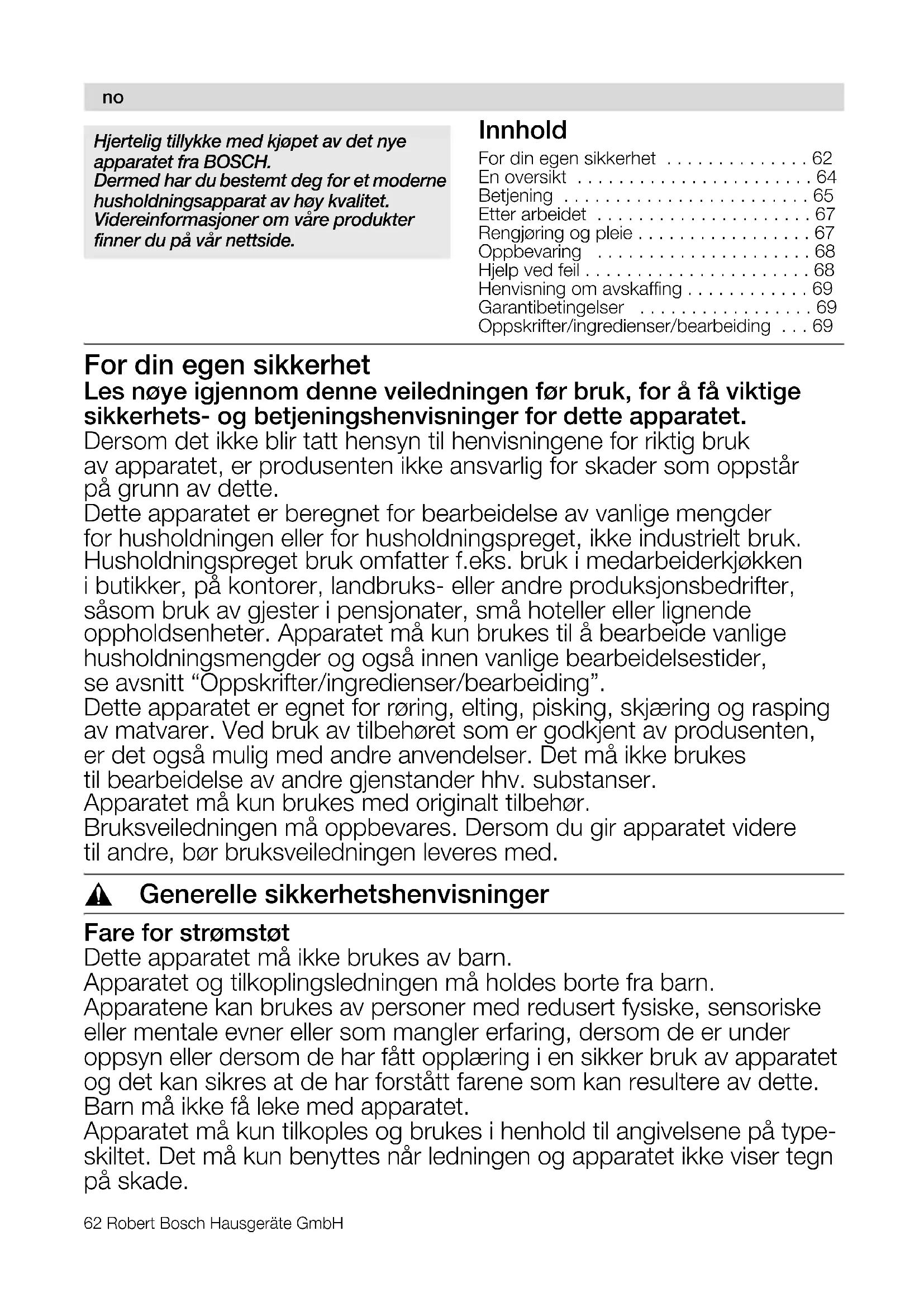 eàÉêíÉäáÖ=íáääóââÉ=ãÉÇ=âà›éÉí=~ î=ÇÉí=åóÉ= ~éé~ê~íÉí=Ñê~=_lp`eK aÉêãÉÇ= Ü~ê= Çì=ÄÉëíÉãí= ÇÉÖ= Ñçê= Éí=ãçÇÉêåÉ= ÜìëÜçäÇåáåÖë~éé~ê~í=~î=Ü›ó=âî~äáíÉíK= sáÇÉêÉ áåÑçêã~ëàçåÉê=çã=î™êÉ=éêçÇìâíÉê= ÑáååÉê=Çì=é™=î™ê=åÉííëáÇÉKRobert Bosch Hausgeräte GmbH 63 Apparatet må alltid skilles fra strømnettet når det ikke kan overvåkes og før det settes sammen, tas fra hverandre eller rengjøres. Ikke trekk ledningen over skarpe kanter eller varme flater. Dersom tilkoplingsledningen på dette apparatet er skadet, må den skiftes ut av produsenten, dens kundeservice eller av en lignende kvalifisert person for å unngå at det oppstår fare. Reparasjoner på apparatet må kun foretas av vår kundeservice. , Sikkerhetshenvisninger for dette apparatet Fare for skade Fare for strømstøt Dersom strømmen blir borte, blir apparatet innkoplet og går videre når strømmet kommer igjen. Tilbehør og verktøy må kun skiftes når apparatet står stille (dreiebryter på 0/off) og når støpselet er trukket ut. Basismaskinen må aldri dyppes ned i væsker, aldri holdes under rennende vann og ikke rengjøres i oppvaskmaskin. Før feil blir utbedret, må støpselet trekkes ut. Fare for skade på grunn av roterende verktøy! Under driften må du aldri gripe ned i bollen. For å trykke ned ingre- diensene må det alltid brukes støteren (7a). Etter utkoplingen går drevet etter i kort tid. Verktøyet må kun skiftes når drevet står stille. Fare for skade på grunn av skarpe kniver/roterende drev! Grip aldri ned i den påsatte mikseren! Mikseren arbeider kun når lokket er skrudd fast. Mikseren må kun settes på/tas av når drevet står stille. Fare for skade på grunn av skarpe kniver! Vær spesielt forsiktig når du arbeider med innsatsene! Ta hensyn til formen og plasseringen av innsatsen når den settes inn i holdeskiven. Holdeskiven hhv. pommes-frites skiven må kun tas på i de fordypningene som er beregnet for dette. Ikke grip ned i påfyllingsåpningen. For å skyve ned ingrediensene må det kun brukes støteren. Universalkniven må kun tas på ved plasthåndtaket langs kanten. Dersom den ikke er i bruk, må universalkniven alltid legges i skuffen for tilbehøret. Mikserkniven må ikke berøres med bare hender. For rengjøring bør det brukes en børste. Fare for skolding! Ved bearbeiding av varme mikseprodukter, kommer det damp ut av trakten i lokket. Fyll derfor på maksimalt 0,4 liter varm eller skummende væske. Fare for skade! Mikseren må aldri settes sammen oppå basismaskinen. no64 Robert Bosch Hausgeräte GmbH , Forklaringer av symbolene på apparatet hhv. tilbehøret Anvisninger i bruksveiledningen må følges. Vær forsiktig! Roterende kniver. Vær forsiktig! Roterende verktøy. Ikke grip ned i påfyllingsåpningen. Bruksveiledningen beskriver forskjellige utførelser, se også modelloversikt (bilde Forskjellene er kjennetegnet.Dette apparatet er vedlikeholdsfritt. En oversikt Vennligst brett ut sidene med bilder.Basismaskin Bilde 1DreiebryterA MCM41..:0/off = stop = Momentkopling med høyeste turtall, hold bryteren for ønsket miksetid fast.Trinn 1–2, arbeidshastighet: = lavt turtall – langsomt, = høyt turtall – hurtig.B MCM42..:0/off = stop = Momentkopling med høyeste turtall, hold bryteren for ønsket miksetid fast.= Arbeidshastigheten kan innstilles trinnløst fra lavt til høyt turtall.2 Driftsindikasjon (kun MCM42..)Lyser under driften (turtallsbryter på