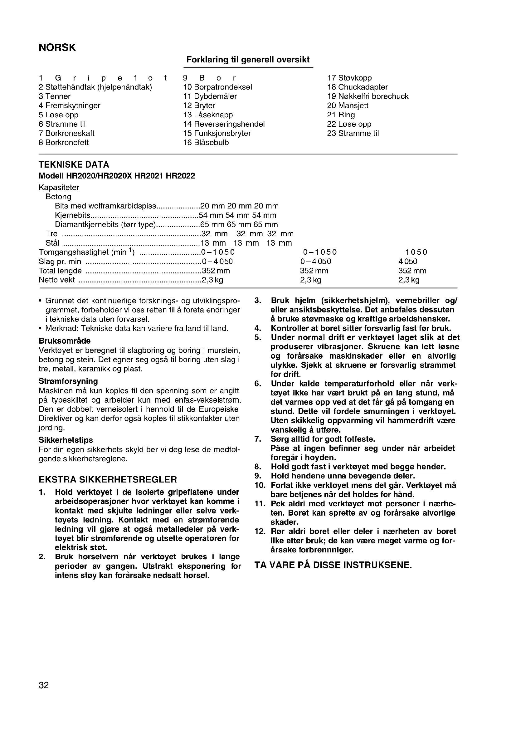 - Hullsager kan ikke brukes i dette verktøyet idet disse lett kan kile seg fast i hullet. Dette vil igjen forårsake at motorvernet aktiveres for ofte. Hammerboring Plasser boret på ønskede stad der hullet skal lages og trykk på bryteren. Øv ikke makt på verktøyet. Et lett trykk gir det beste resultatet. Hold verktøyet på plass og pass på at det ikke glir vekk fra hullet. Det må ikke legges mer trykk på verktøyet når hullet blir tilstoppet med spon og flis. Istedet bør du la verktøyet gå på tomgang og så fjerne boret delvis fra hullet. Gjør dette flere ganger til hullet er fritt for spon. Deretter fortsetter du som vanlig. NB! Det oppstår en voldsom og brå vridningskraft på verktøy/ borspiss ved gjennomboringen hvis hullet er tilstoppet med spon og lignende, eller når boret treffer armerings- stenger i betongen. Bruk alltid støttehåndtaket (hjelpe- håndtaket) og hold verktøyet godt fast i begge støttehåndtakene og bryterhåndtaket under boringen. Hvis dette ikke gjøres kan det føre til at du mister kontrol- len over verktøyet med alvorlige legemsskader til følge.34 Smøring av bortangen Før boring bør man smøre bortangen med litt fett for å oppnå smidige slag mot boret samt øke borets levetid (ca. 0,5–1g) Blåsebulb (Fig. 9) Bruk blåsebulben til rengjøring av hullet. Støvkopp (Fig. 10) Bruk støvkoppen for å hindre at støv spruter omkring og på brukeren når arbeidet foregår over hodet. Fest støv- koppen til boret som vist i fig. 10. Støvkoppen kan mon- teres på følgende borbitsstørrelser. Boring i tre eller metall (Fig. 11 og 12) Bruk det ekstra tilgjengelige borechuck-utstyret (standard tilbehør til Modell HR2020X). Se “Montering og demonte- ring av bor” som er beskrevet på foregående side når utstyret skal monteres. Hold ringen fast og drei mansjetten moturs for å åpne chuckklørne. Sett boret inn i chucken så langt det kan gå. Hold ringen godt fast og drei mansjetten medurs for å strammen chucken. Boret demonteres ved å holde ringen fast og dreie man- sjetten moturs. Still funksjonsknappen inn på “bare rota- sjon”. Det kan bores opptil 13 mm diameter i metall og opptil 32 mm i tre. NB!