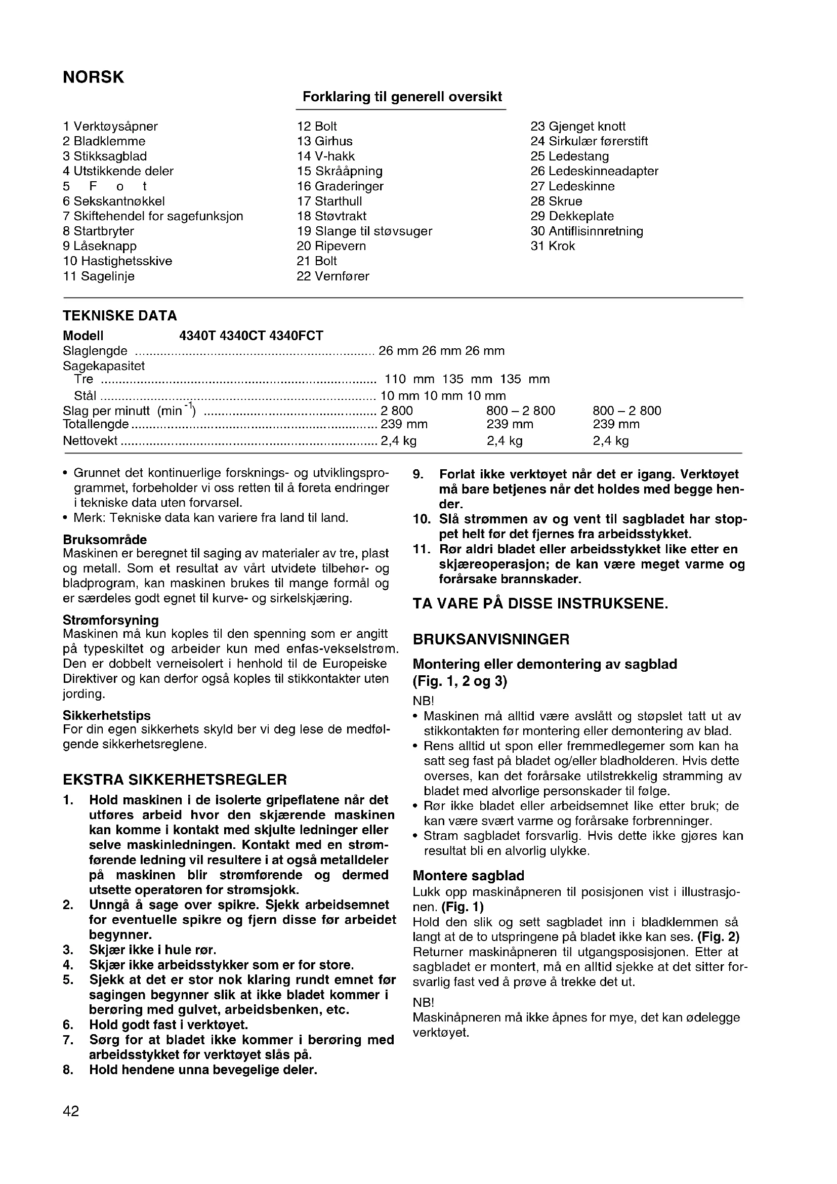- Maskinen må alltid vare avslätt og stopslet tatt ut av stikkontakten for montering eller demontering av blad.