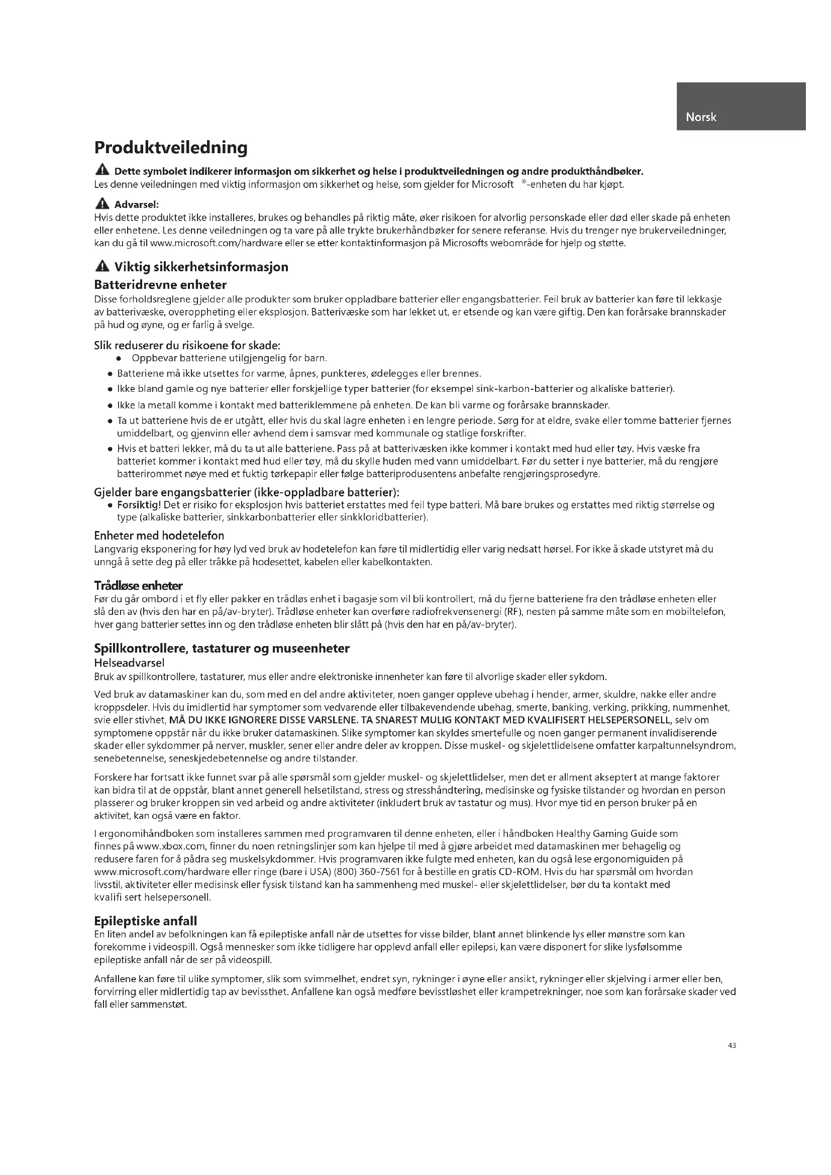 -enheten du har kjøpt. Advarsel: Hvis dette produktet ikke installeres, brukes og behandles på riktig måte, øker risikoen for alvorlig personskade eller død eller skade på enheten eller enhetene. Les denne veiledningen og ta vare på alle trykte brukerhåndbøker for senere referanse. Hvis du trenger nye brukerveiledninger, kan du gå til www.microsoft.com/hardware eller se etter kontaktinformasjon på Microsofts webområde for hjelp og støtte. Viktig sikkerhetsinformasjon Batteridrevne enheter Disse forholdsreglene gjelder alle produkter som bruker oppladbare batterier eller engangsbatterier. Feil bruk av batterier kan føre til lekkasje av batterivæske, overoppheting eller eksplosjon. Batterivæske som har lekket ut, er etsende og kan være giftig. Den kan forårsake brannskader på hud og øyne, og er farlig å svelge. Slik reduserer du risikoene for skade: ● Oppbevar batteriene utilgjengelig for barn. ● Batteriene må ikke utsettes for varme, åpnes, punkteres, ødelegges eller brennes. ● Ikke bland gamle og nye batterier eller forskjellige typer batterier (for eksempel sink-karbon-batterier og alkaliske batterier). ● Ikke la metall komme i kontakt med batteriklemmene på enheten. De kan bli varme og forårsake brannskader. ● Ta ut batteriene hvis de er utgått, eller hvis du skal lagre enheten i en lengre periode. Sørg for at eldre, svake eller tomme batterier fjernes umiddelbart, og gjenvinn eller avhend dem i samsvar med kommunale og statlige forskrifter. ● Hvis et batteri lekker, må du ta ut alle batteriene. Pass på at batterivæsken ikke kommer i kontakt med hud eller tøy. Hvis væske fra batteriet kommer i kontakt med hud eller tøy, må du skylle huden med vann umiddelbart. Før du setter i nye batterier, må du rengjøre batterirommet nøye med et fuktig tørkepapir eller følge batteriprodusentens anbefalte rengjøringsprosedyre. Gjelder bare engangsbatterier (ikke-oppladbare batterier): ● Forsiktig! Det er risiko for eksplosjon hvis batteriet erstattes med feil type batteri. Må bare brukes og erstattes med riktig størrelse og type (alkaliske batterier, sinkkarbonbatterier eller sinkkloridbatterier). Enheter med hodetelefon Langvarig eksponering for høy lyd ved bruk av hodetelefon kan føre til midlertidig eller varig nedsatt hørsel. For ikke å skade utstyret må du unngå å sette deg på eller tråkke på hodesettet, kabelen eller kabelkontakten. Trådløse enheter Før du går ombord i et fl y eller pakker en trådløs enhet i bagasje som vil bli kontrollert, må du fjerne batteriene fra den trådløse enheten eller slå den av (hvis den har en på/av-bryter). Trådløse enheter kan overføre radiofrekvensenergi (RF), nesten på samme måte som en mobiltelefon, hver gang batterier settes inn og den trådløse enheten blir slått på (hvis den har en på/av-bryter). Spillkontrollere, tastaturer og museenheter Helseadvarsel Bruk av spillkontrollere, tastaturer, mus eller andre elektroniske innenheter kan føre til alvorlige skader eller sykdom. Ved bruk av datamaskiner kan du, som med en del andre aktiviteter, noen ganger oppleve ubehag i hender, armer, skuldre, nakke eller andre kroppsdeler. Hvis du imidlertid har symptomer som vedvarende eller tilbakevendende ubehag, smerte, banking, verking, prikking, nummenhet, svie eller stivhet, MÅ DU IKKE IGNORERE DISSE VARSLENE. TA SNAREST MULIG KONTAKT MED KVALIFISERT HELSEPERSONELL, selv om symptomene oppstår når du ikke bruker datamaskinen. Slike symptomer kan skyldes smertefulle og noen ganger permanent invalidiserende skader eller sykdommer på nerver, muskler, sener eller andre deler av kroppen. Disse muskel- og skjelettlidelsene omfatter karpaltunnelsyndrom, senebetennelse, seneskjedebetennelse og andre tilstander. Forskere har fortsatt ikke funnet svar på alle spørsmål som gjelder muskel- og skjelettlidelser, men det er allment akseptert at mange faktorer kan bidra til at de oppstår, blant annet generell helsetilstand, stress og stresshåndtering, medisinske og fysiske tilstander og hvordan en person plasserer og bruker kroppen sin ved arbeid og andre aktiviteter (inkludert bruk av tastatur og mus). Hvor mye tid en person bruker på en aktivitet, kan også være en faktor. I ergonomihåndboken som installeres sammen med programvaren til denne enheten, eller i håndboken Healthy Gaming Guide som fi nnes på www.xbox.com, fi nner du noen retningslinjer som kan hjelpe til med å gjøre arbeidet med datamaskinen mer behagelig og redusere faren for å pådra seg muskelsykdommer. Hvis programvaren ikke fulgte med enheten, kan du også lese ergonomiguiden på www.microsoft.com/hardware eller ringe (bare i USA) (800) 360-7561 for å bestille en gratis CD-ROM. Hvis du har spørsmål om hvordan livsstil, aktiviteter eller medisinsk eller fysisk tilstand kan ha sammenheng med muskel- eller skjelettlidelser, bør du ta kontakt med kvalifi sert helsepersonell. Epileptiske anfall En liten andel av befolkningen kan få epileptiske anfall når de utsettes for visse bilder, blant annet blinkende lys eller mønstre som kan forekomme i videospill. Også mennesker som ikke tidligere har opplevd anfall eller epilepsi, kan være disponert for slike lysfølsomme epileptiske anfall når de ser på videospill. Anfallene kan føre til ulike symptomer, slik som svimmelhet, endret syn, rykninger i øyne eller ansikt, rykninger eller skjelving i armer eller ben, forvirring eller midlertidig tap av bevissthet. Anfallene kan også medføre bevisstløshet eller krampetrekninger, noe som kan forårsake skader ved fall eller sammenstøt. Norsk44 Hvis du opplever noen av disse symptomene, må du straks slutte å spille og kontakte lege. Foreldre bør spørre om barna opplever symptomene ovenfor – barn og unge er mer utsatt for slike anfall enn voksne. Du kan redusere risikoen for lysfølsomme epileptiske anfall ved å ta disse forholdsreglene: ● Øk avstanden til TV-skjermen. ● Bruk en mindre TV-skjerm. ● Sørg fo