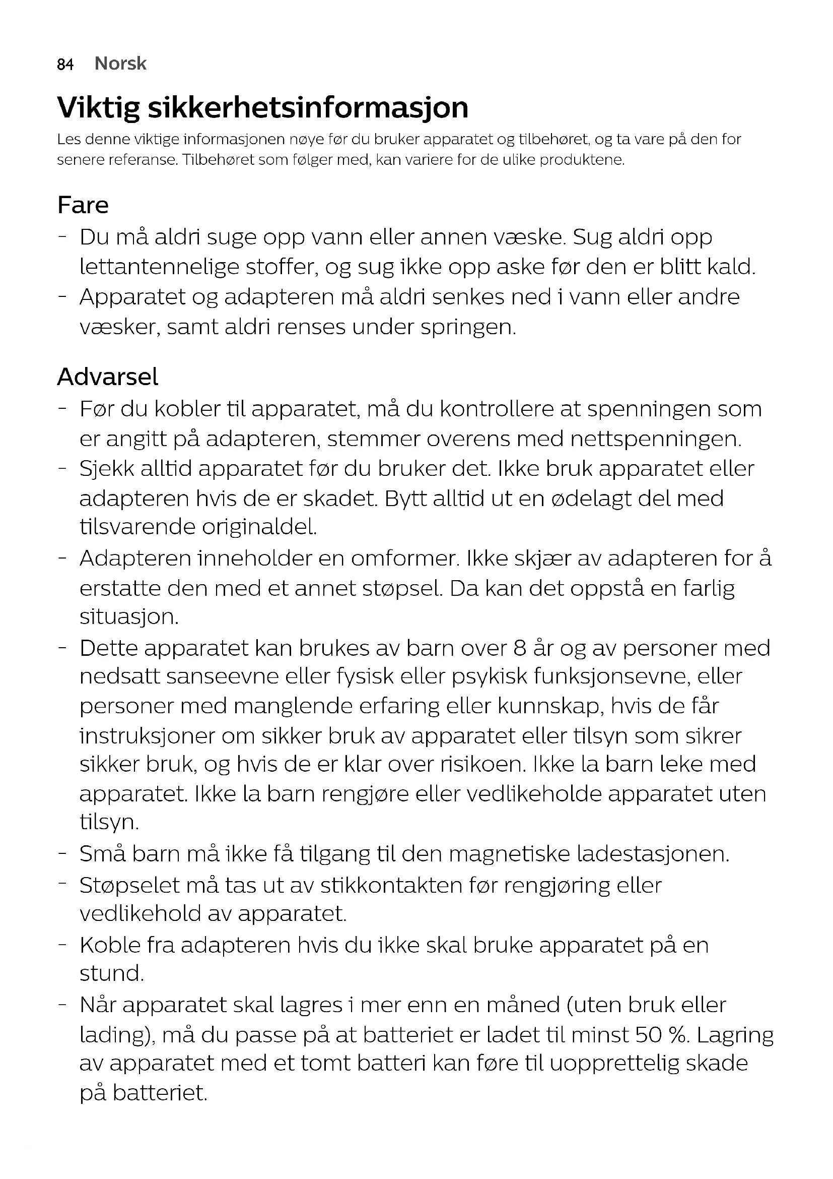 Når apparatet skal lagres i mer enn en måned (uten bruk eller lading), må du passe på at batteriet er ladet til minst 50 %. Lagring av apparatet med et tomt batteri kan føre til uopprettelig skade på batteriet.85 Norsk