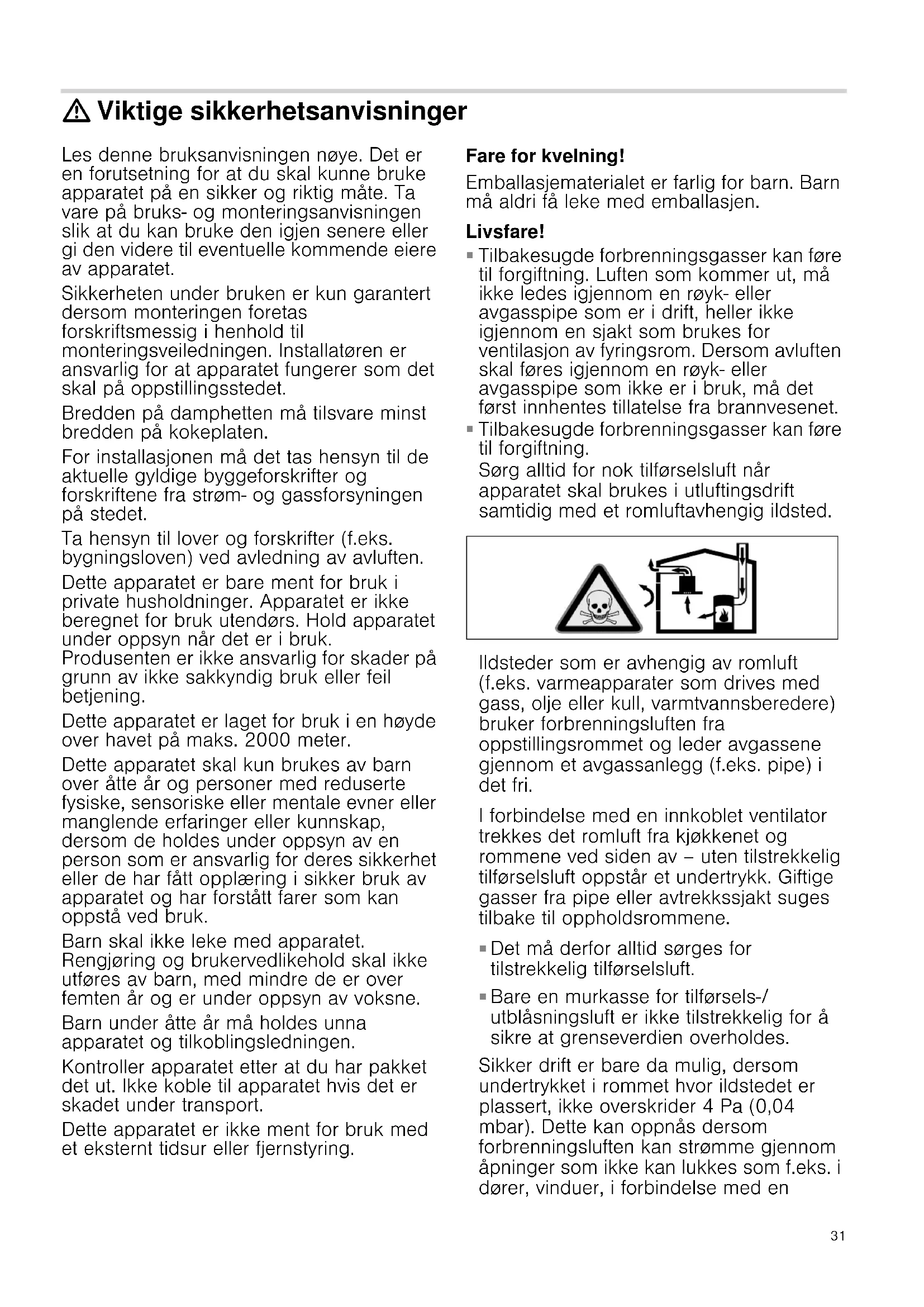 Tilbakesugde forbrenningsgasser kan føre til forgiftning. Sørg alltid for nok tilførselsluft når apparatet skal brukes i utluftingsdrift samtidig med et romluftavhengig ildsted. Ildsteder som er avhengig av romluft (f.eks. varmeapparater som drives med gass, olje eller kull, varmtvannsberedere) bruker forbrenningsluften fra oppstillingsrommet og leder avgassene gjennom et avgassanlegg (f.eks. pipe) i det fri. I forbindelse med en innkoblet ventilator trekkes det romluft fra kjøkkenet og rommene ved siden av – uten tilstrekkelig tilførselsluft oppstår et undertrykk. Giftige gasser fra pipe eller avtrekkssjakt suges tilbake til oppholdsrommene.