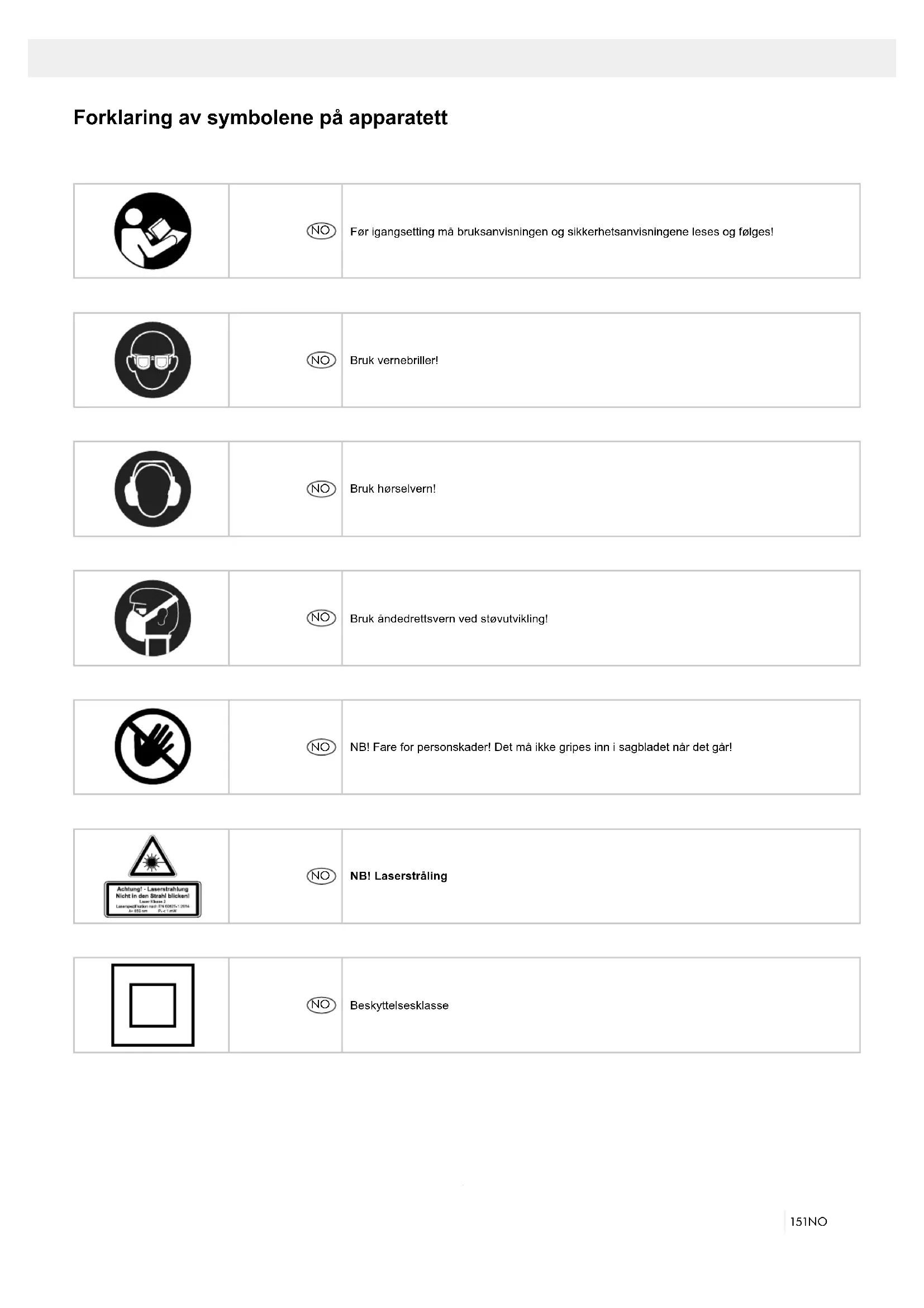 Bruk åndedrettsvern ved støvutvikling! Forklaring av symbolene på apparatett152 NO