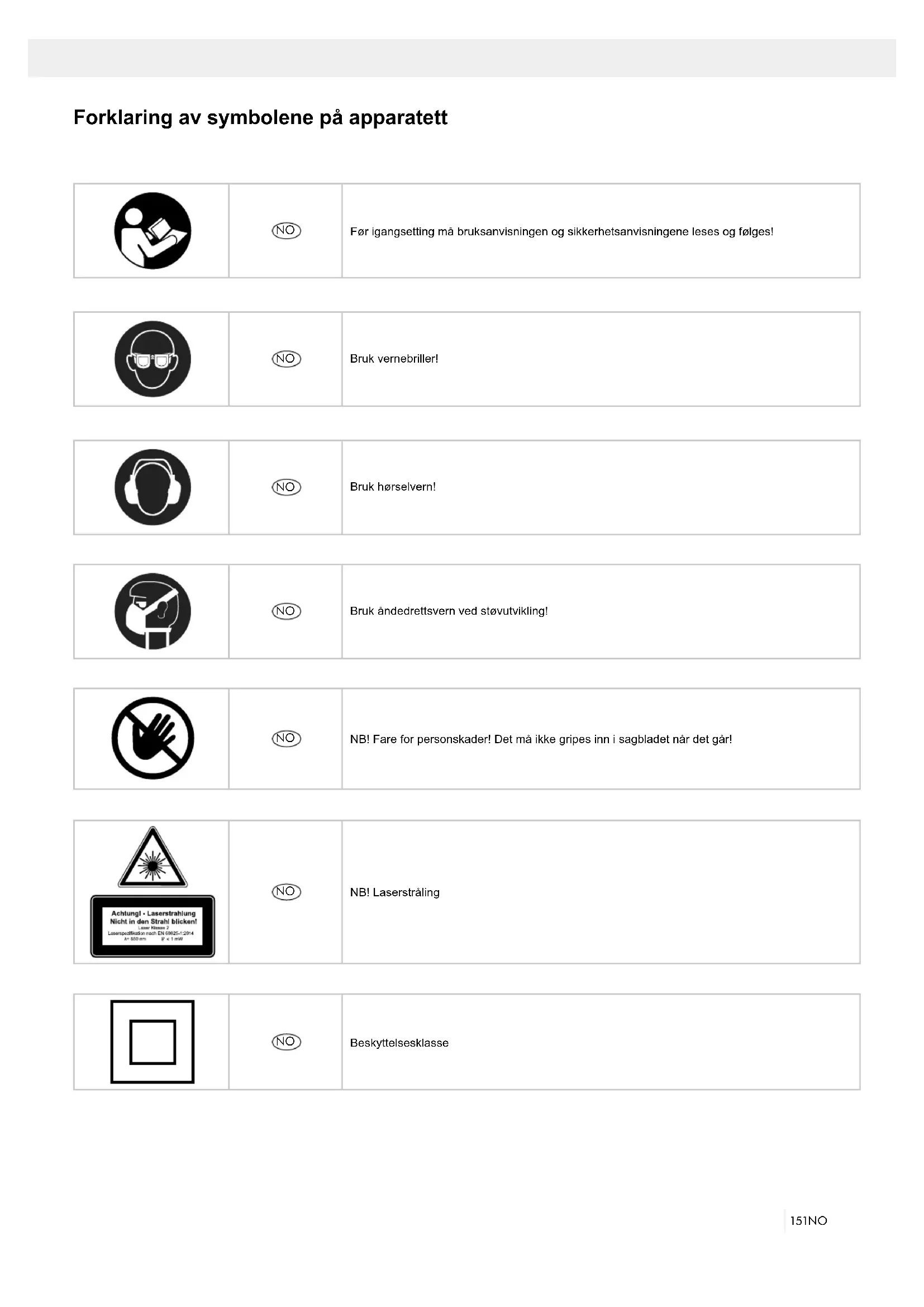 SAGBLADER 1 Bruk kun innsatsverktøy, når du behersker bruken av det. 2 Vær oppmerksom på maksimalt turtall. Det maksi- male turtallet som er angitt på innsatsverktøyet må ikke overskrides. Overhold turtallområdet dersom angitt. 3 Vær oppmerksom på motor-, sagblad-, dreieretnin- gen. 4 Ikke benytt innsatsverktøy med riper. Skift ut ripete innsatsverktøy. En reparasjon er ikke tillatt. 5 Rengjør spennaten for smuss, fett, olje og vann. 6 Ikke benytt løse reduksjonsringer eller -hylser til re- duksjon av boringer ved sirkelsagblader. 7 Vær oppmerksom på, at faste reduksjonsringer må ha den samme diameteren og minst 1/3 av kuttdia- meteren, for å sikre innsatsverktøyet. 8 Forsikre deg om at de faste reduksjonsringene er parallelle med hverandre. 9 Håndter innsatsverktøyet forsiktig. Det er best å opp- bevare det i original forpakningen eller i en spesiell beholder. Bruk vernehansker for å forbedre gripe- sikkerheten og redusere risikoen for personskader. 10 Forsikre deg om at beskyttelsesinnretninger er fes- tet forskriftsmessig, før bruken av innsatsverktøyet. 11 Før anvendelsen må du forsikre deg om at inn- satsverktøyet som du bruker, tilsvarer de tekniske kravene til dette elektroverktøyet og er forskrifts- messig festet. 12 Benytt det medfølgende sagbladet kun til sagarbei- der i tre, og aldri til bearbeiding av metall. NB: Laserstråling Ikke se inn i strålen Laserklasse 2