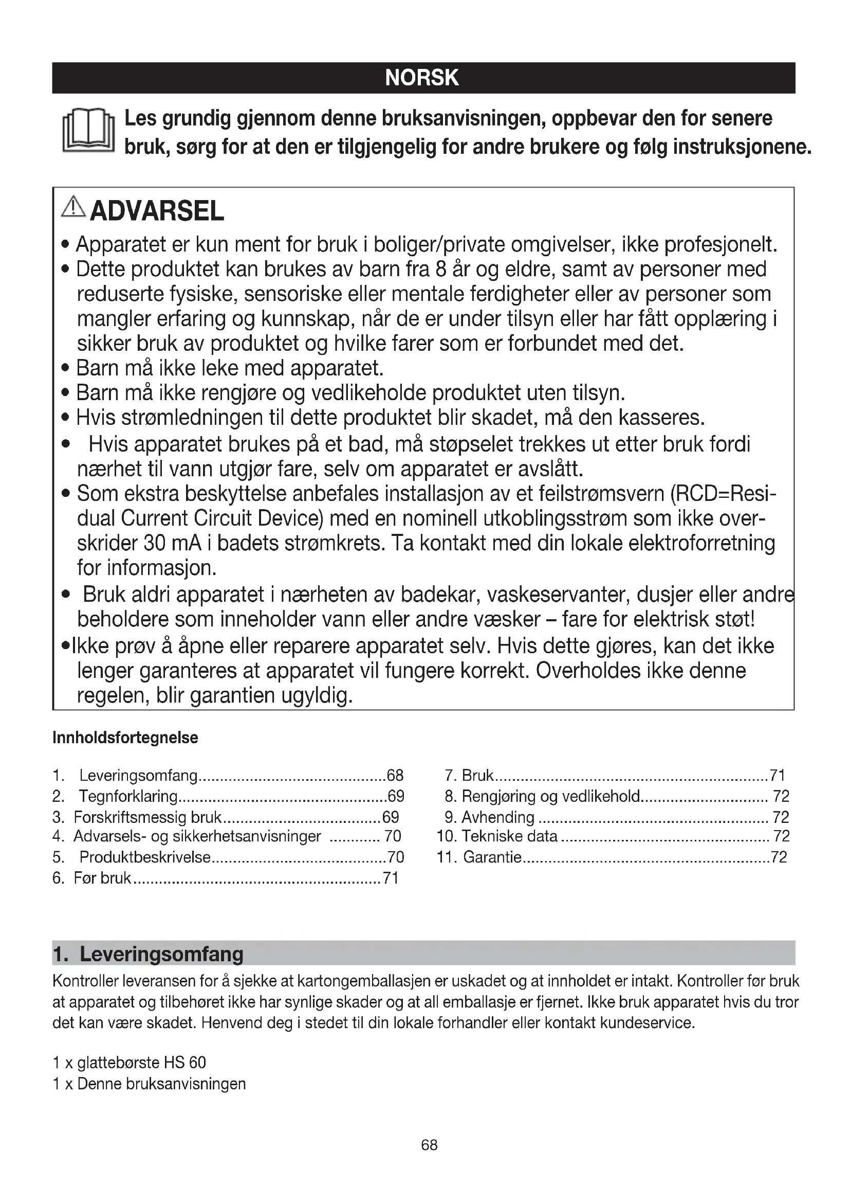 Kontroller leveransen for å sjekke at kartongemballasjen er uskadet og at innholdet er intakt. Kontroller før bruk at apparatet og tilbehøret ikke har synlige skader og at all emballasje er fjernet. Ikke bruk apparatet hvis du tror det kan være skadet. Henvend deg i stedet til din lokale forhandler eller kontakt kundeservice. 1 x glattebørste HS 60 1 x Denne bruksanvisningen69