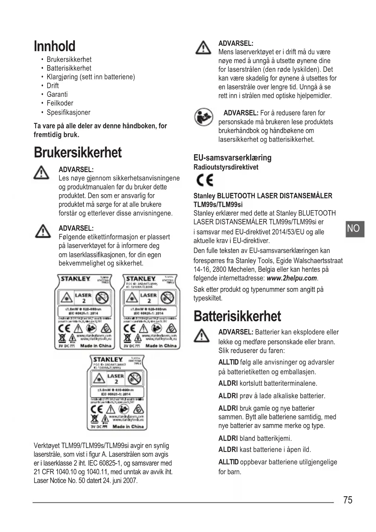 TLM99si Verktøyet TLM99/TLM99s/TLM99si avgir en synlig laserstråle, som vist i figur A. Laserstrålen som avgis er i laserklasse 2 iht. IEC 60825-1, og samsvarer med 21 CFR 1040.10 og 1040.11, med unntak av avvik iht. Laser Notice No. 50 datert 24. juni 2007.ADVARSEL:Mens laserverktøyet er i drift må du være nøye med å unngå å utsette øynene dine for laserstrålen (den røde lyskilden). Det kan være skadelig for øynene å utsettes for en laserstråle over lengre tid. Unngå å se rett inn i strålen med optiske hjelpemidler. ADVARSEL: For å redusere faren for personskade må brukeren lese produktets brukerhåndbok og håndbøkene om lasersikkerhet og batterisikkerhet. EU-samsvarserklæring RadioutstyrsdirektivetStanley BLUETOOTH LASER DISTANSEMÅLERTLM99s/TLM99siStanley erklærer med dette at Stanley BLUETOOTH LASER DISTANSEMÅLER TLM99s/TLM99si er i samsvar med EU-direktivet 2014/53/EU og alle aktuelle krav i EU-direktiver.Den fulle teksten av EU-samsvarserklæringen kan forespørres fra Stanley Tools, Egide Walschaertsstraat 14-16, 2800 Mechelen, Belgia eller kan hentes på følgende internettadresse: www.2helpu.com.Søk etter produkt og typenummer som angitt på typeskiltet. Batterisikkerhet ADVARSEL: Batterier kan eksplodere eller lekke og medføre personskade eller brann. Slik reduserer du faren:ALLTID følg alle anvisninger og advarsler på batterietiketten og emballasjen. ALDRI kortslutt batteriterminalene. ALDRI prøv å lade alkaliske batterier.ALDRI bruk gamle og nye batterier sammen. Bytt alle batteriene samtidig, med nye batterier av samme merke og type.ALDRI bland batterikjemi.ALDRI kast batteriene i åpen ild.ALLTID oppbevar batteriene utilgjengelige for barn.NO