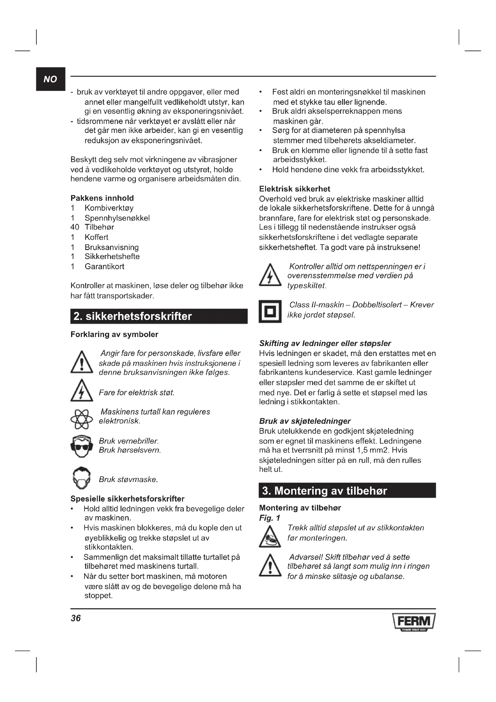 - Fest Kombiverktøy til opphengsbraketten på holderen. Opphengsbraketten kan dreies 360°. Tilbehør til Kombiverktøy Ferm leverer ikke eget tilbehør til Kombiverktøy. Kombiverktøy er konstruert for å bruke standardtilbehør fra Dremel®, Black & Decker®, Bosch® eller Proxion®. Før De bruker tilbehøret bør De alltid sjekke om tillatt turtall på tilbehøret er egnet til Kombiverktøys høyeste hastighet. Slipestein Fig. 3 Når De bruker slipesteinene for første gang bør De bruke brynesteinen for å utbalansere slipesteinen. Brynesteinen kan også brukes for å gi slipesteinen en særegen from. Material Hastighet Stein, skjell - Stål + Aluminium, messing + - Plast - Filtskiver og tipp Filttibehøret skal monteres på aksene som følger med. Fig. 4 Material Hastighet Stål + Aluminium, messing + - Plast + Pussebånd og pusseskiver Fig. 5 Material Hastighet Tre + + Stål - Aluminium, messing + - Plast - Børster i rustfritt stål og børster som ikke er av metall Fig. 6 Material Hastighet Stein, skjell + - Aluminium, messing + -NO