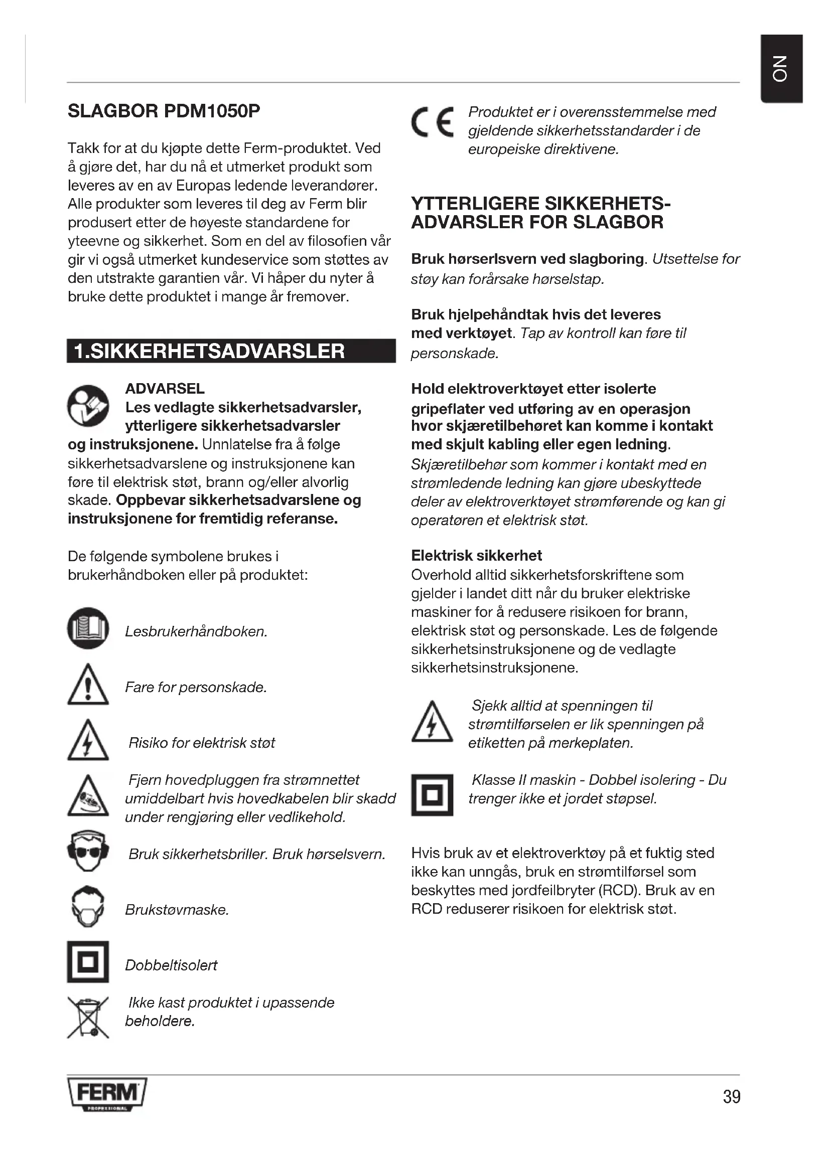 Takk for at du kjøpte dette Ferm-produktet. Ved å gjøre det, har du nå et utmerket produkt som leveres av en av Europas ledende leverandører. Alle produkter som leveres til deg av Ferm blir produsert etter de høyeste standardene for yteevne og sikkerhet. Som en del av filosofien vår gir vi også utmerket kundeservice som støttes av den utstrakte garantien vår. Vi håper du nyter å bruke dette produktet i mange år fremover.