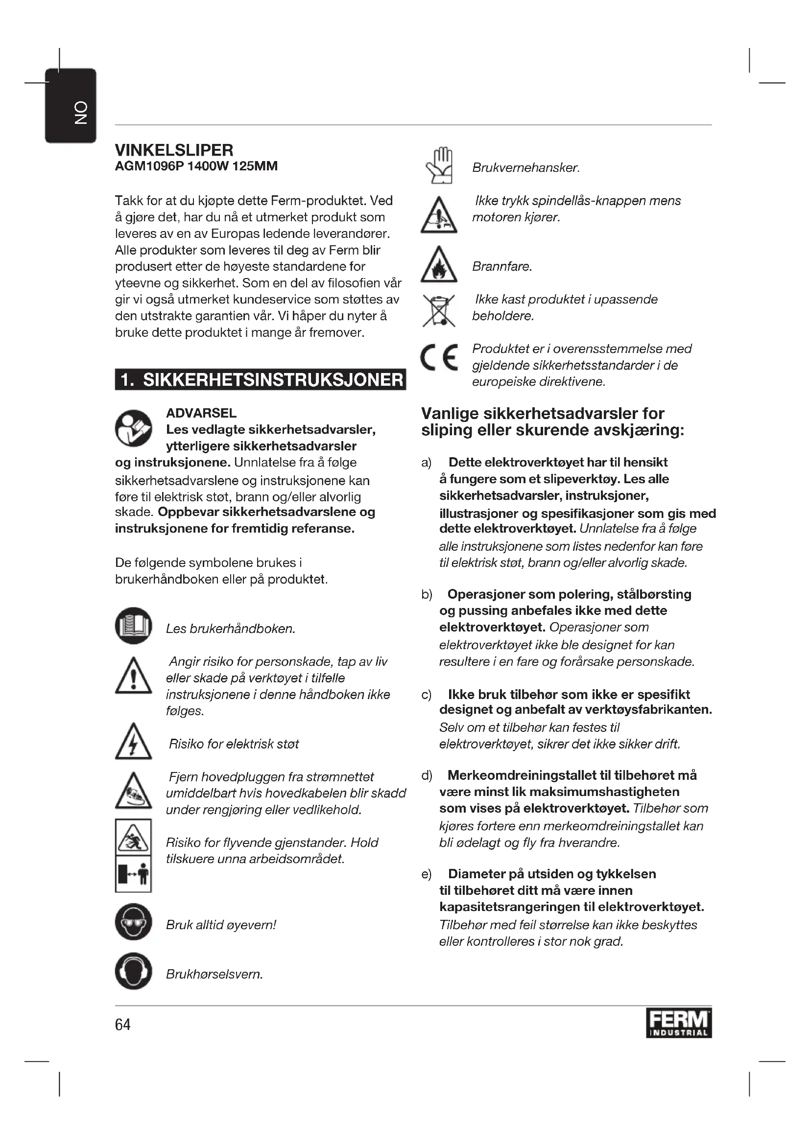 ADVARSEL Les vedlagte sikkerhetsadvarsler, ytterligere sikkerhetsadvarsler og instruksjonene. Unnlatelse fra å følge sikkerhetsadvarslene og instruksjonene kan føre til elektrisk støt, brann og/eller alvorlig skade. Oppbevar sikkerhetsadvarslene og instruksjonene for fremtidig referanse. De følgende symbolene brukes i brukerhåndboken eller på produktet. Les brukerhåndboken. Angir risiko for personskade, tap av liv eller skade på verktøyet i tilfelle instruksjonene i denne håndboken ikke følges. Risiko for elektrisk støt Fjern hovedpluggen fra strømnettet umiddelbart hvis hovedkabelen blir skadd under rengjøring eller vedlikehold. Risiko for flyvende gjenstander. Hold tilskuere unna arbeidsområdet. Bruk alltid øyevern! Bruk hørselsvern. Bruk vernehansker. Ikke trykk spindellås-knappen mens motoren kjører. Brannfare. Ikke kast produktet i upassende beholdere. Produktet er i overensstemmelse med gjeldende sikkerhetsstandarder i de europeiske direktivene. Vanlige sikkerhetsadvarsler for sliping eller skurende avskjæring: a) Dette elektroverktøyet har til hensikt å fungere som et slipeverktøy. Les alle sikkerhetsadvarsler, instruksjoner, illustrasjoner og spesikasjoner som gis med dette elektroverktøyet. Unnlatelse fra å følge alle instruksjonene som listes nedenfor kan føre til elektrisk støt, brann og/eller alvorlig skade. b) Operasjoner som polering, stålbørsting og pussing anbefales ikke med dette elektroverktøyet. Operasjoner som elektroverktøyet ikke ble designet for kan resultere i en fare og forårsake personskade. c) Ikke bruk tilbehør som ikke er spesikt designet og anbefalt av verktøysfabrikanten. Selv om et tilbehør kan festes til elektroverktøyet, sikrer det ikke sikker drift. d) Merkeomdreiningstallet til tilbehøret må være minst lik maksimumshastigheten som vises på elektroverktøyet. Tilbehør som kjøres fortere enn merkeomdreiningstallet kan bli ødelagt og y fra hverandre. e) Diameter på utsiden og tykkelsen til tilbehøret ditt må være innen kapasitetsrangeringen til elektroverktøyet. Tilbehør med feil størrelse kan ikke beskyttes eller kontrolleres i stor nok grad.65