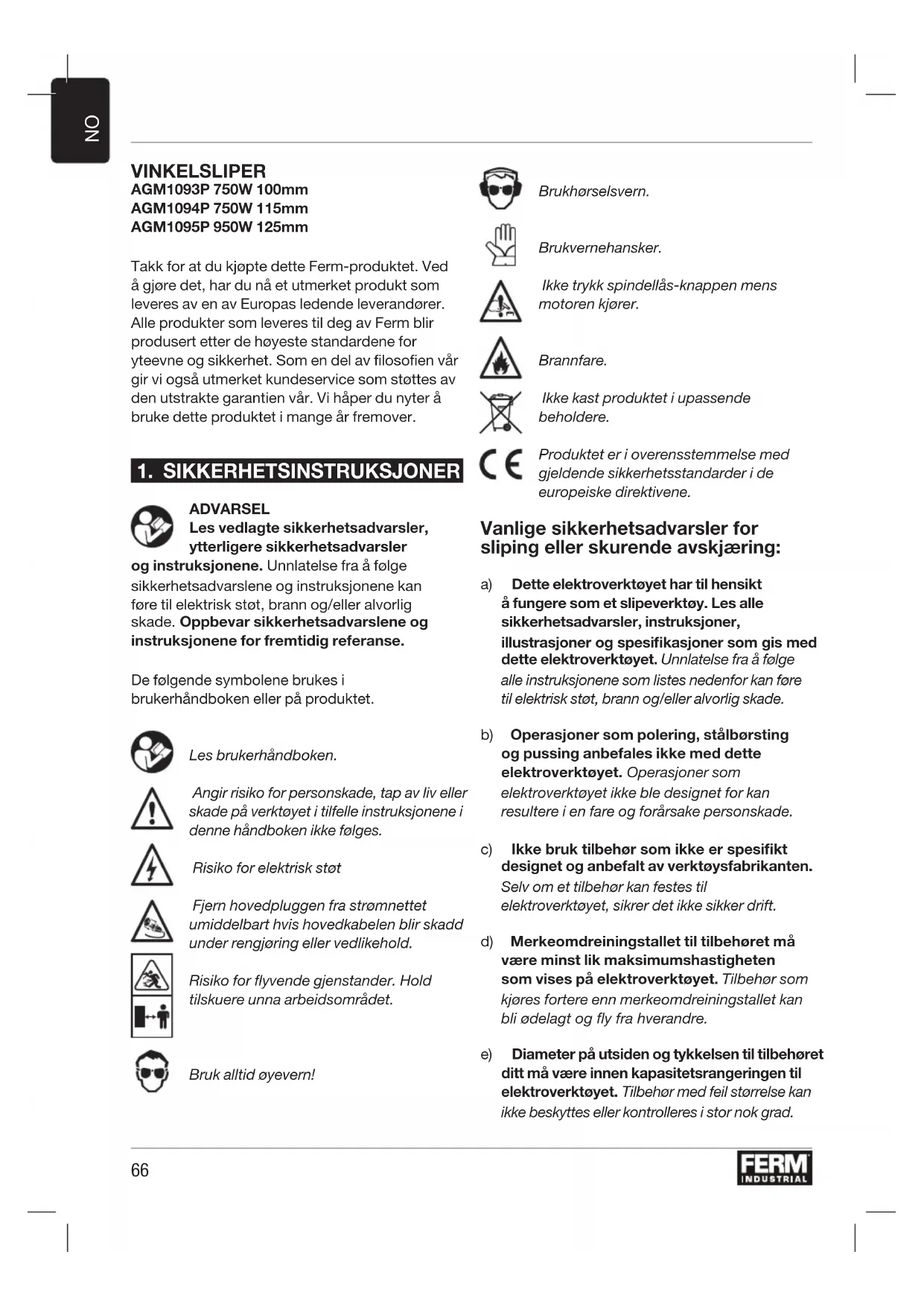 VINKELSLIPER AGM1093P 750W 100mm AGM1094P 750W 115mm AGM1095P 950W 125mm Takk for at du kjøpte dette Ferm-produktet. Ved å gjøre det, har du nå et utmerket produkt som leveres av en av Europas ledende leverandører. Alle produkter som leveres til deg av Ferm blir produsert etter de høyeste standardene for yteevne og sikkerhet. Som en del av filosofien vår gir vi også utmerket kundeservice som støttes av den utstrakte garantien vår. Vi håper du nyter å bruke dette produktet i mange år fremover.